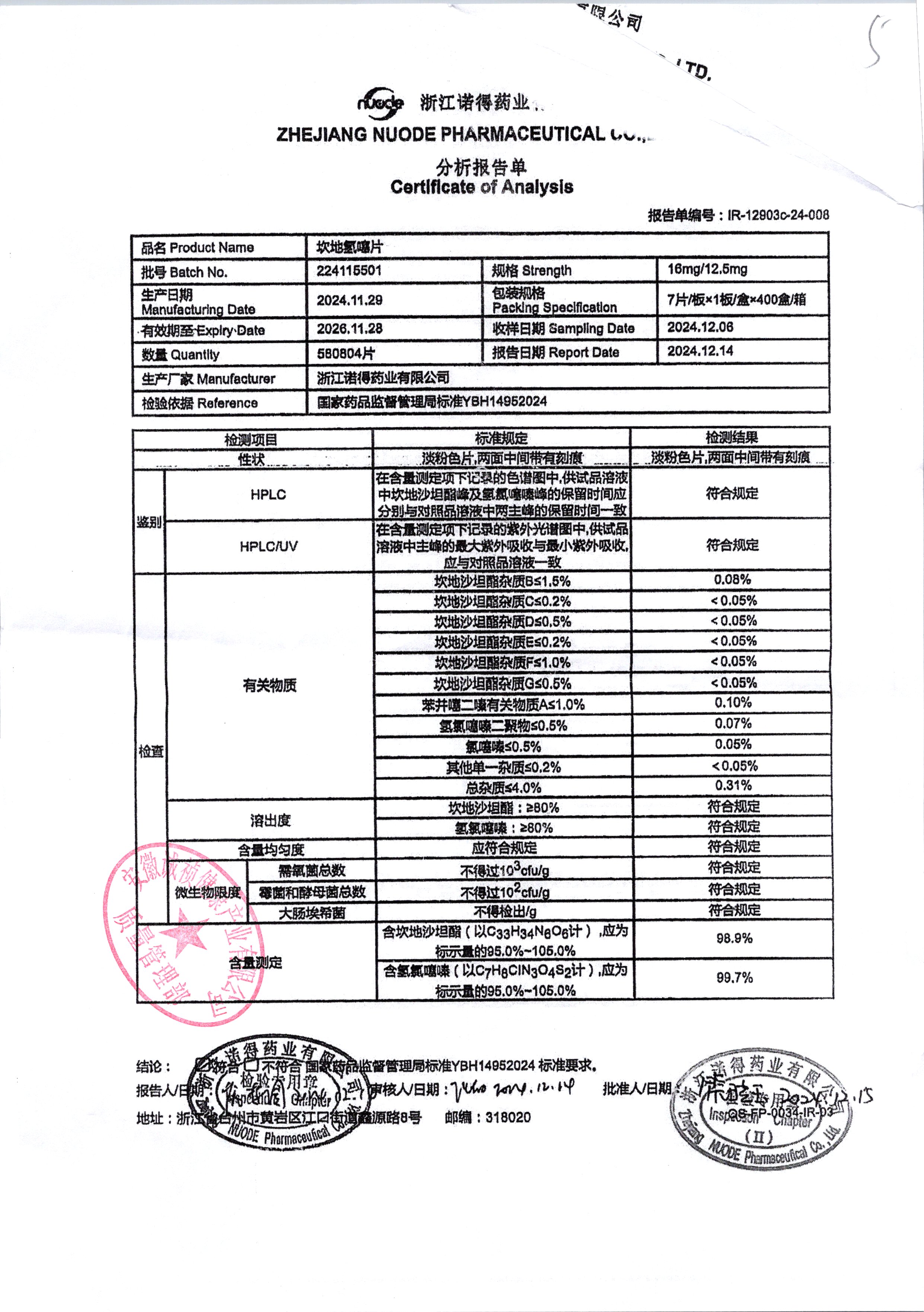 坎地氫噻片 16mg*12.5mg 224115501 查看詳情