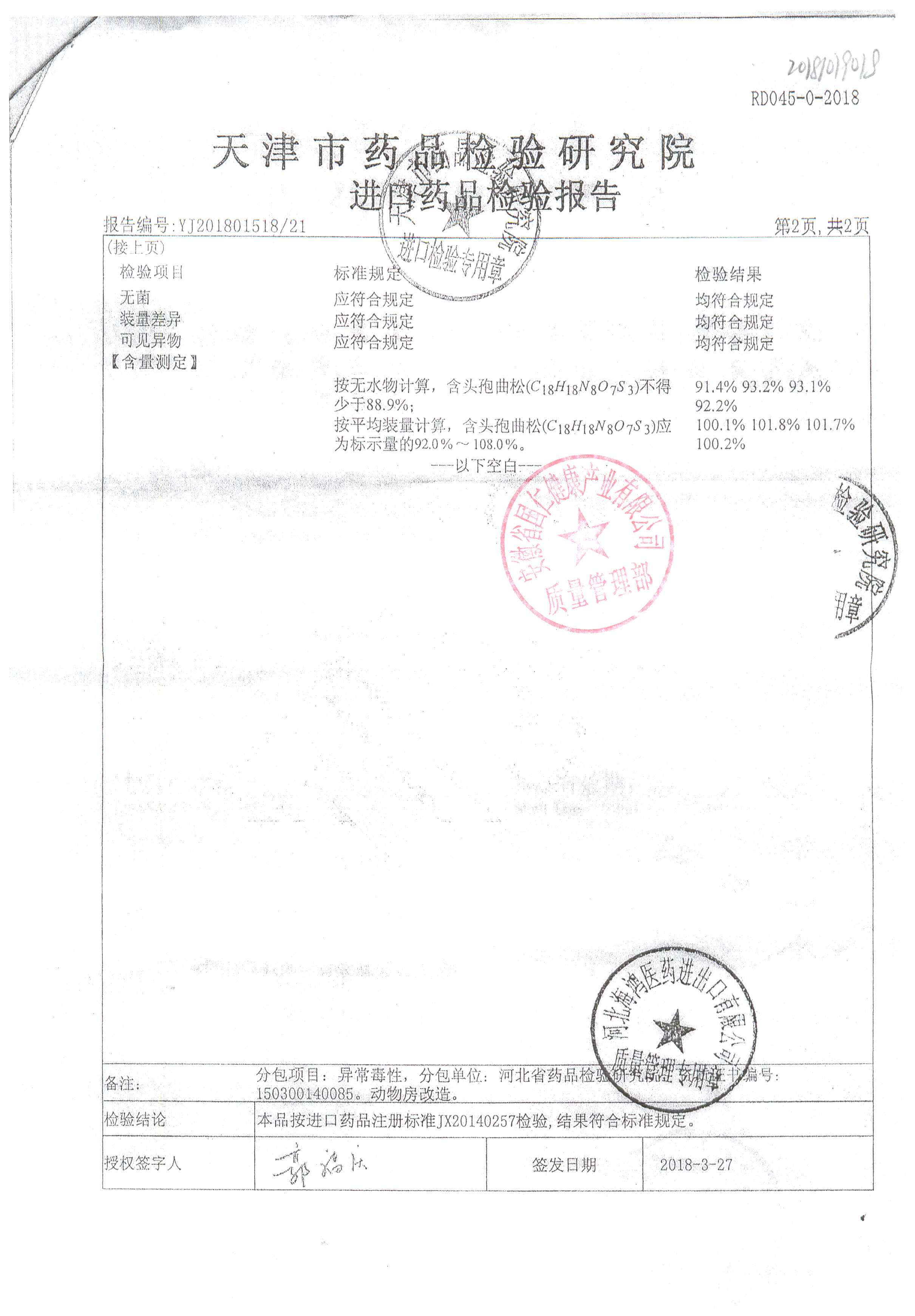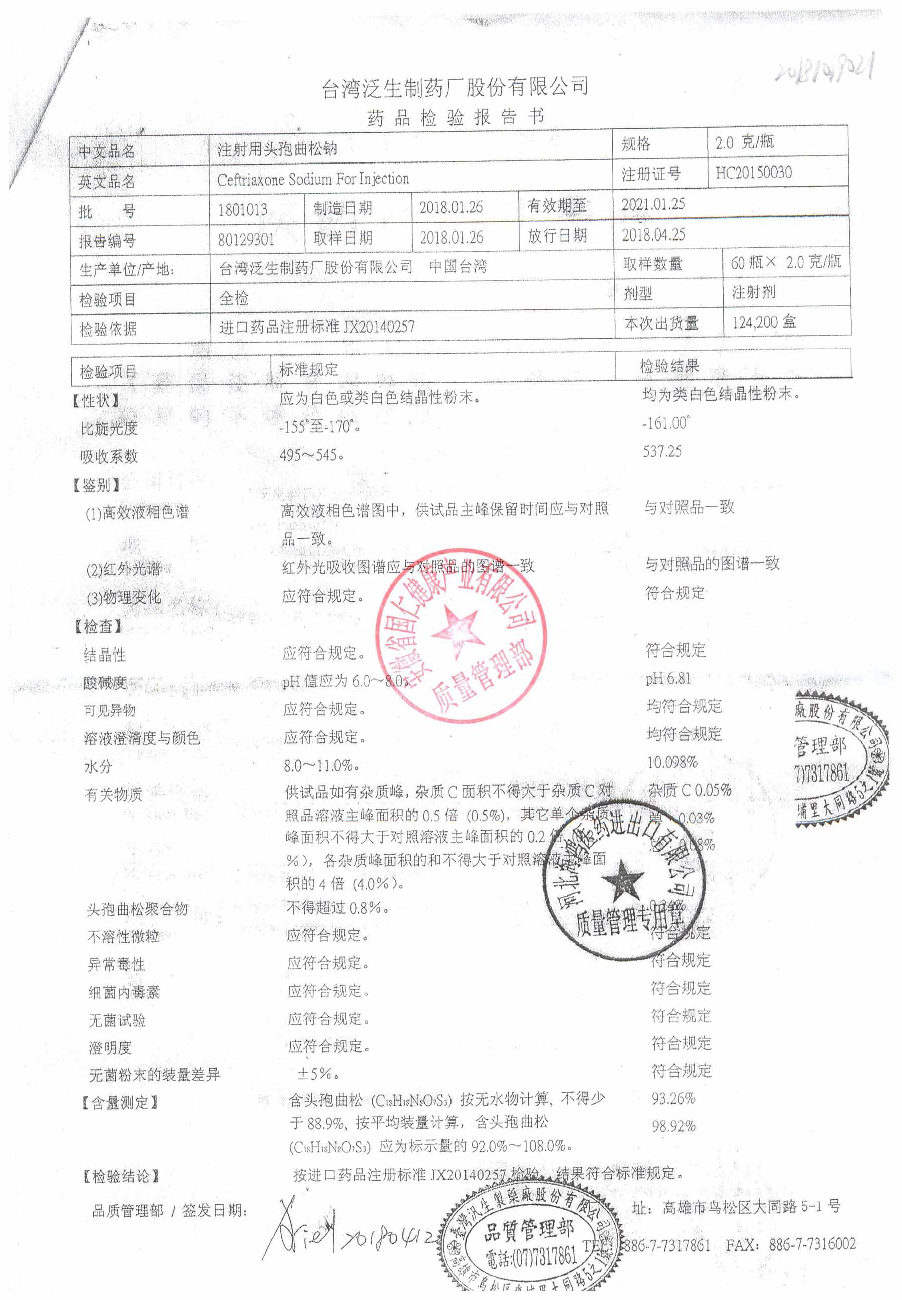 注射用頭孢曲松鈉 | 2.0g | 1801013(1/3) | 查看詳情 |