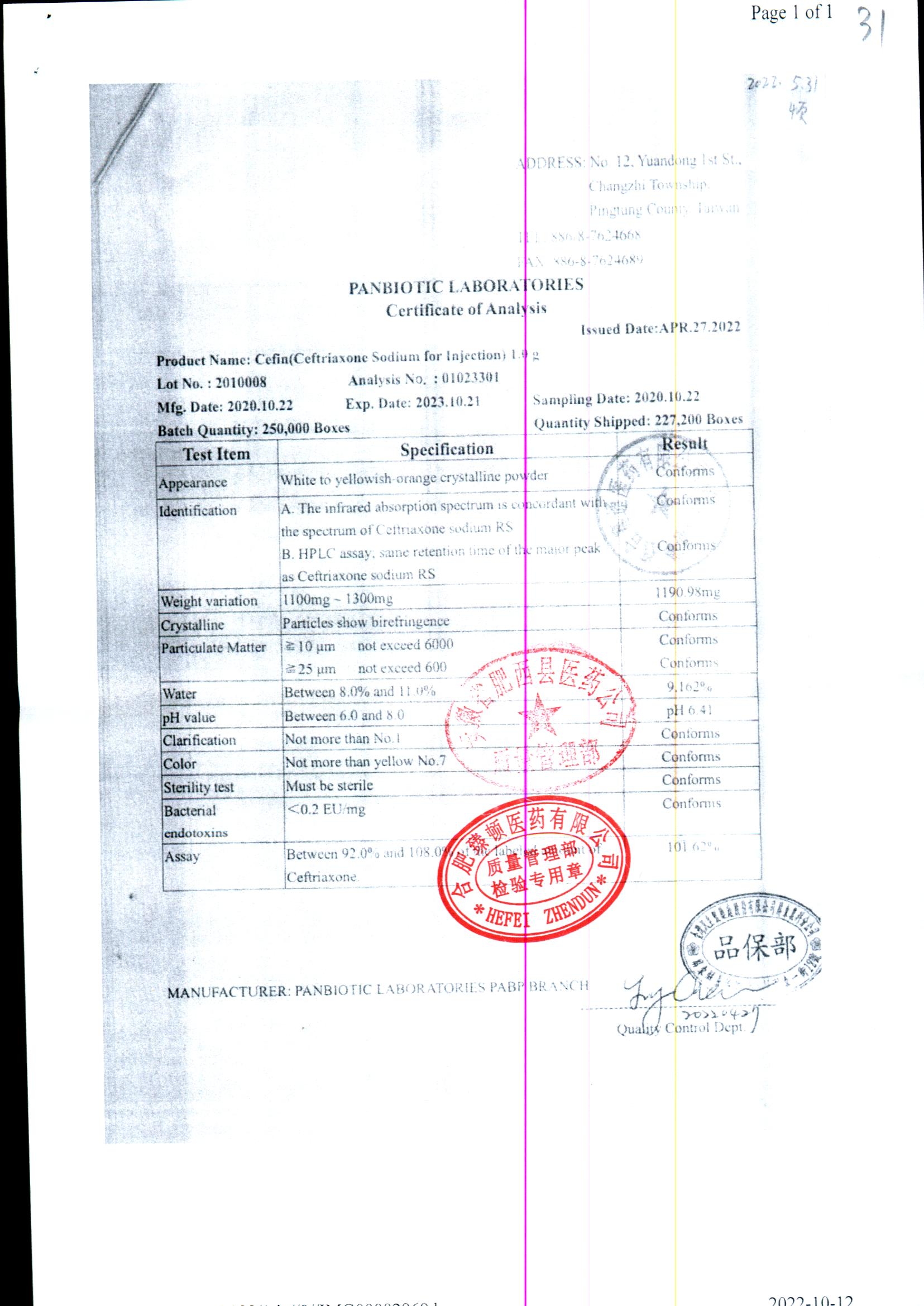 注射用頭孢曲松鈉 | 2.0g | 1903007(3/5) | 查看詳情 |
