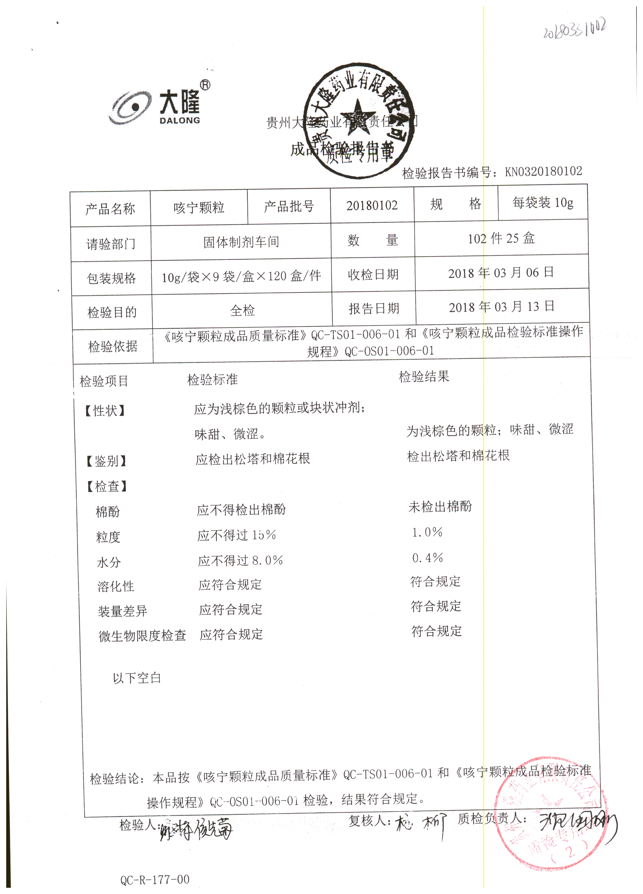 咳寧顆粒 | 10g*9袋 | 20180102 | 查看詳情 |