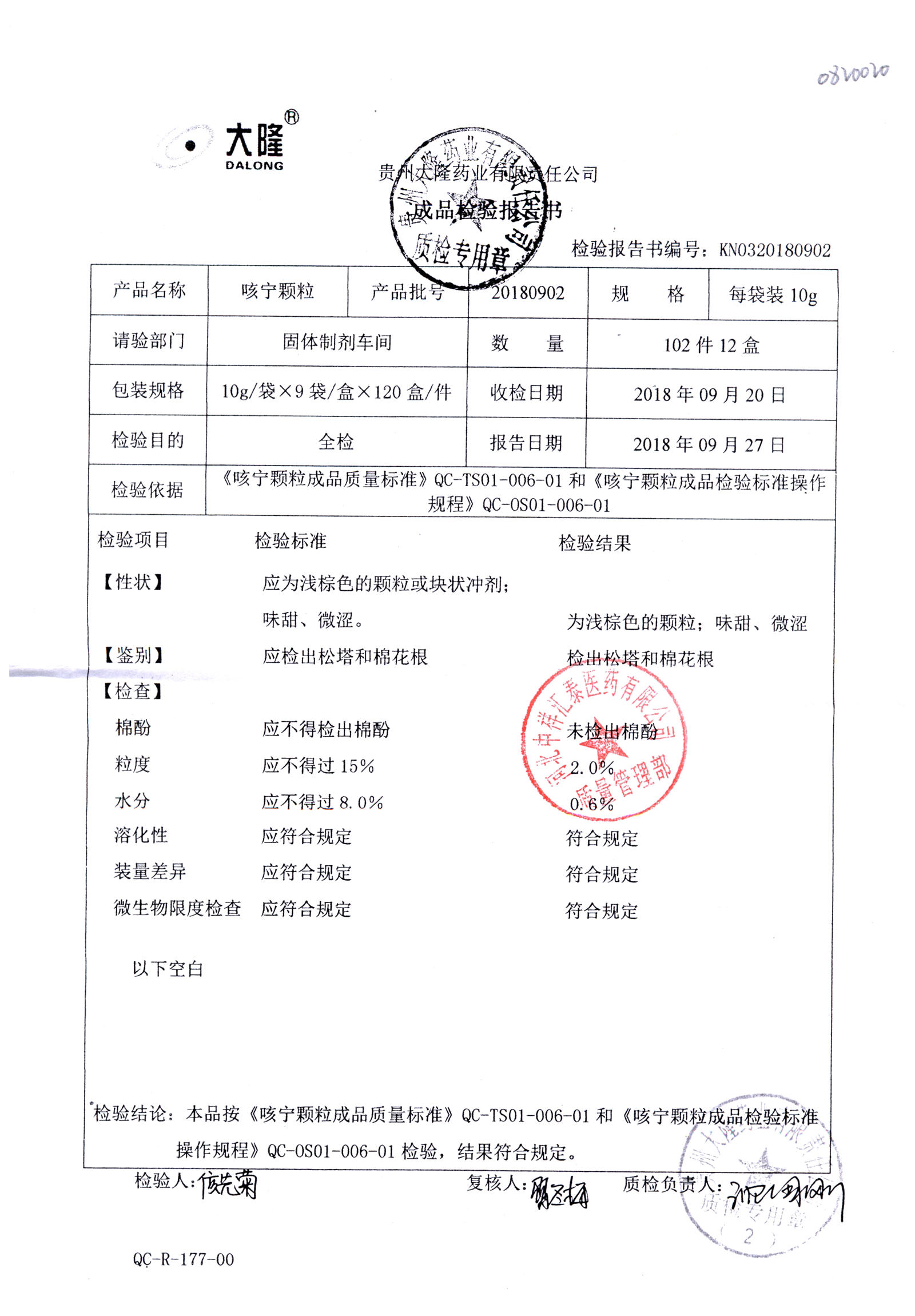 咳寧顆粒 | 10g*9袋 | 20180902 | 查看詳情 |