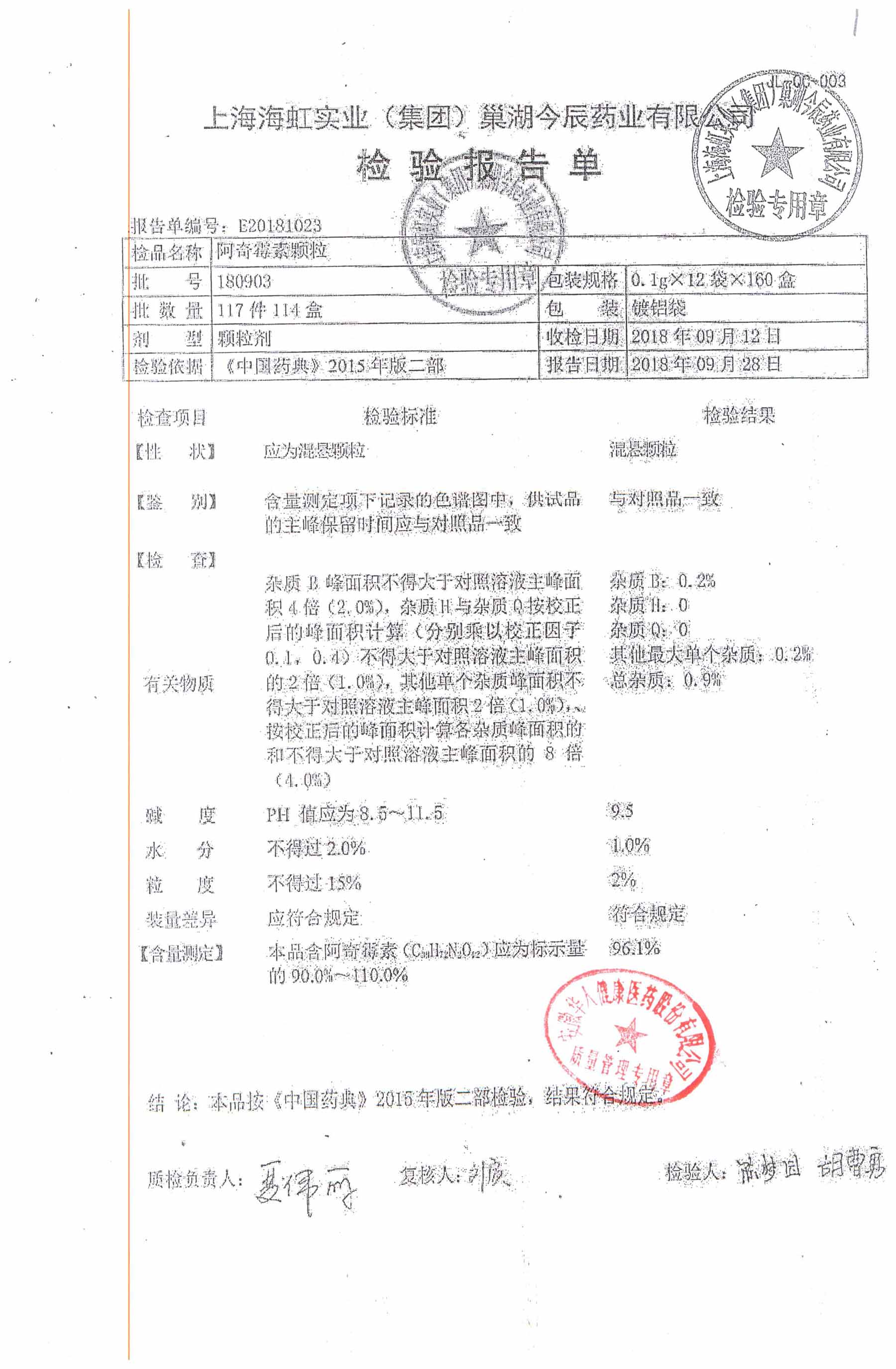 阿奇霉素顆粒 | 0.1g-12袋 | 180903 | 查看詳情 |
