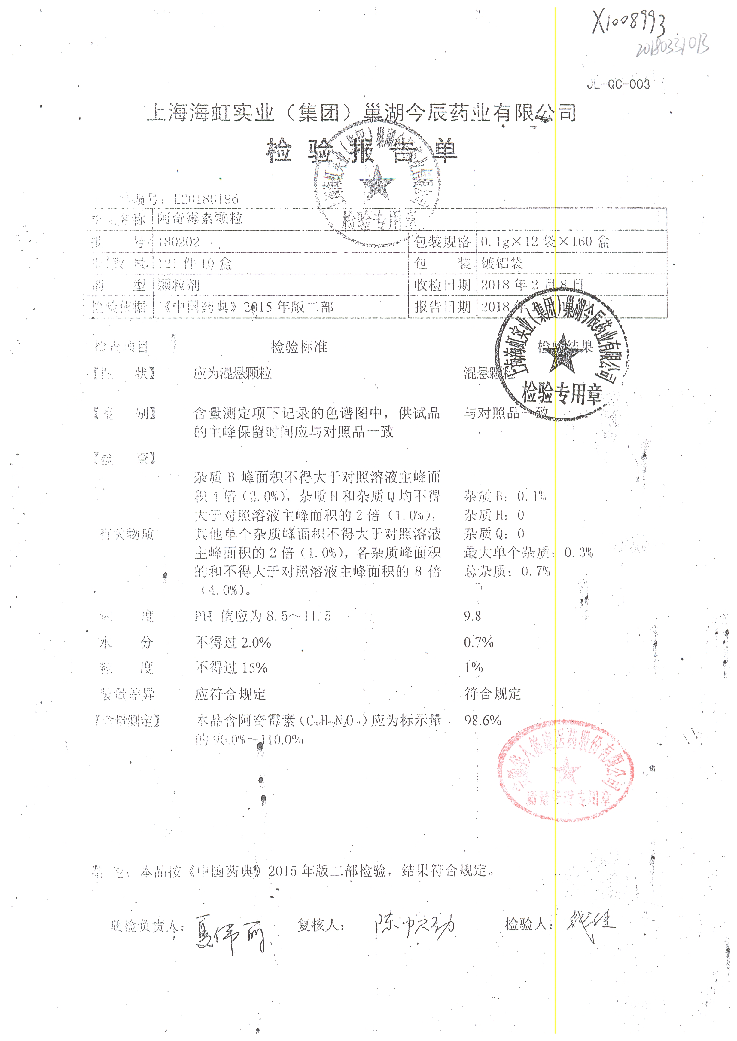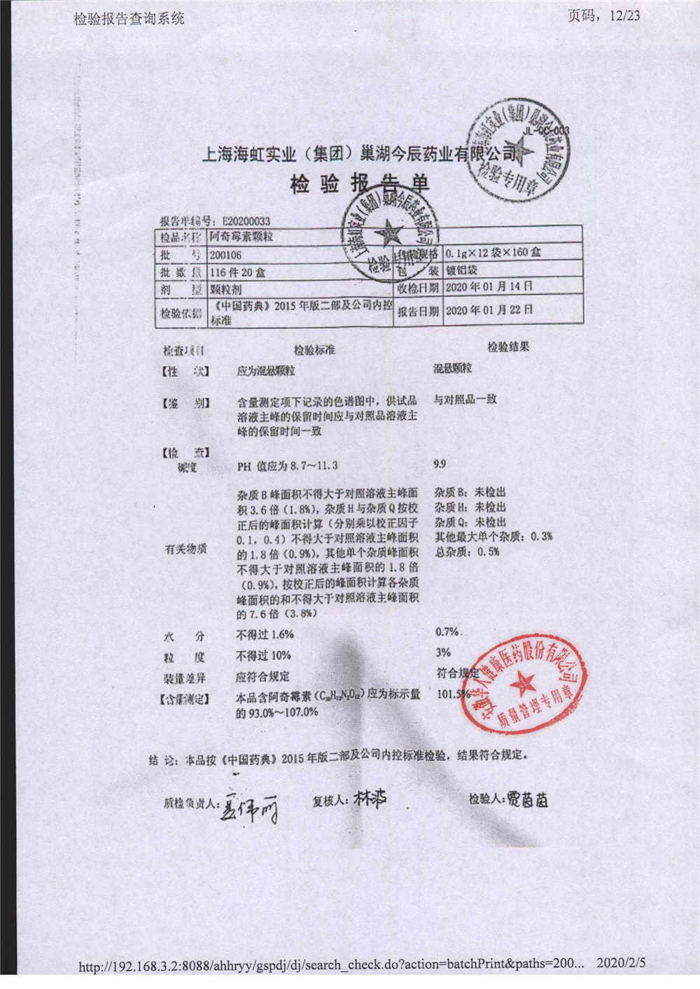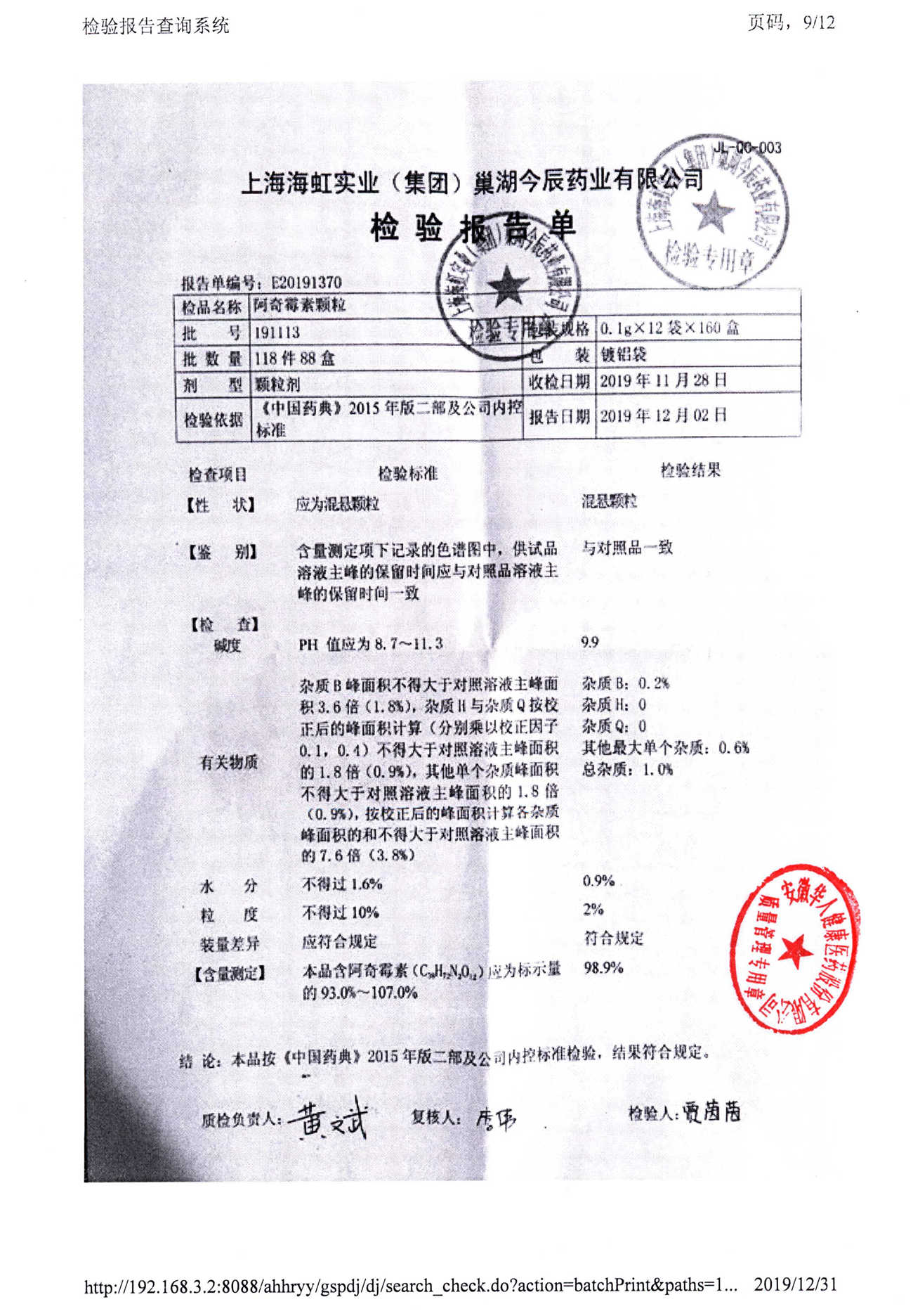阿奇霉素顆粒 | 0.1g-12袋 | 190218 | 查看詳情 |