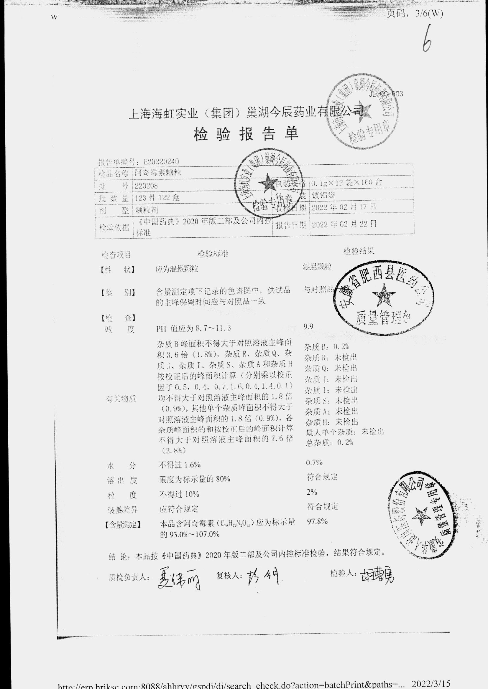 阿奇霉素顆粒 | 0.1g-12袋 | 220427 | 查看詳情 |
