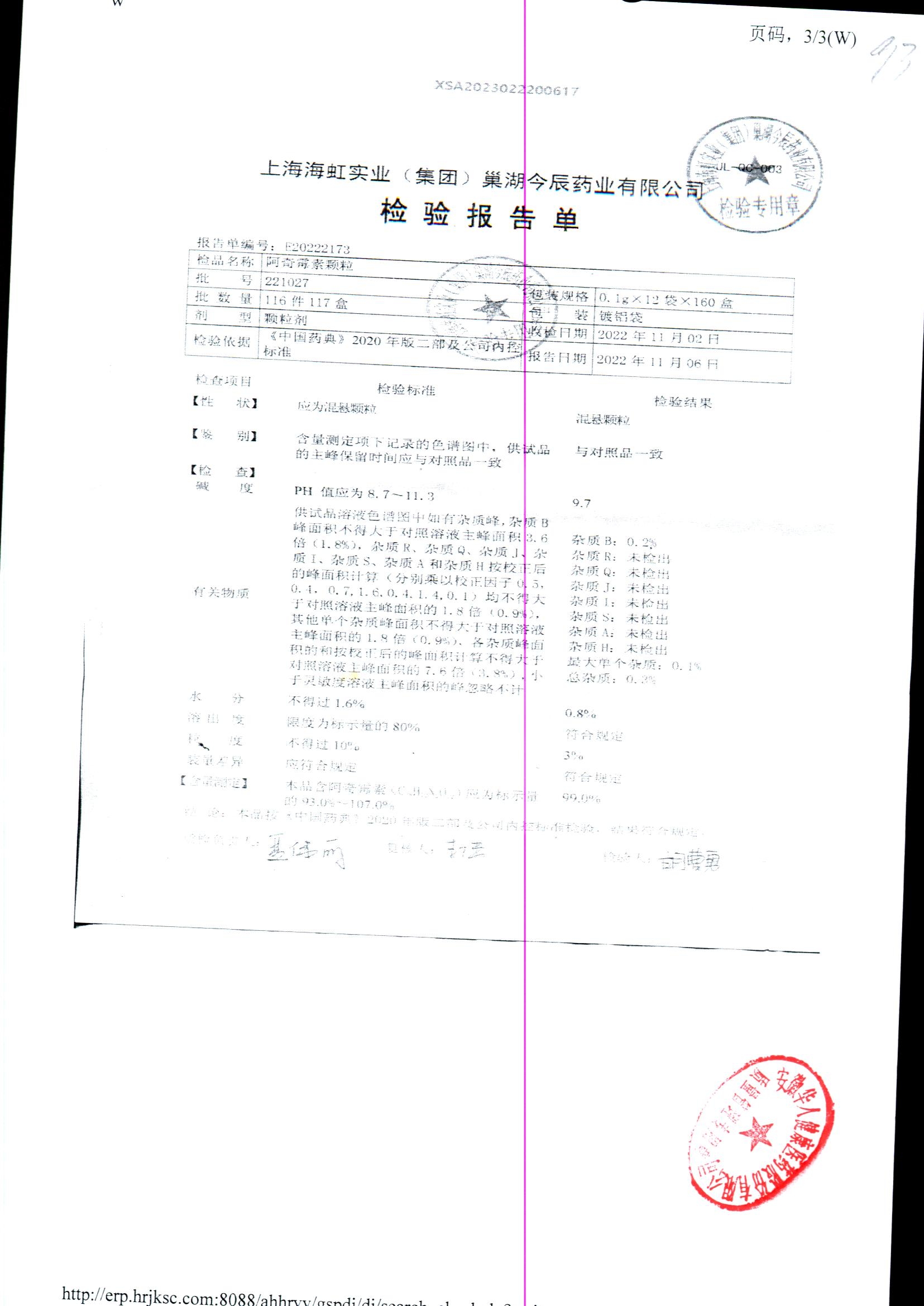 阿奇霉素顆粒 | 0.1g-12袋 | 221027 | 查看詳情 |