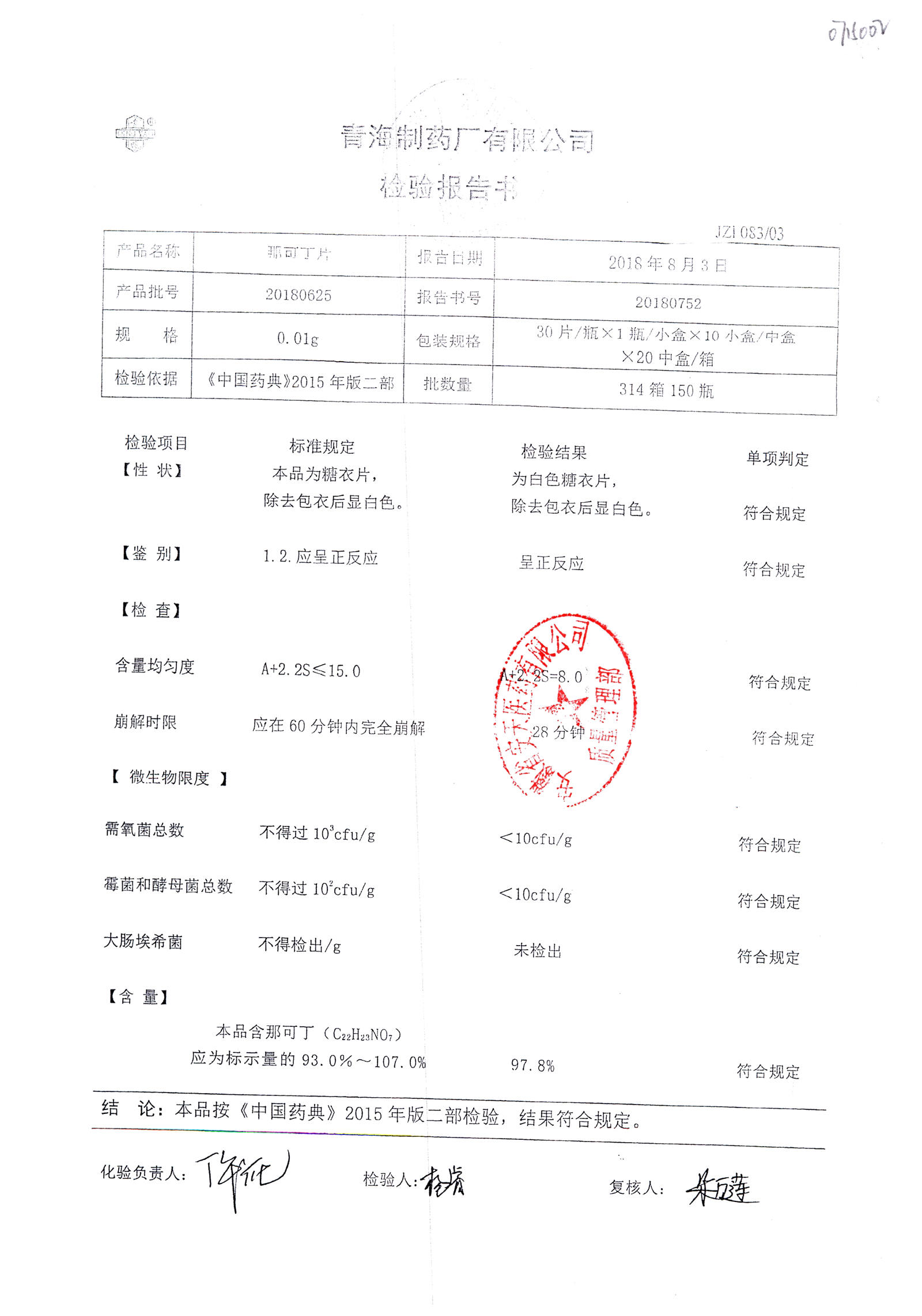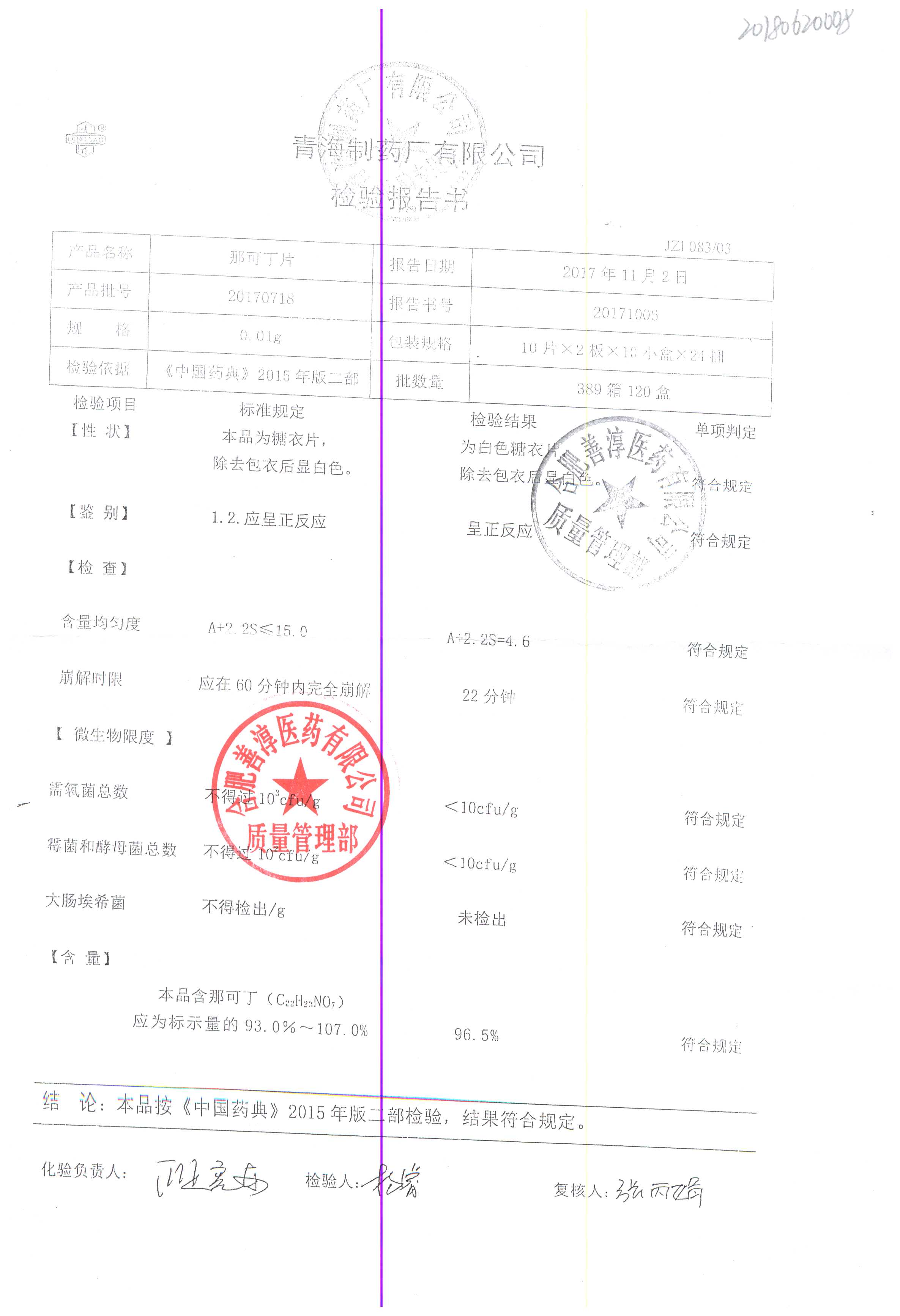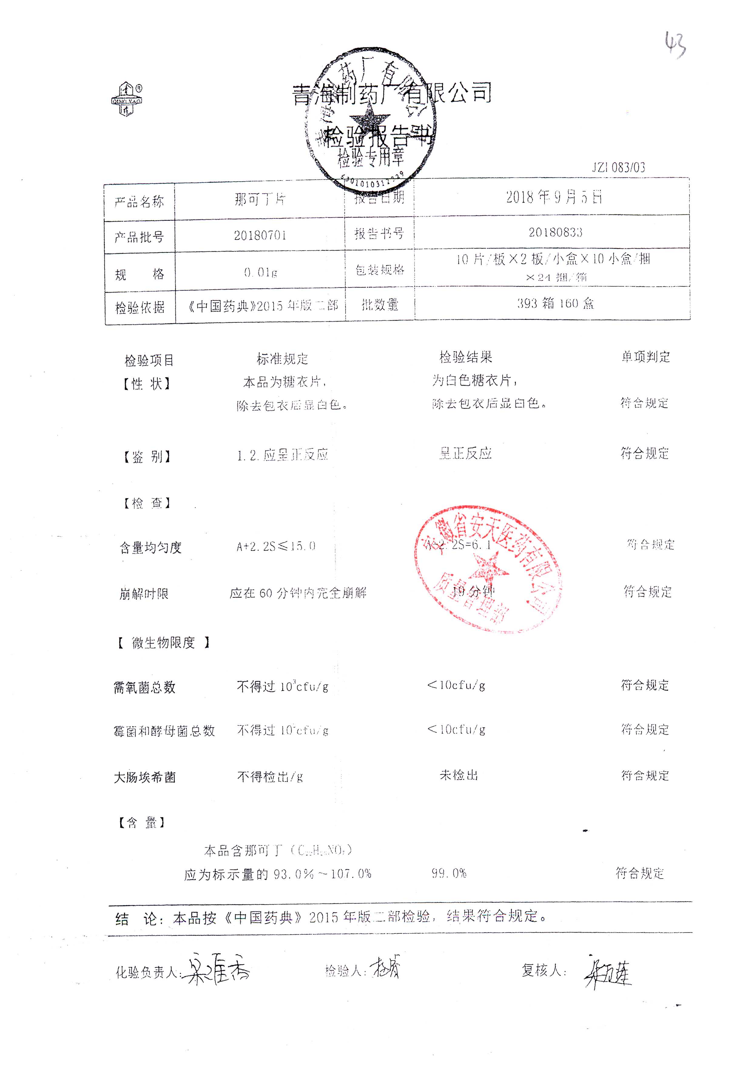 那可丁片 | 0.01g | 20180104 | 查看詳情 |