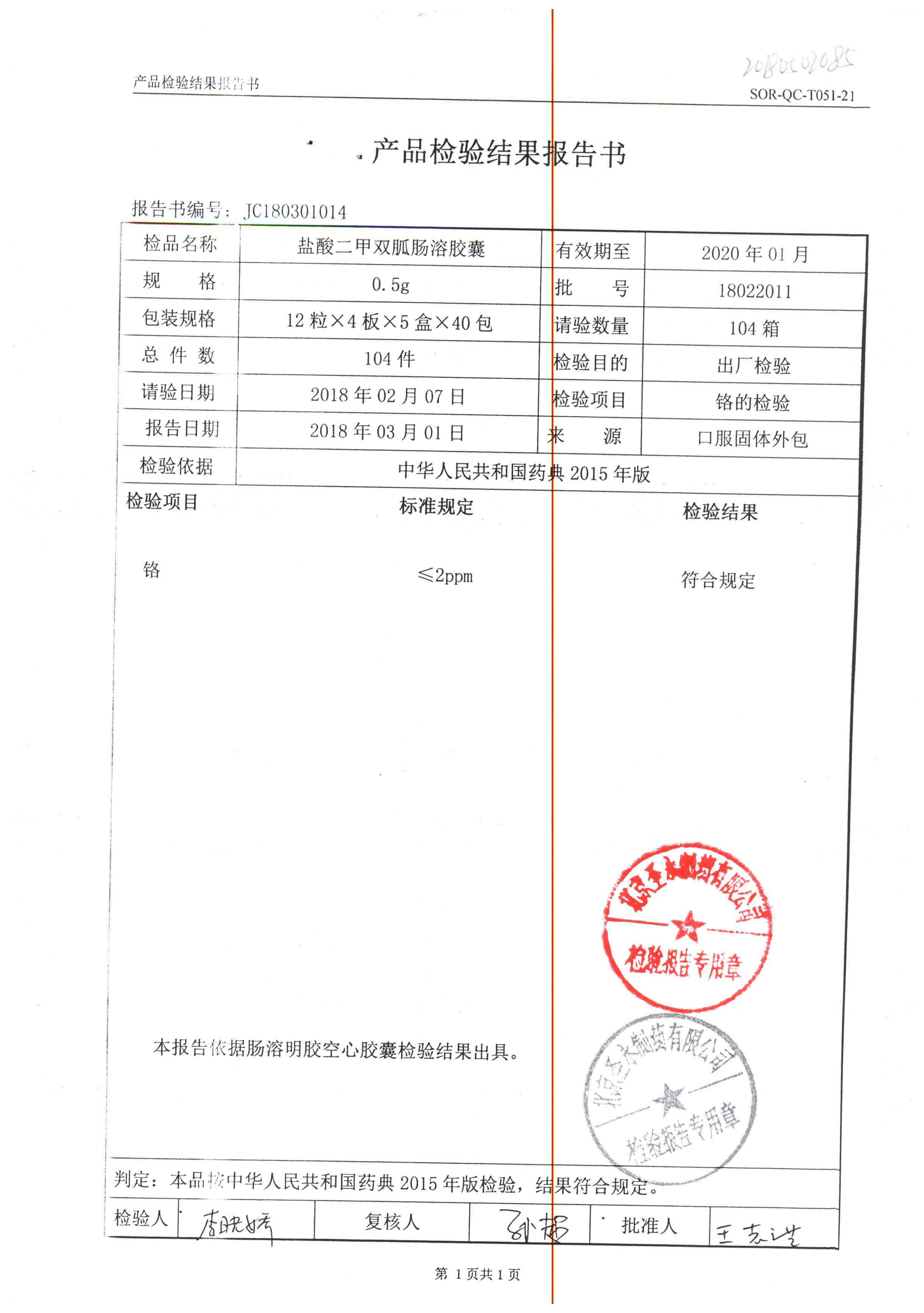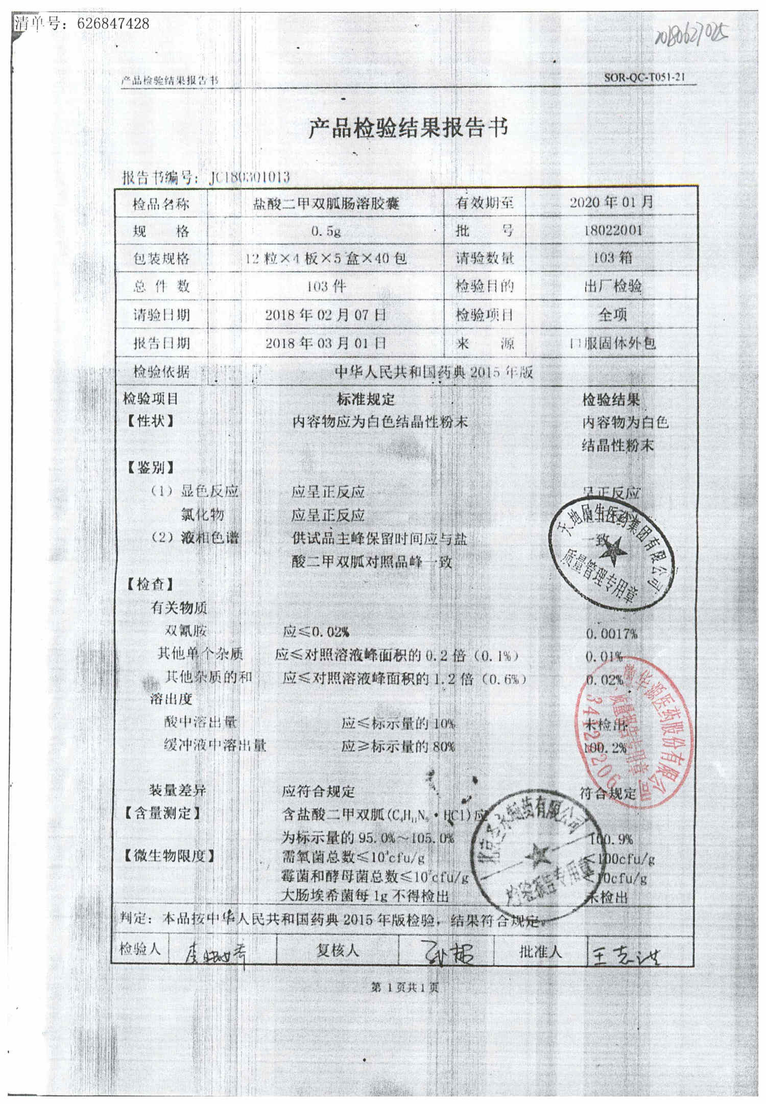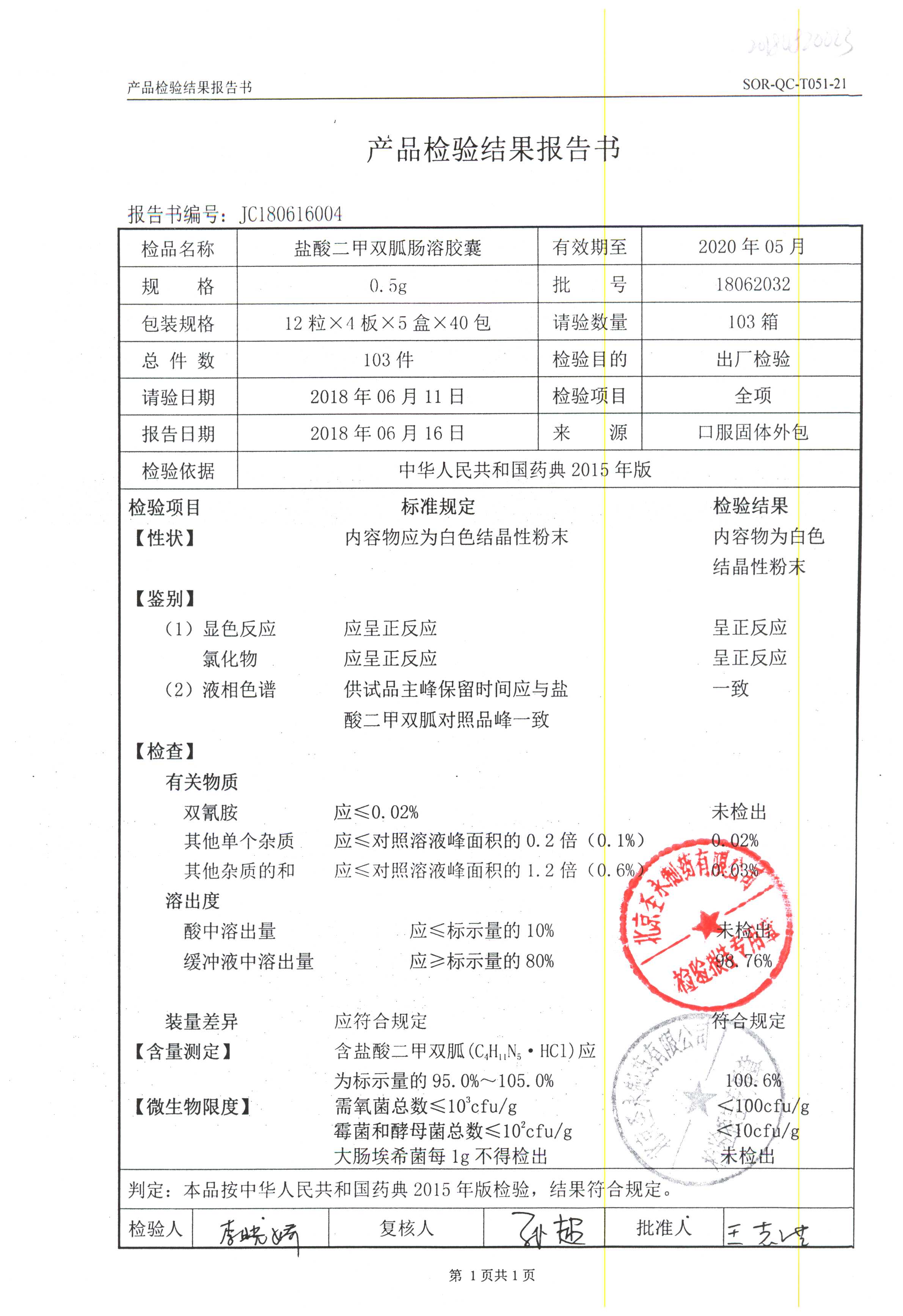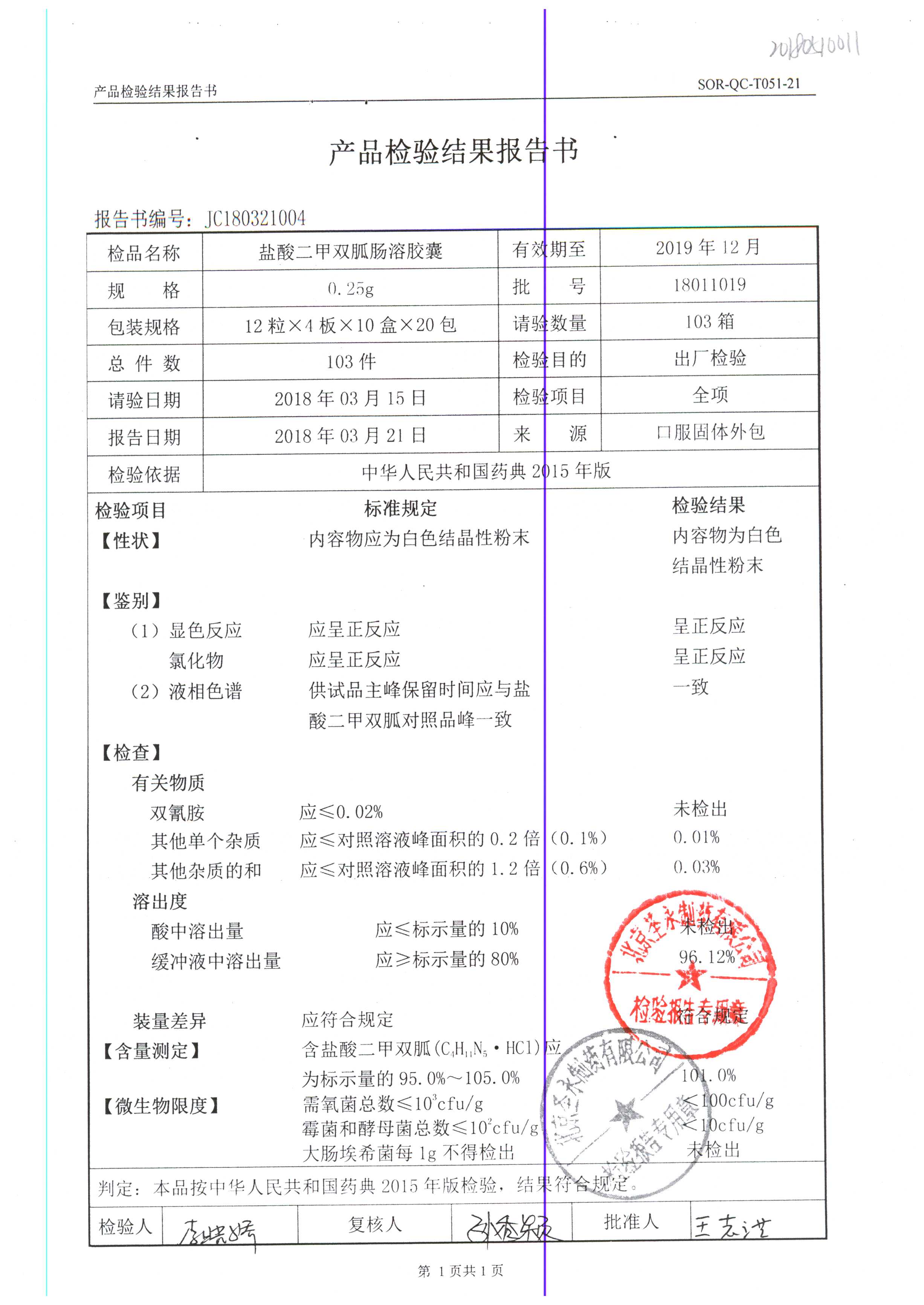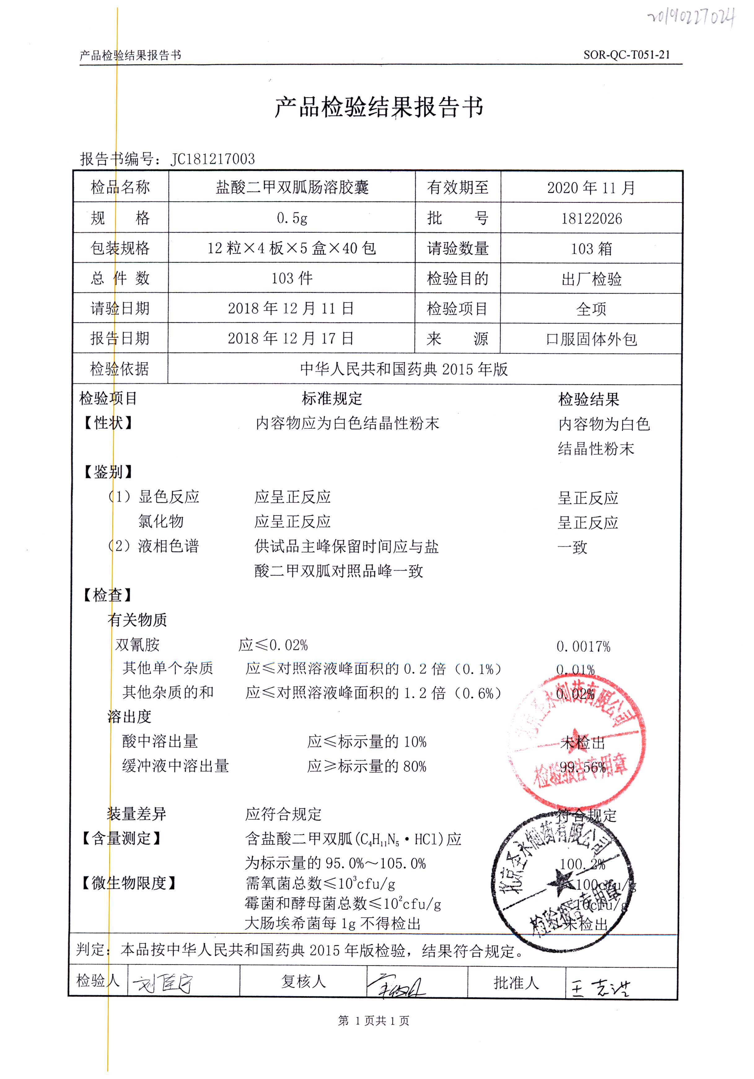 鹽酸二甲雙胍腸溶膠囊 | 0.5g*48s | 18011019(1/2) | 查看詳情 |