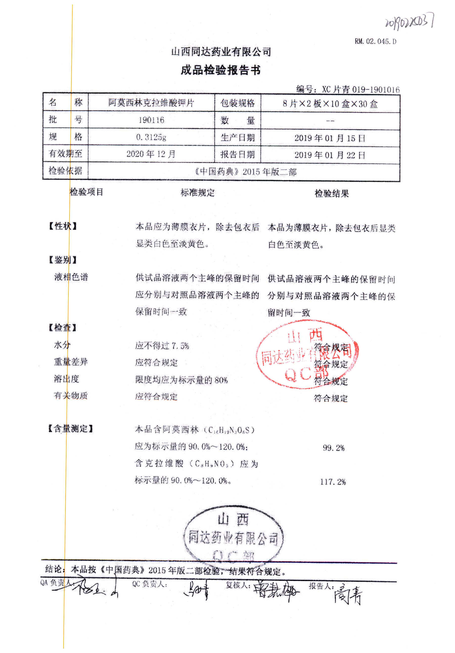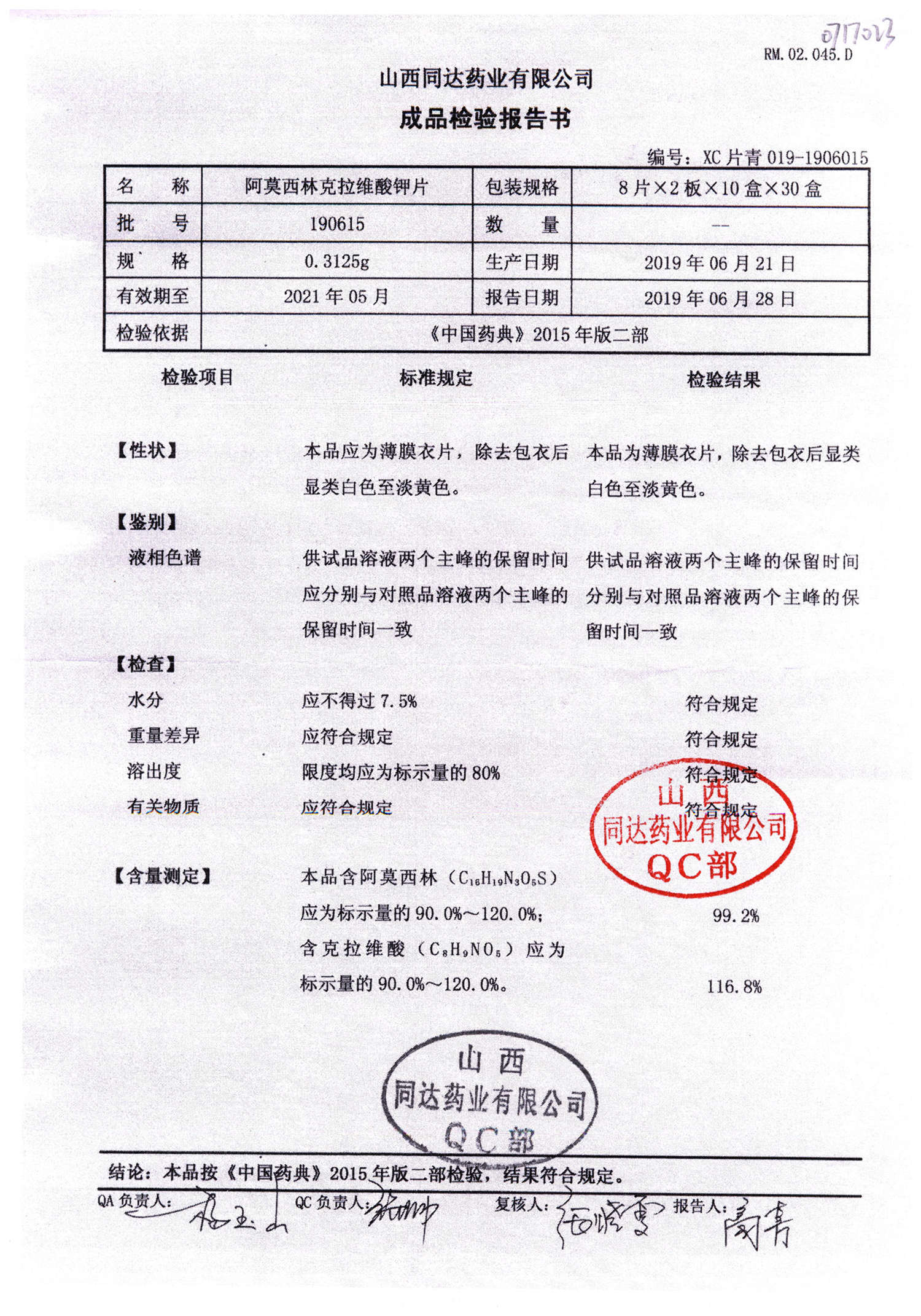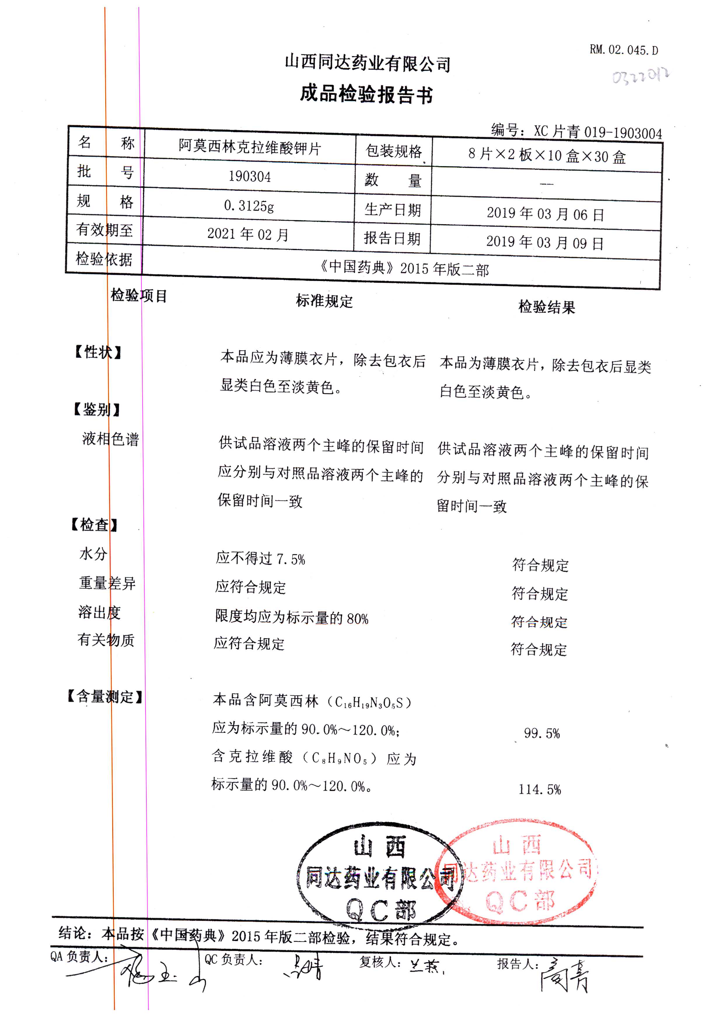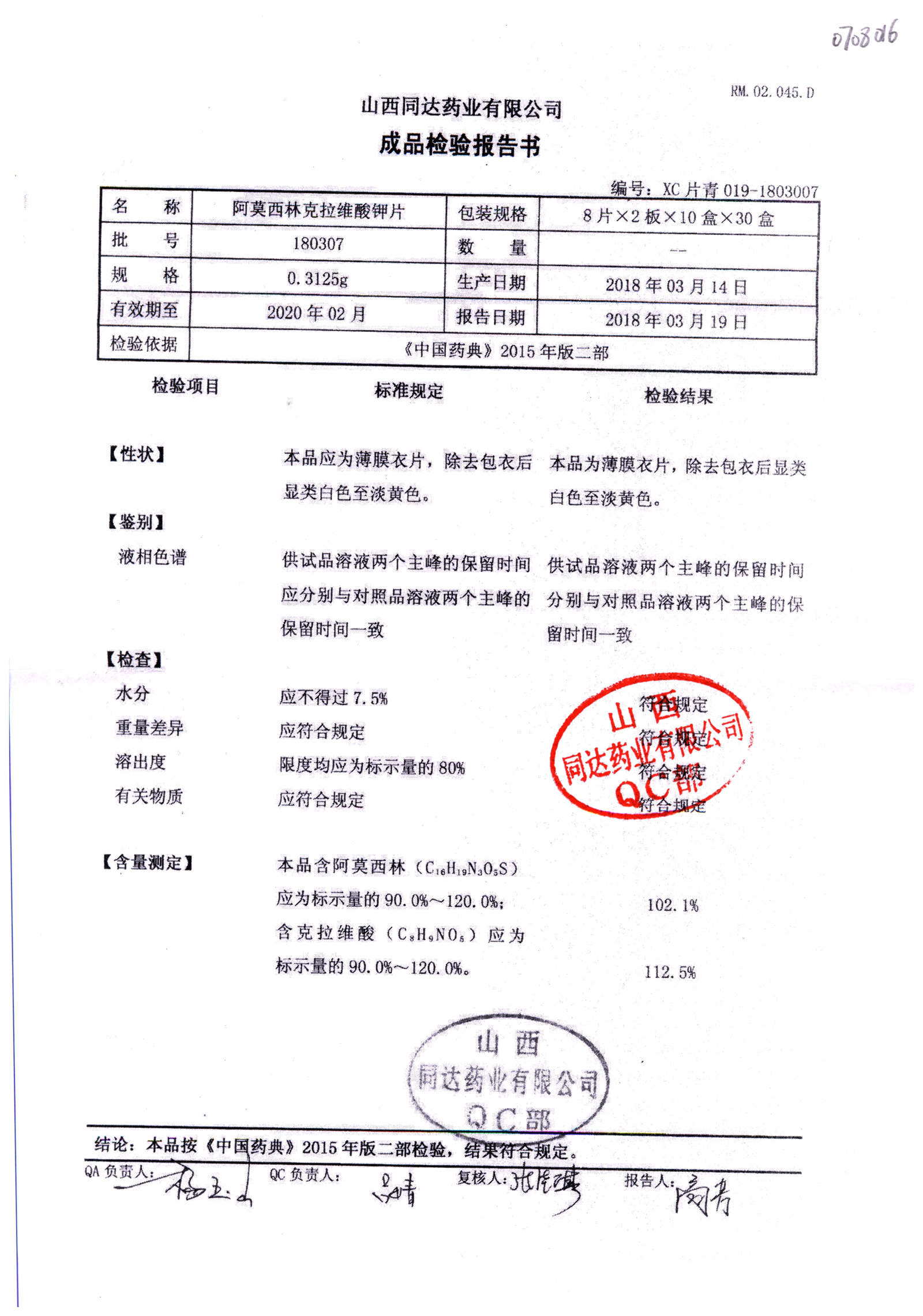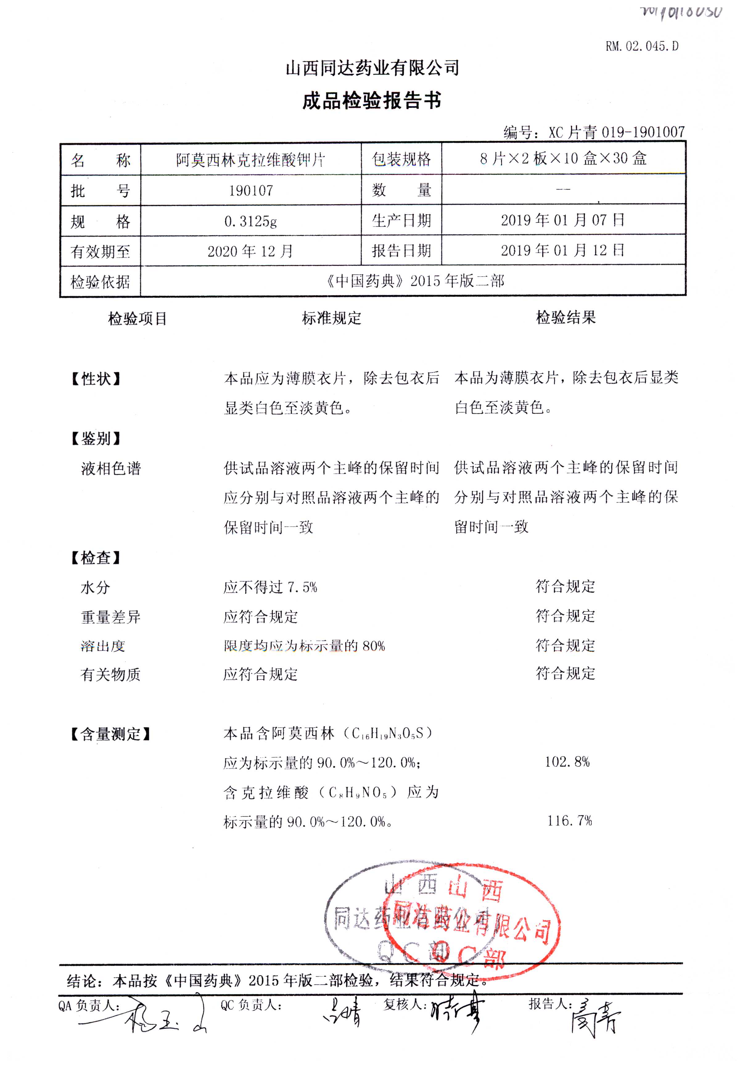 阿莫西林克拉維酸鉀片 | 0.3125g*16s | 190326 | 查看詳情 |