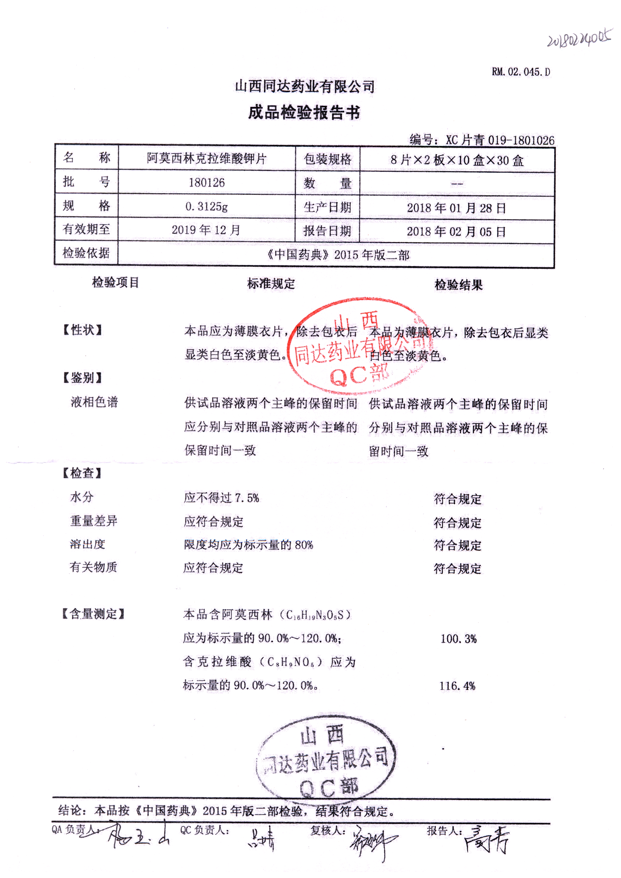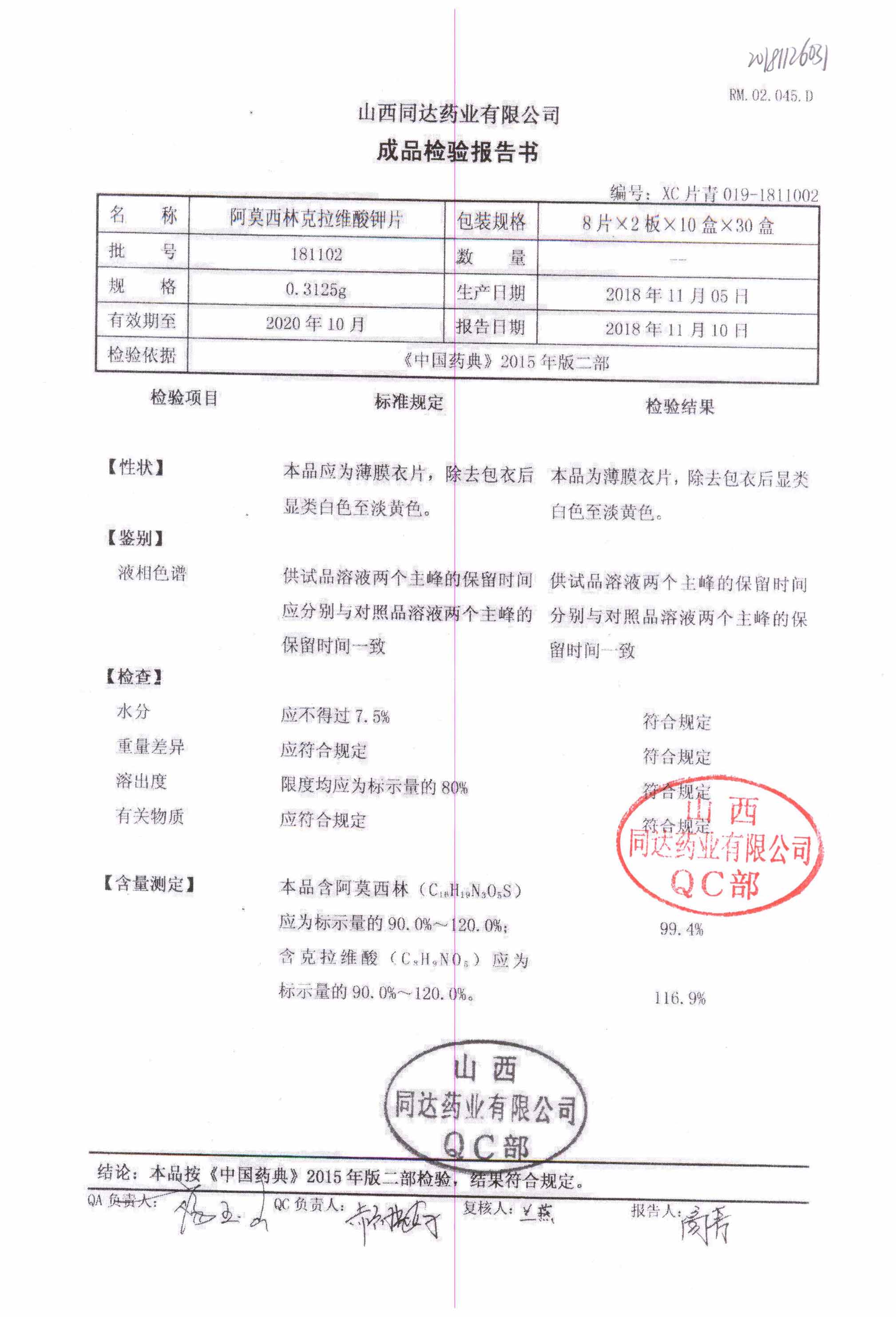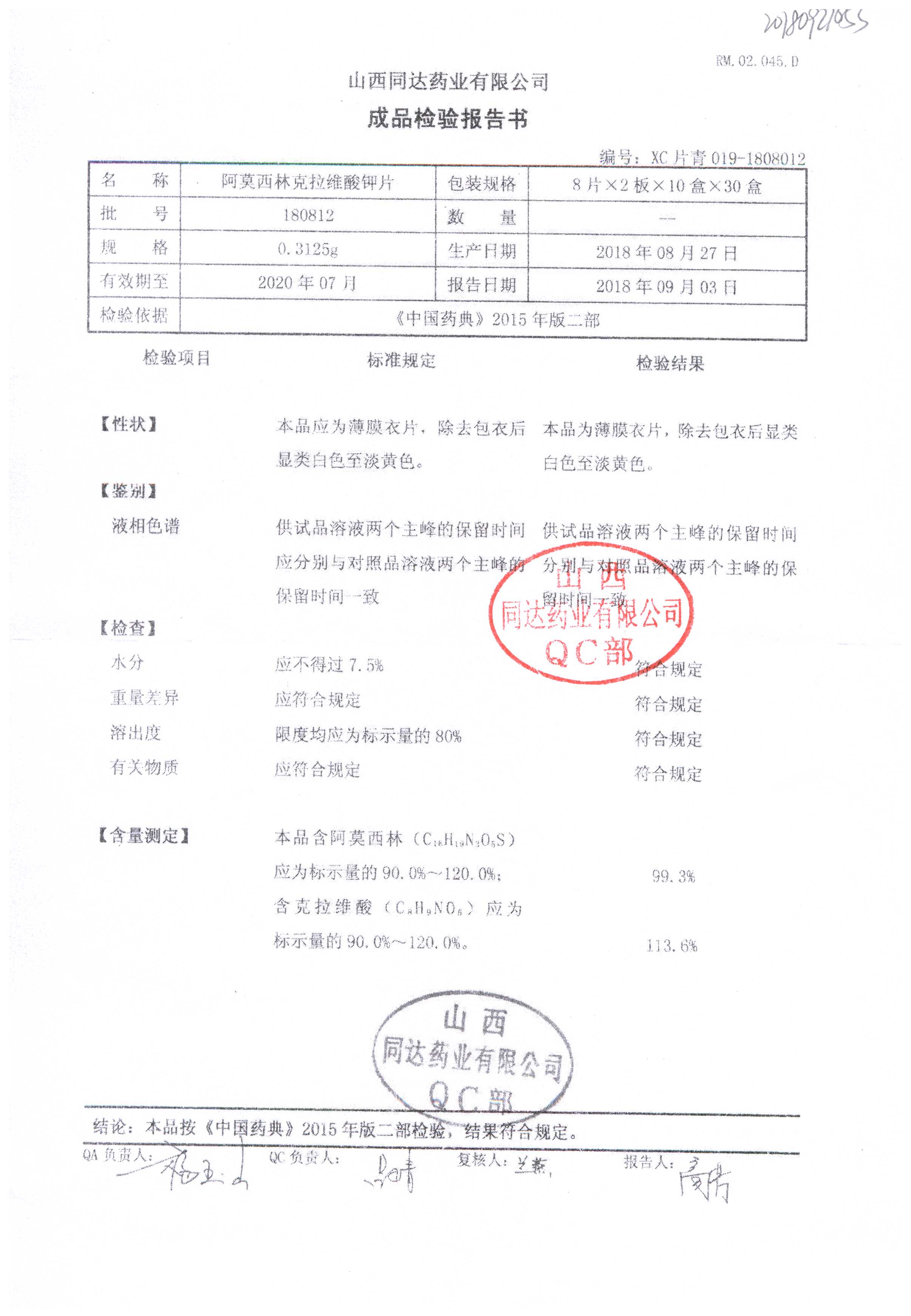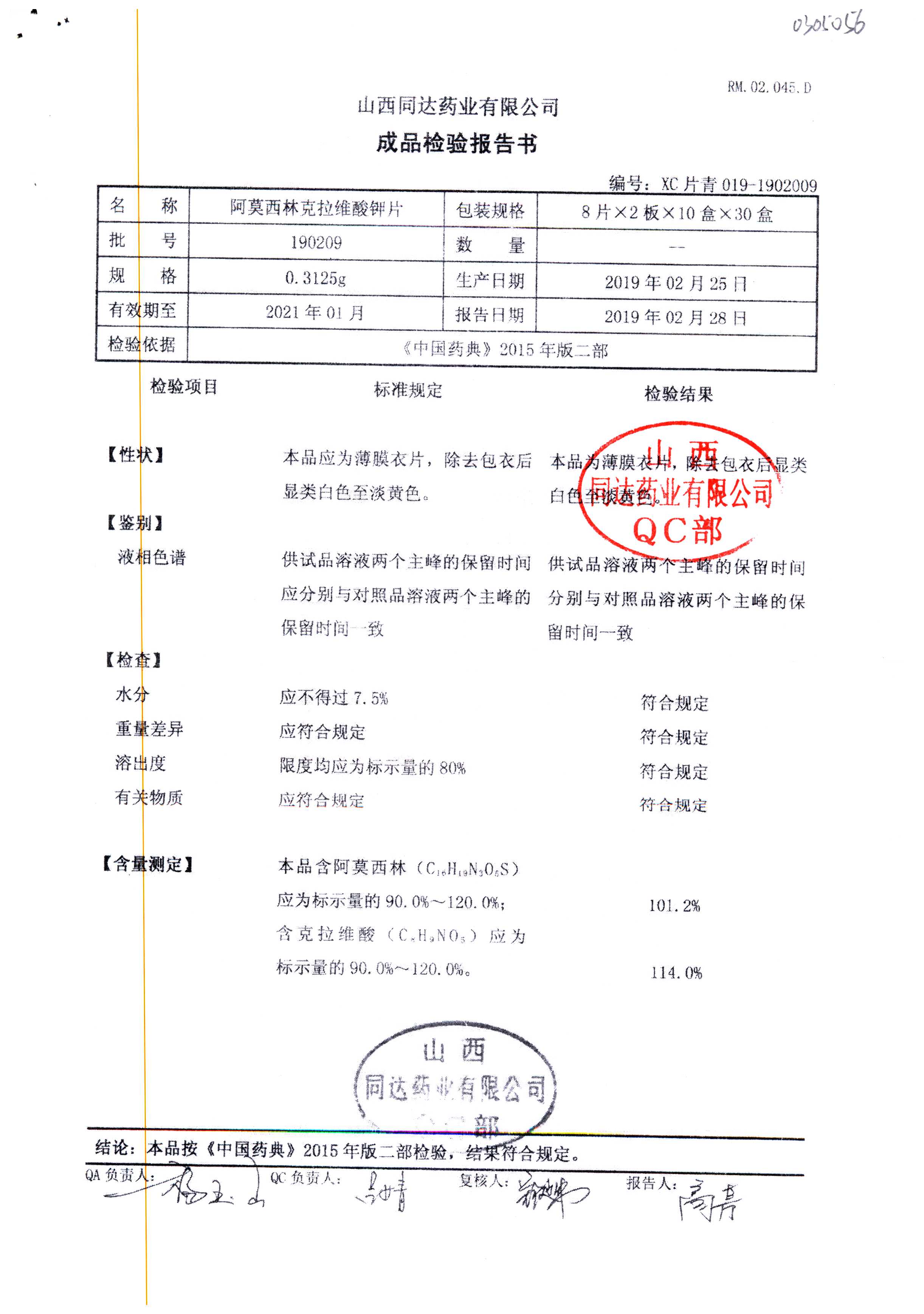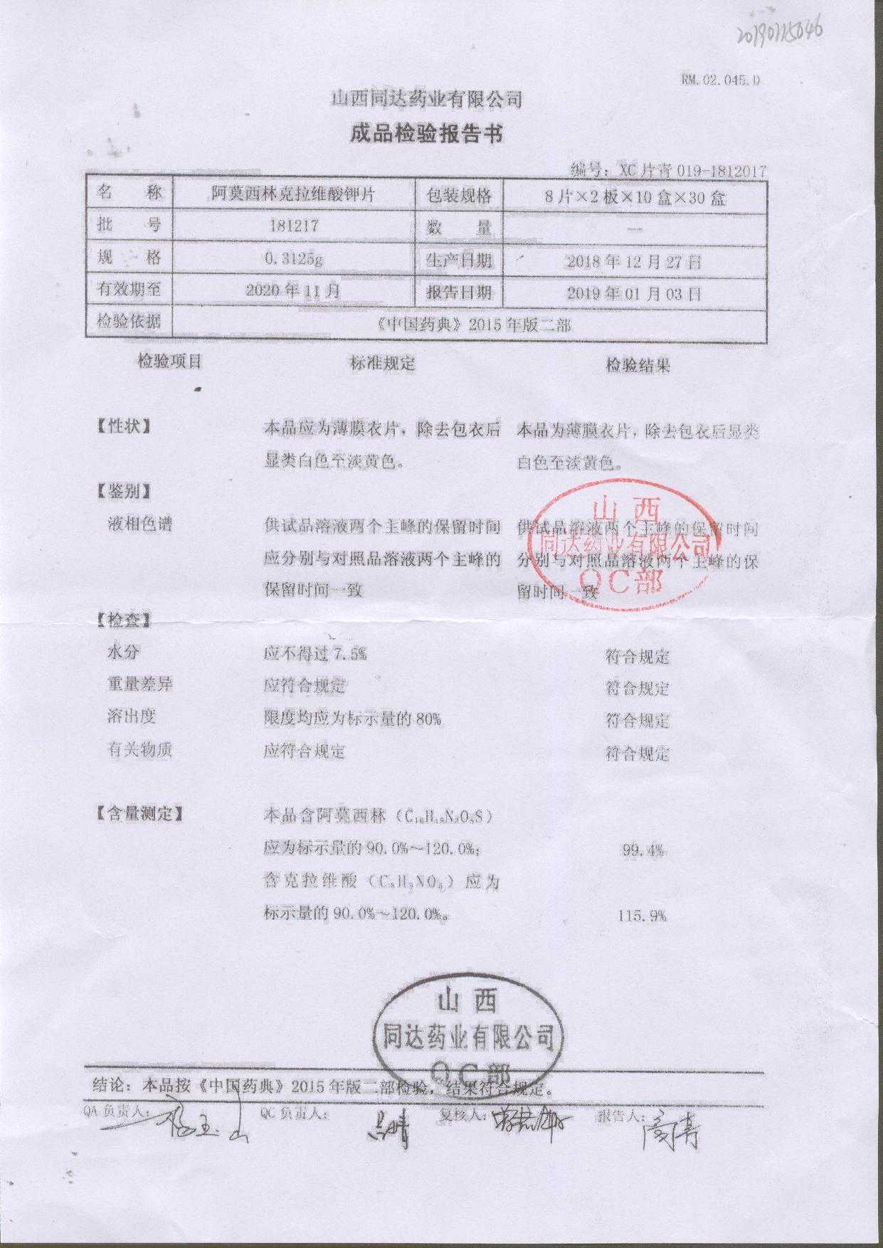 阿莫西林克拉維酸鉀片 | 0.3125g*16s | 190326 | 查看詳情 |