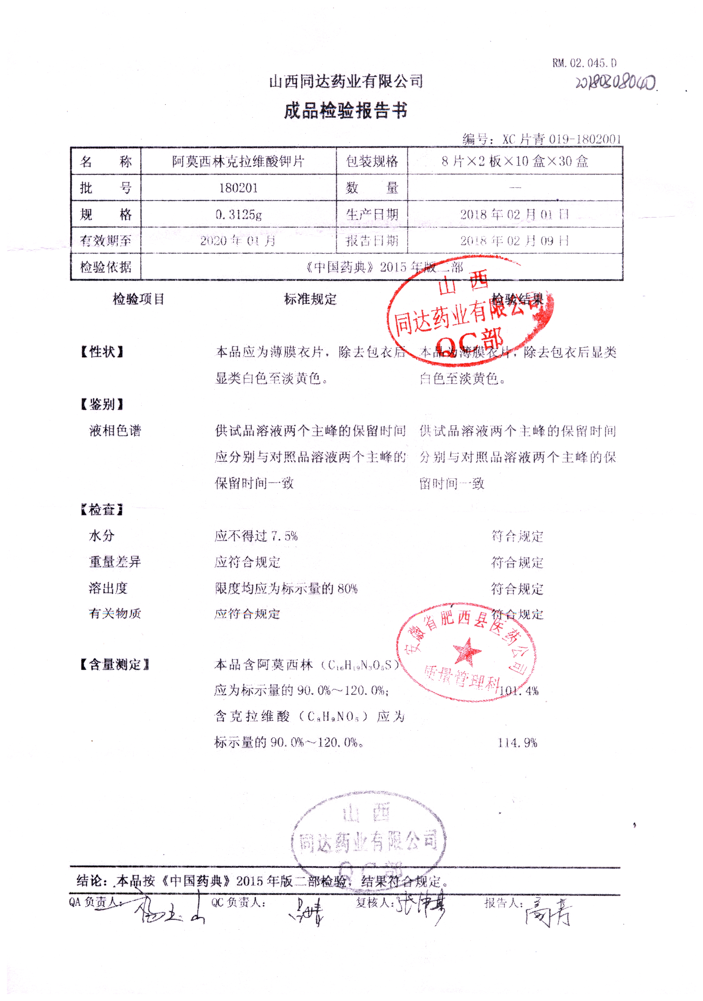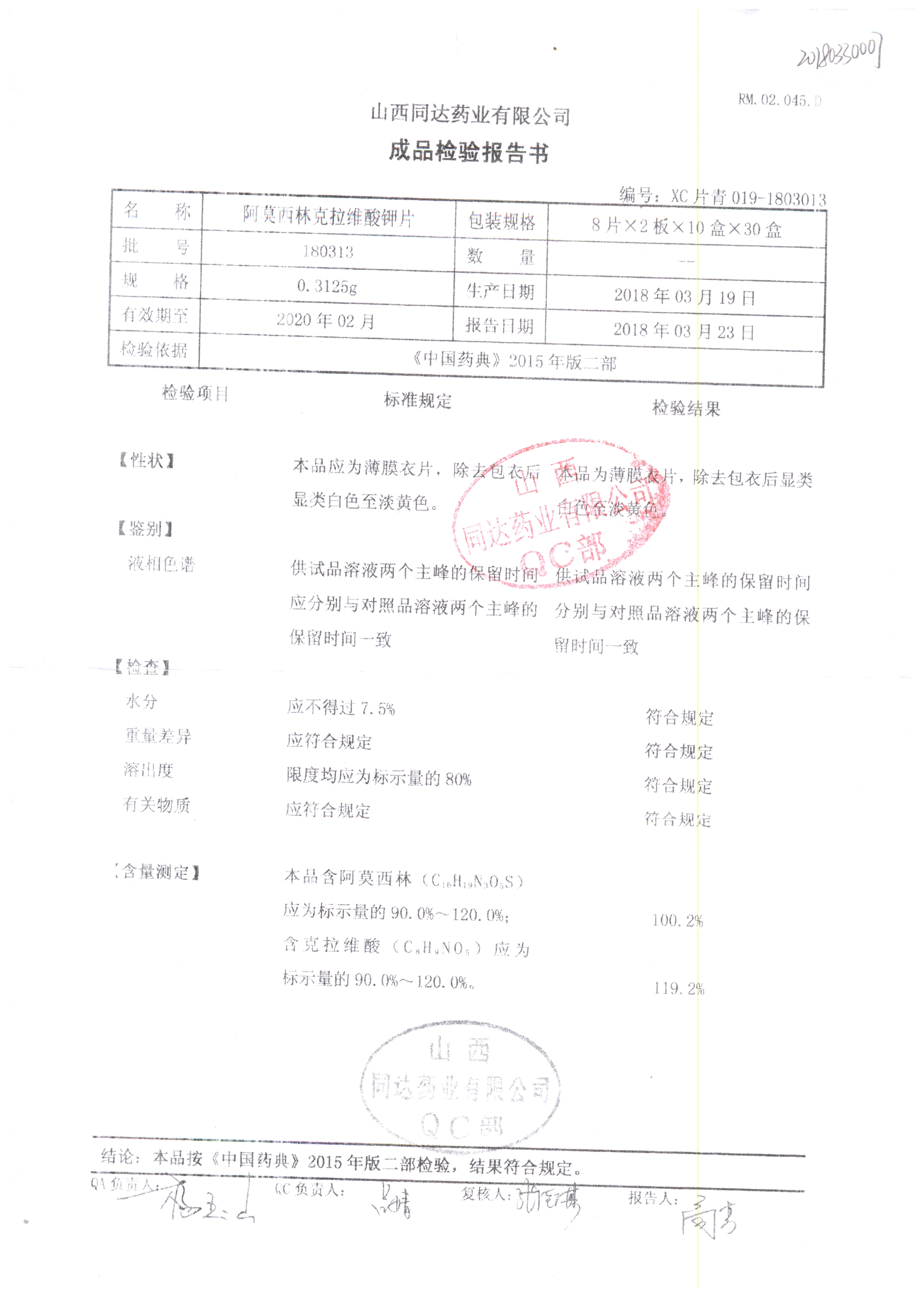 阿莫西林克拉維酸鉀片 | 0.3125g*16s | 190511 | 查看詳情 |