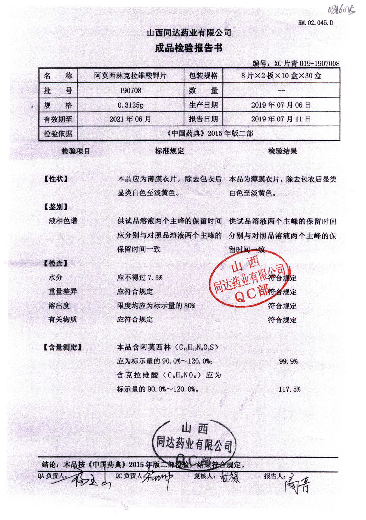 阿莫西林克拉維酸鉀片 | 0.3125g*16s | 190809 | 查看詳情 |