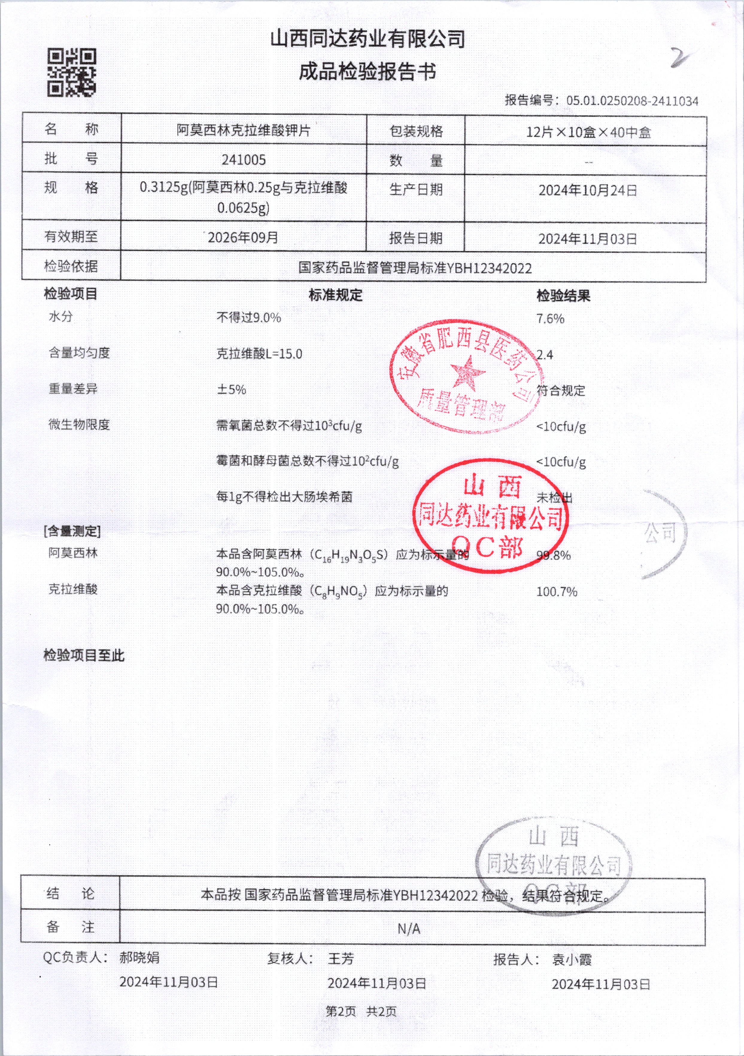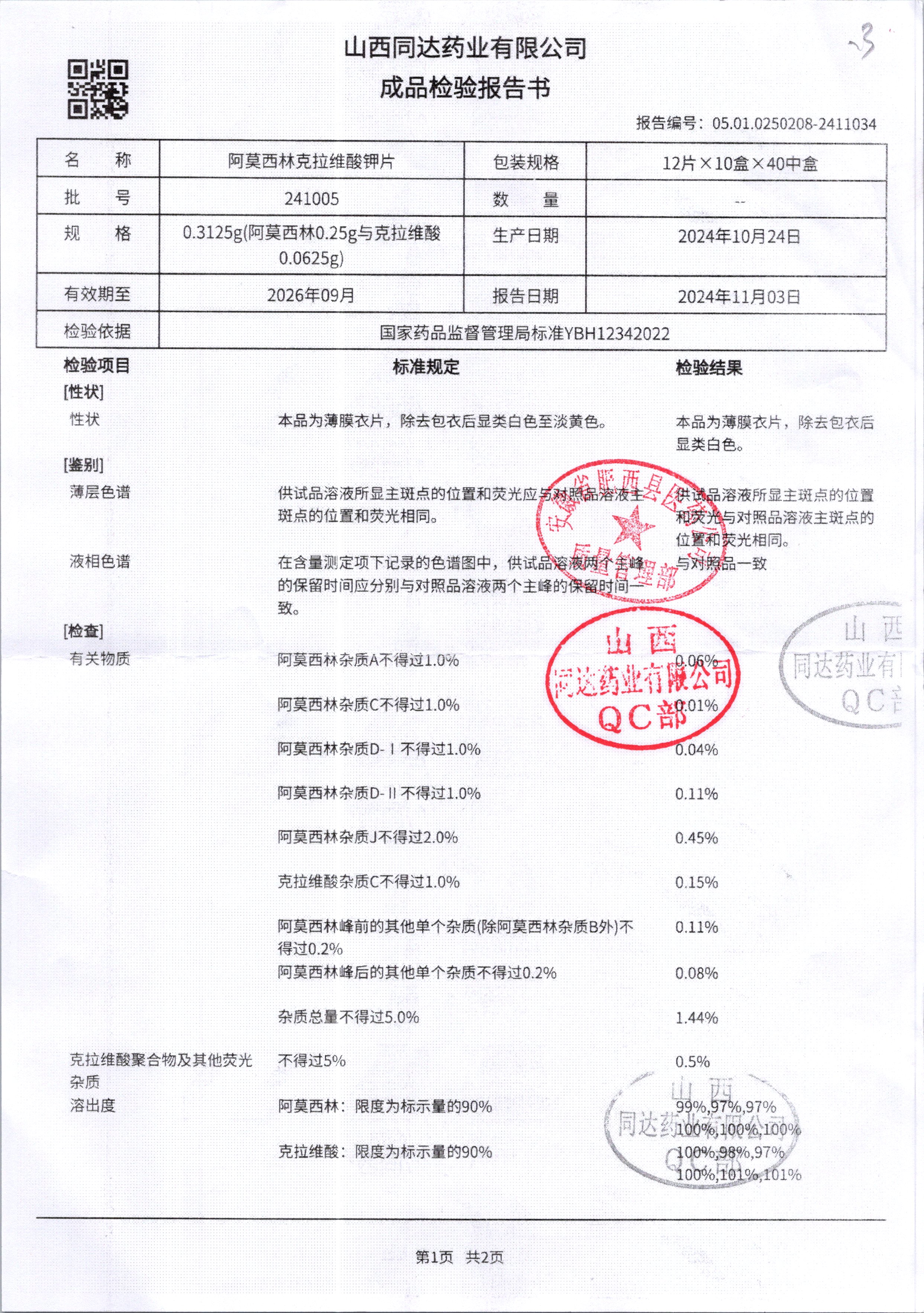 阿莫西林克拉維酸鉀片 | 0.3125g*16s | 241005 | 查看詳情 |