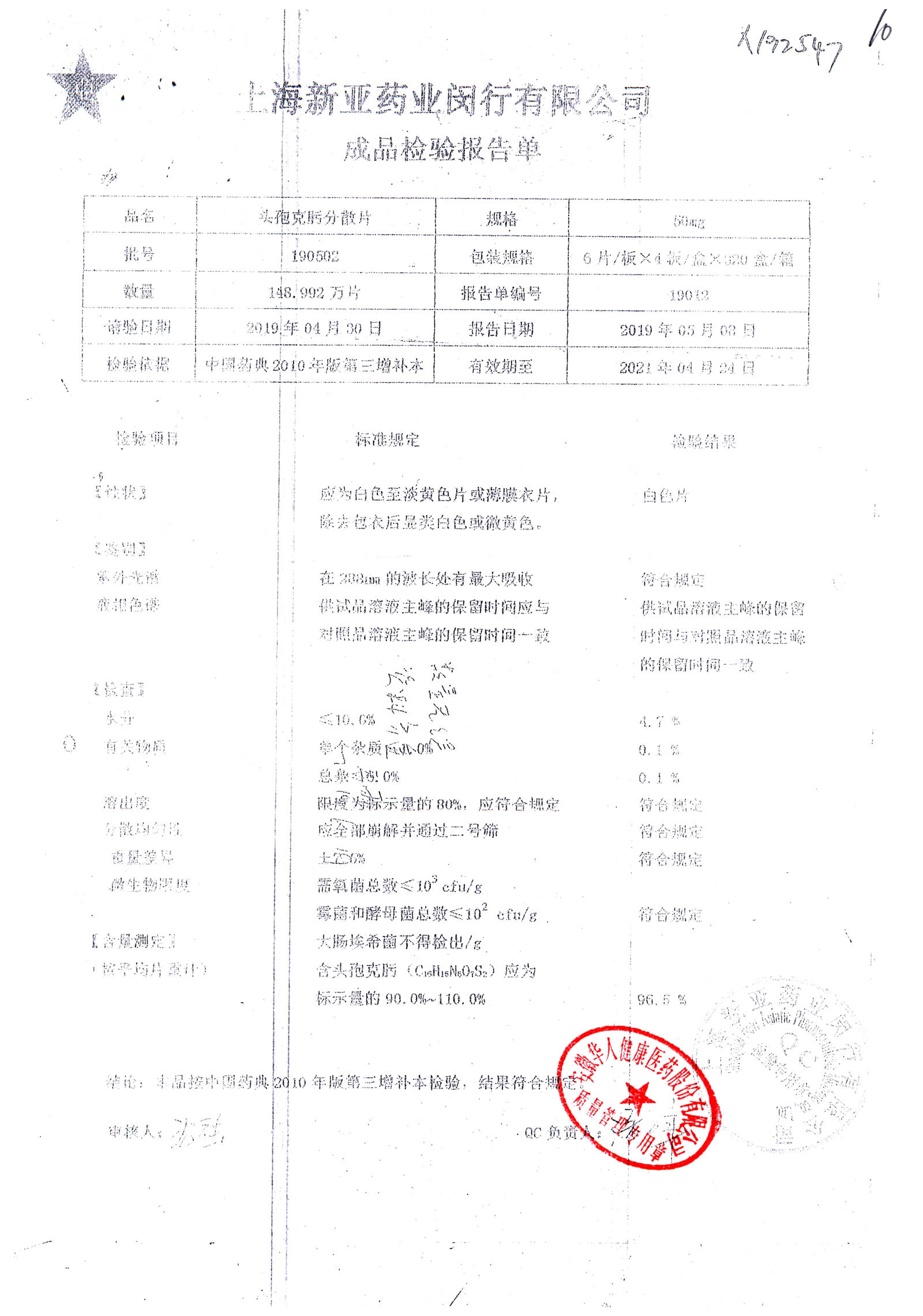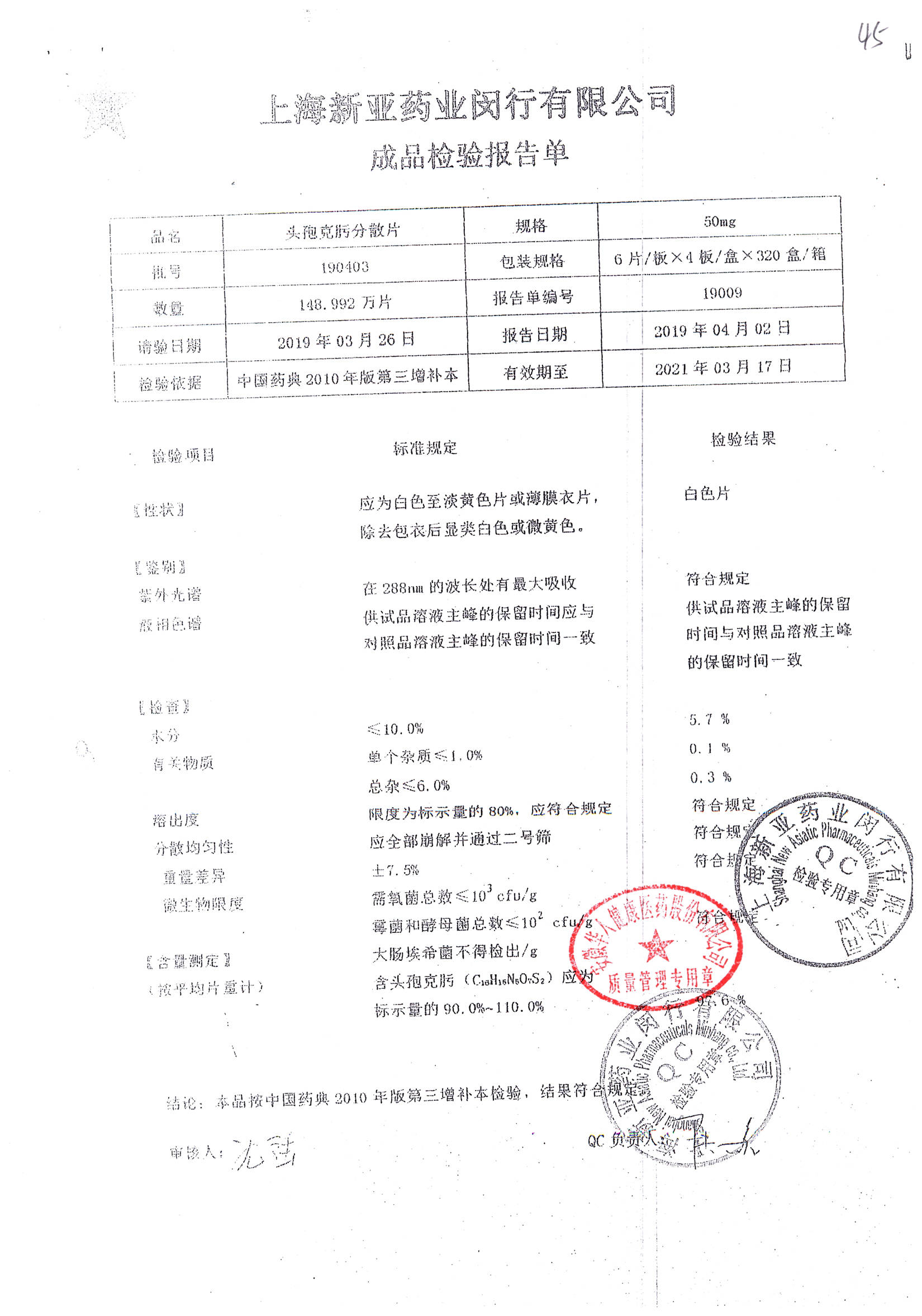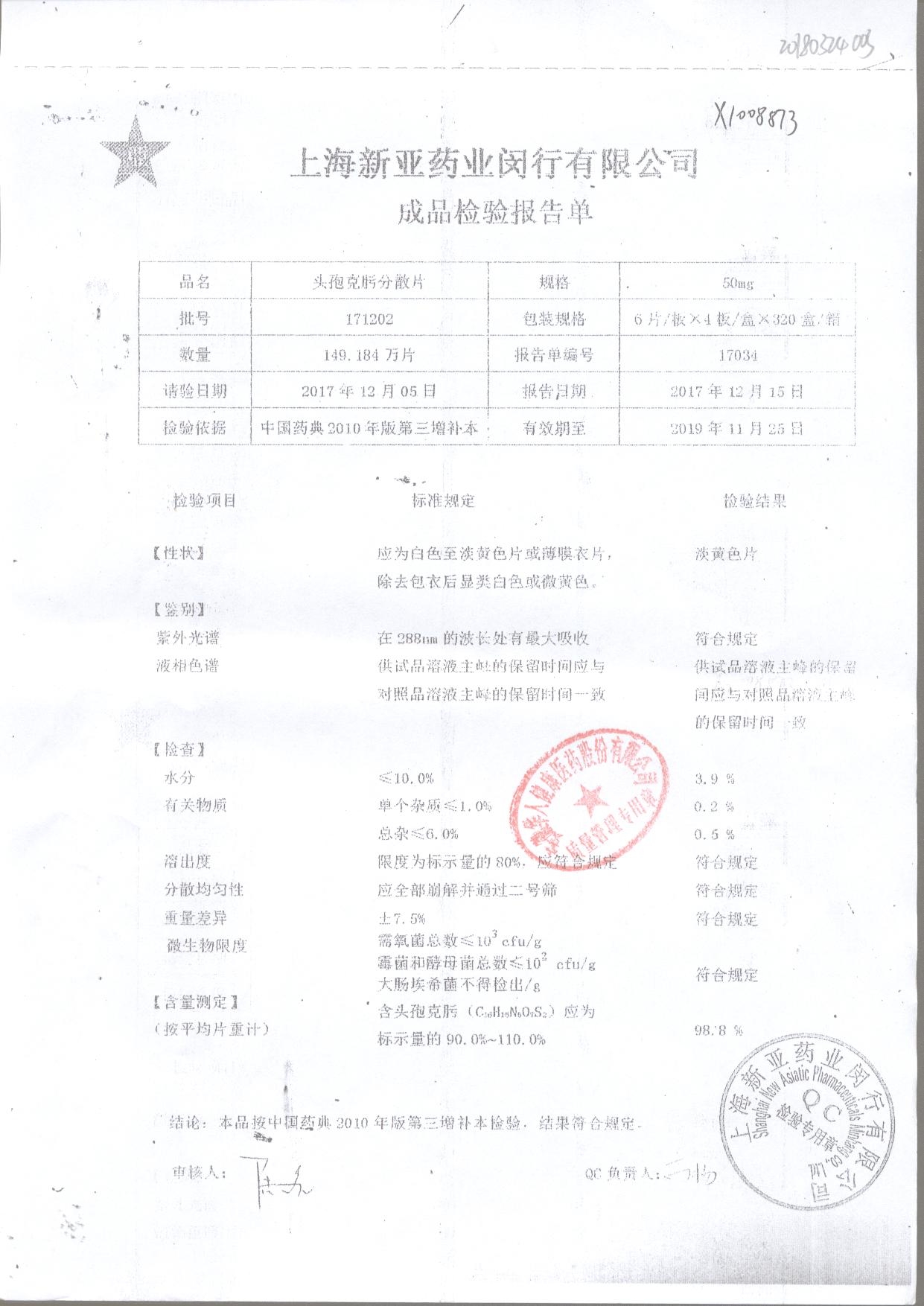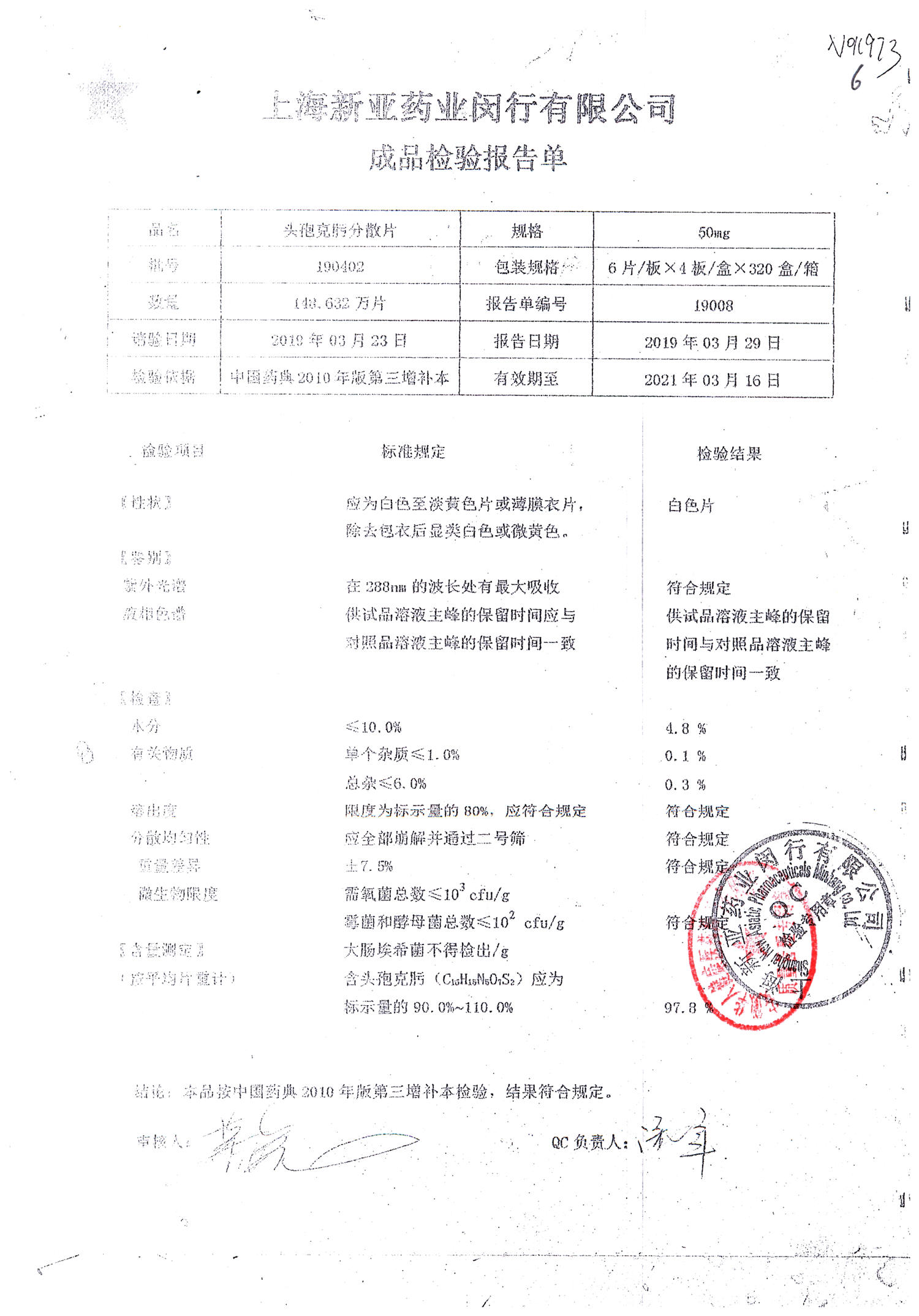 頭孢克肟分散片 | 50mg*24s | 190702 | 查看詳情 |