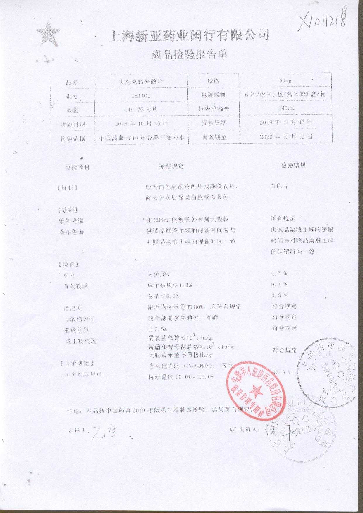 頭孢克肟分散片 | 50mg*24s | 180601 | 查看詳情 |