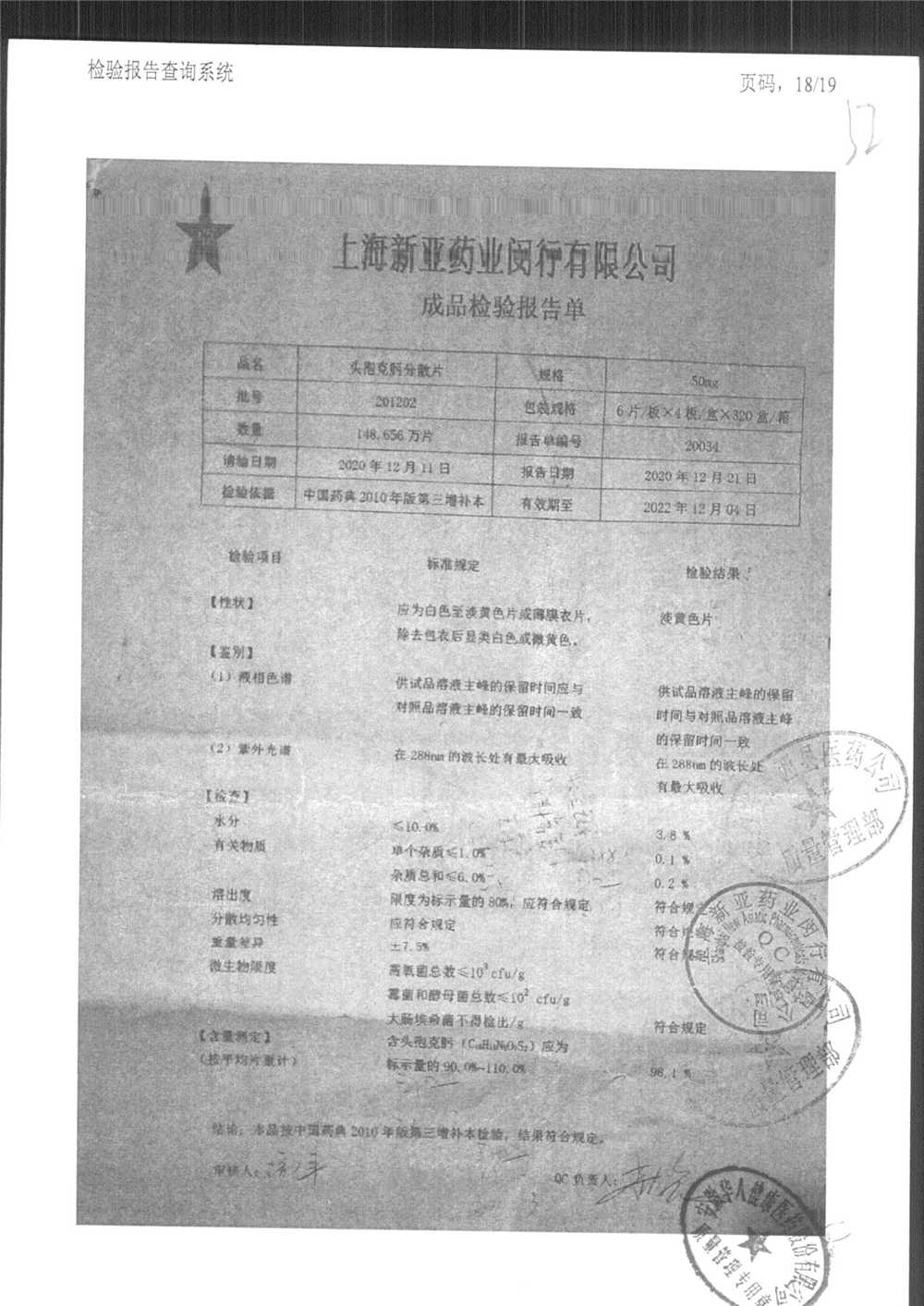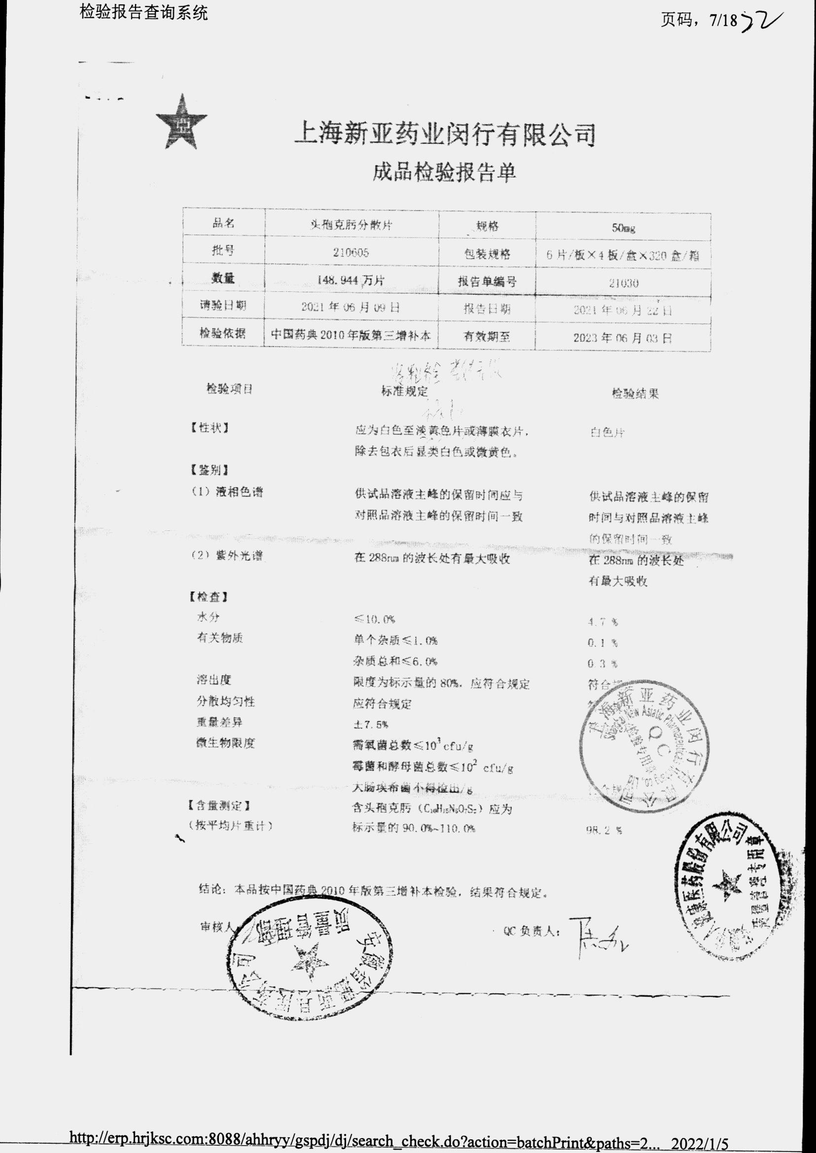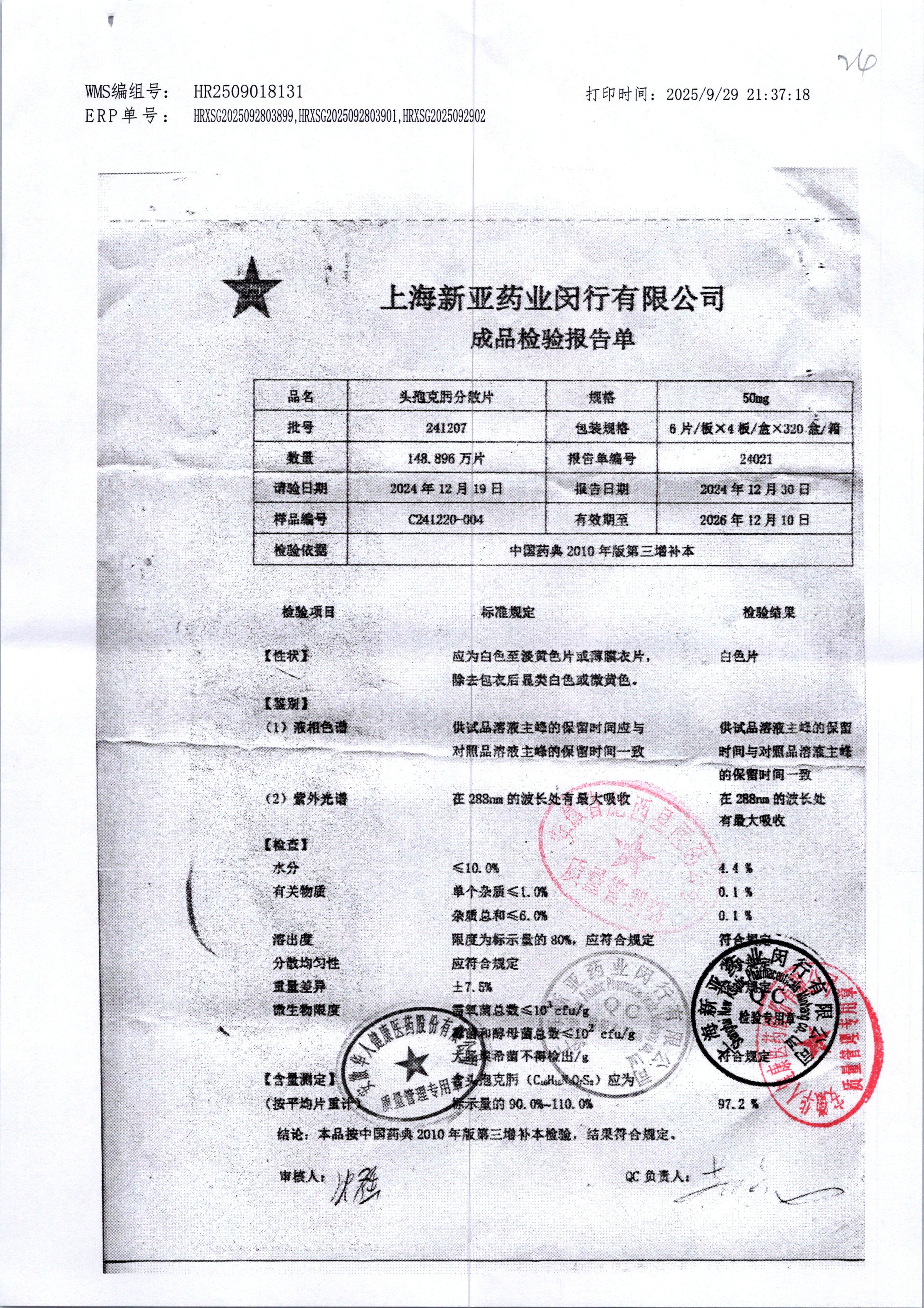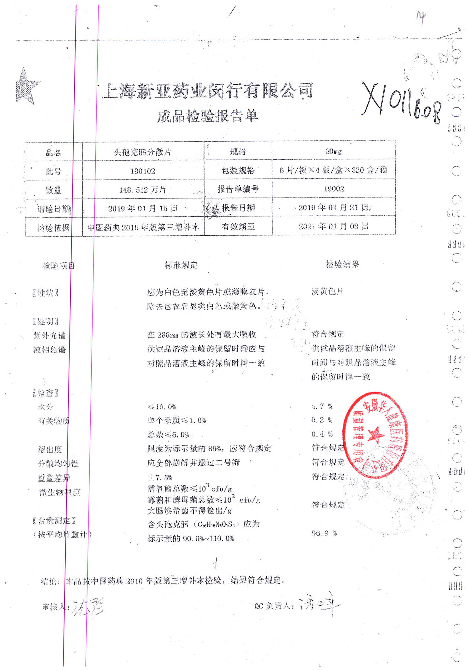 頭孢克肟分散片 | 50mg*24s | 210801 | 查看詳情 |