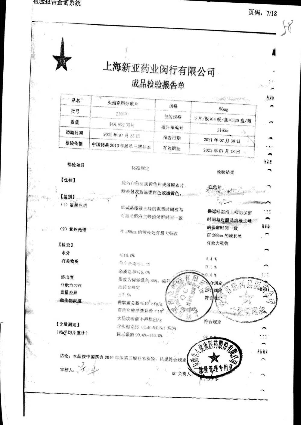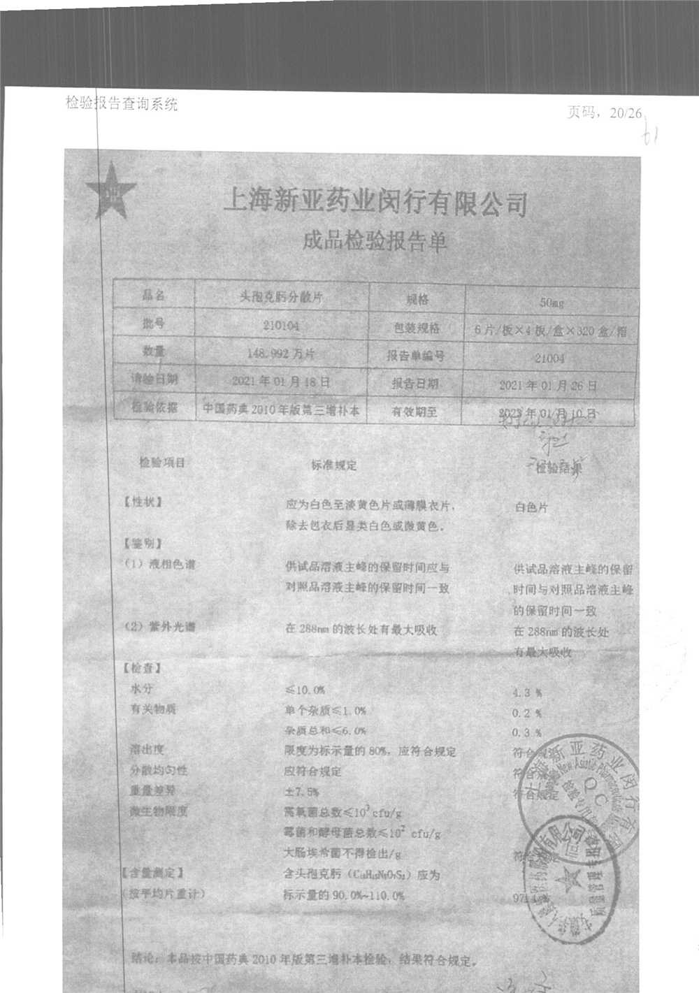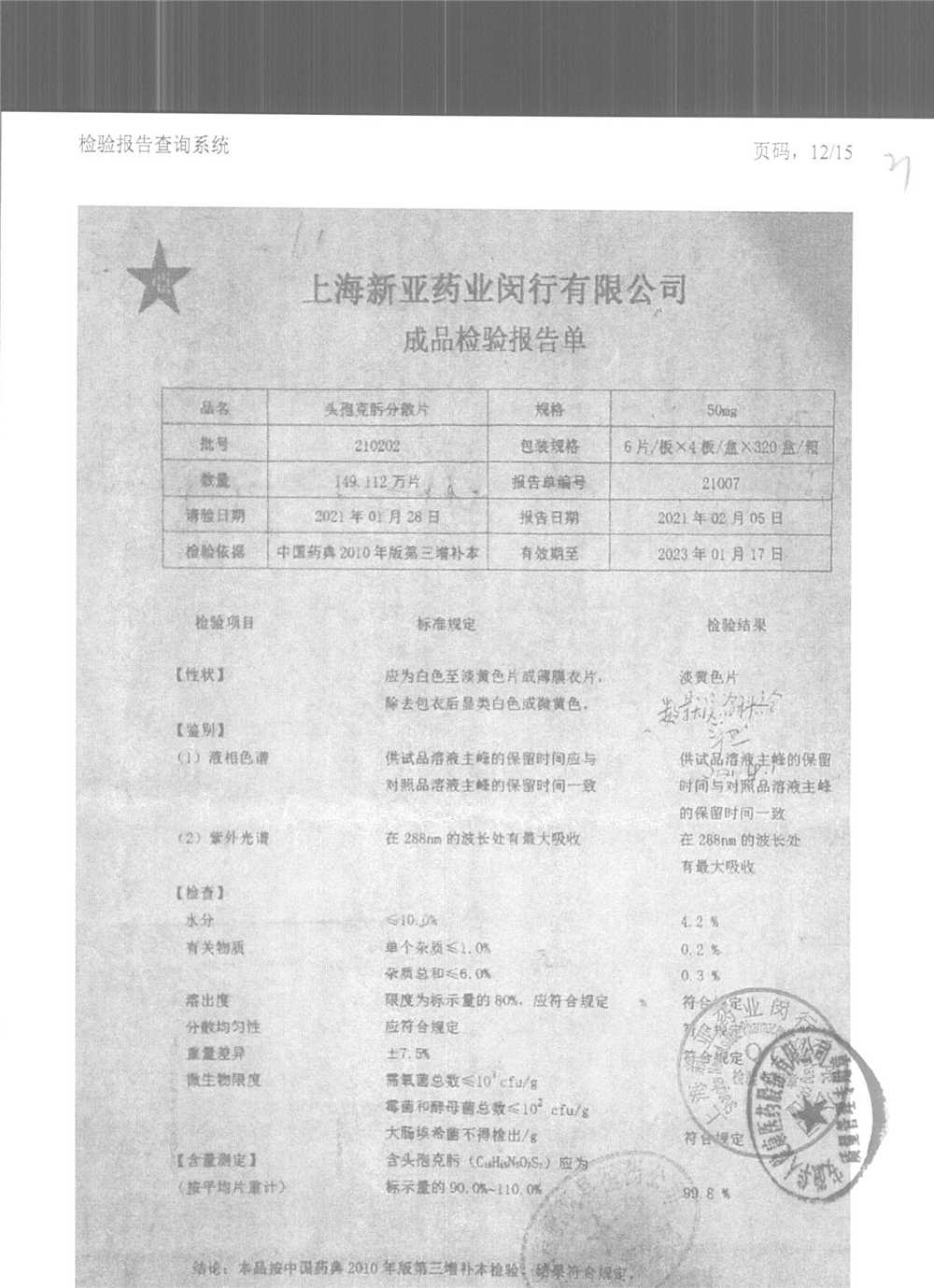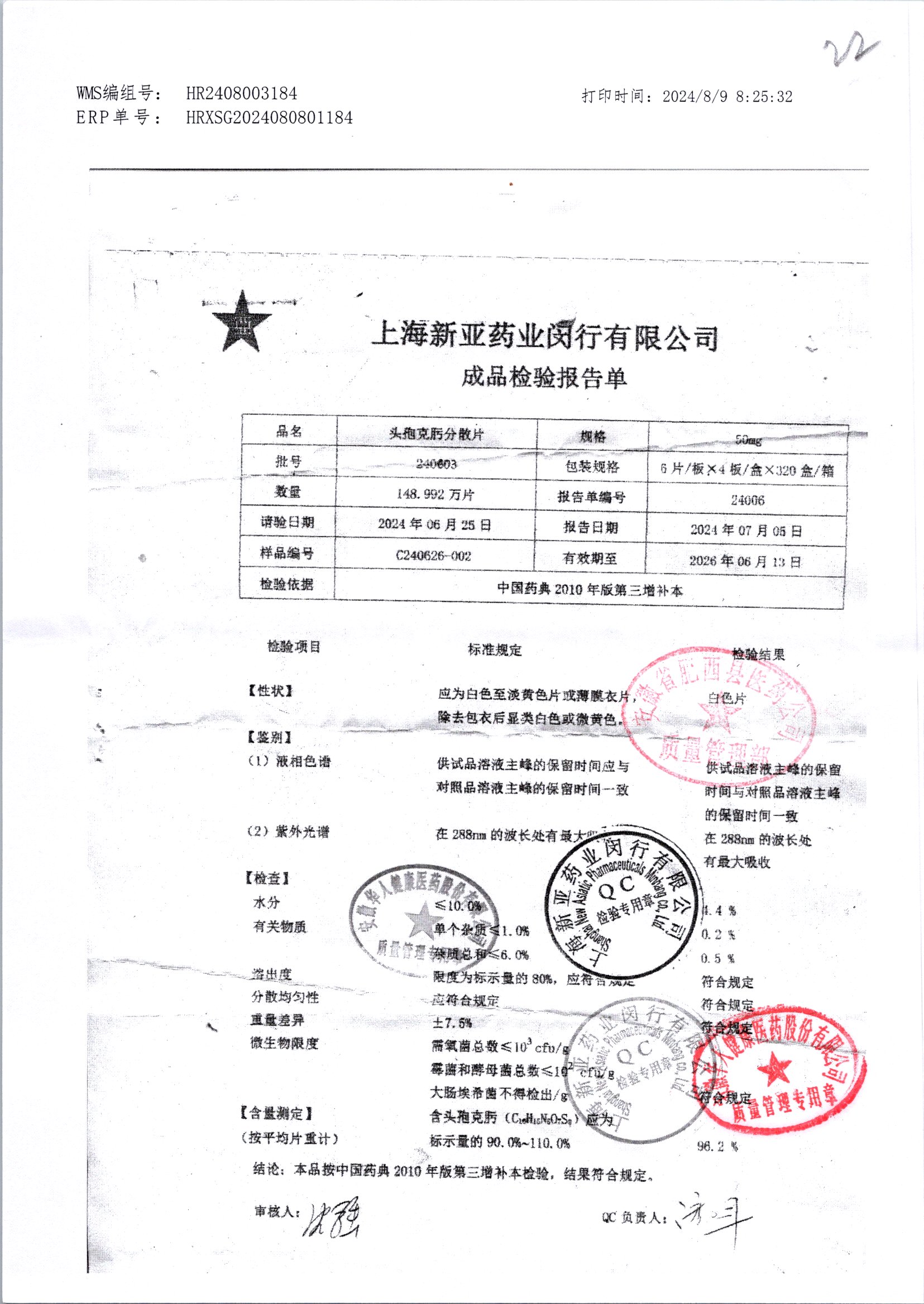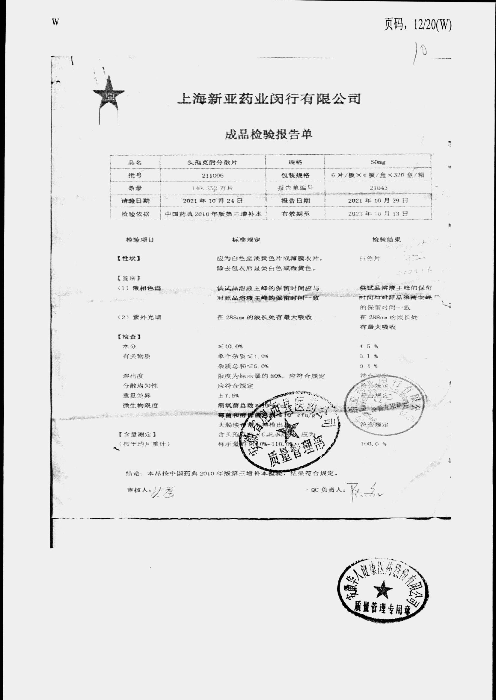 頭孢克肟分散片 | 50mg*24s | 210801 | 查看詳情 |