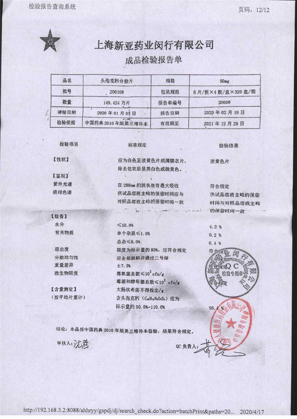 頭孢克肟分散片 | 50mg*24s | 210402 | 查看詳情 |