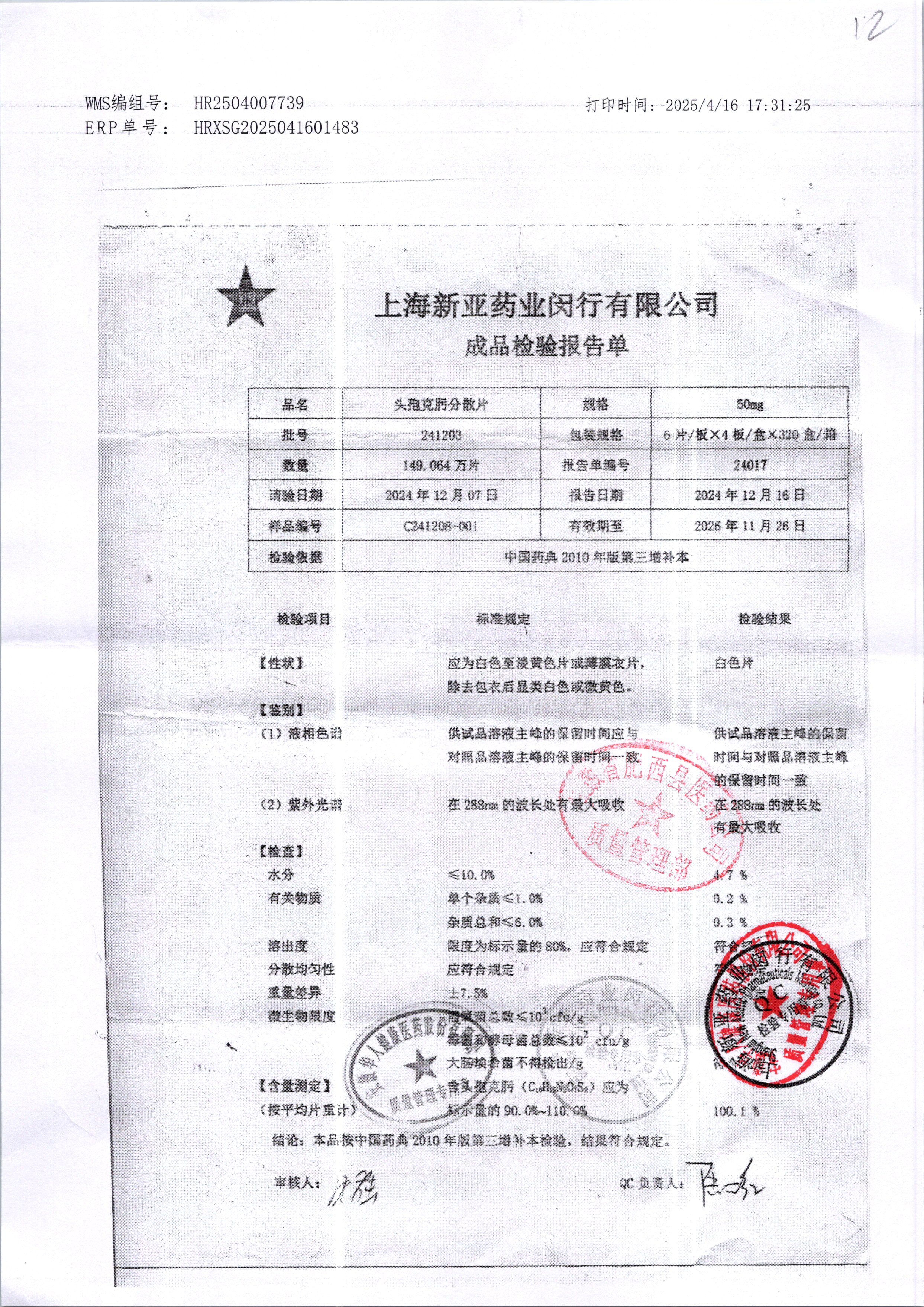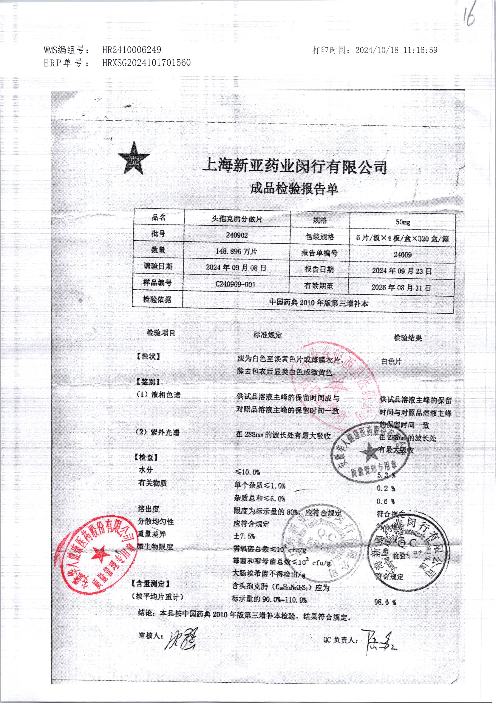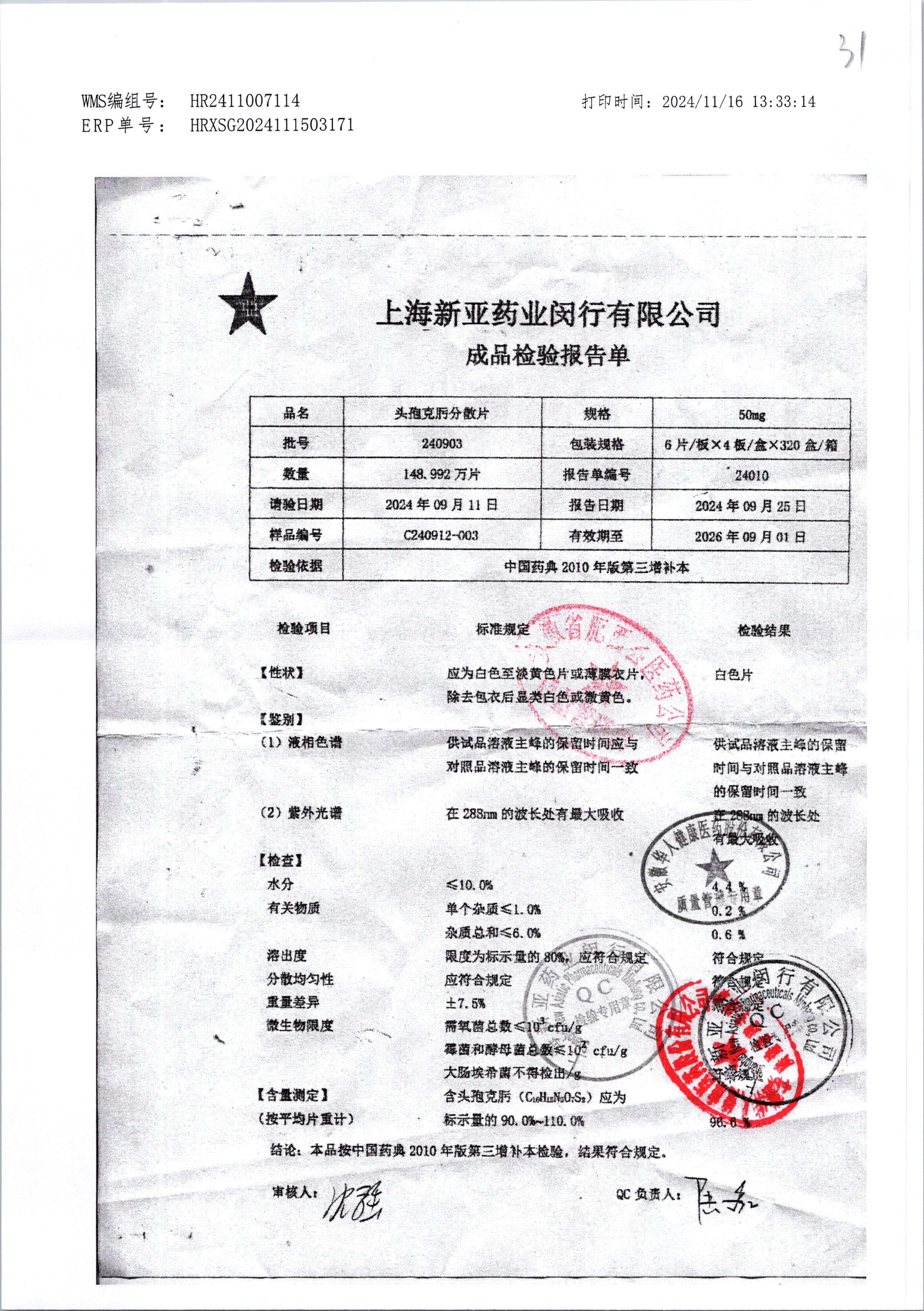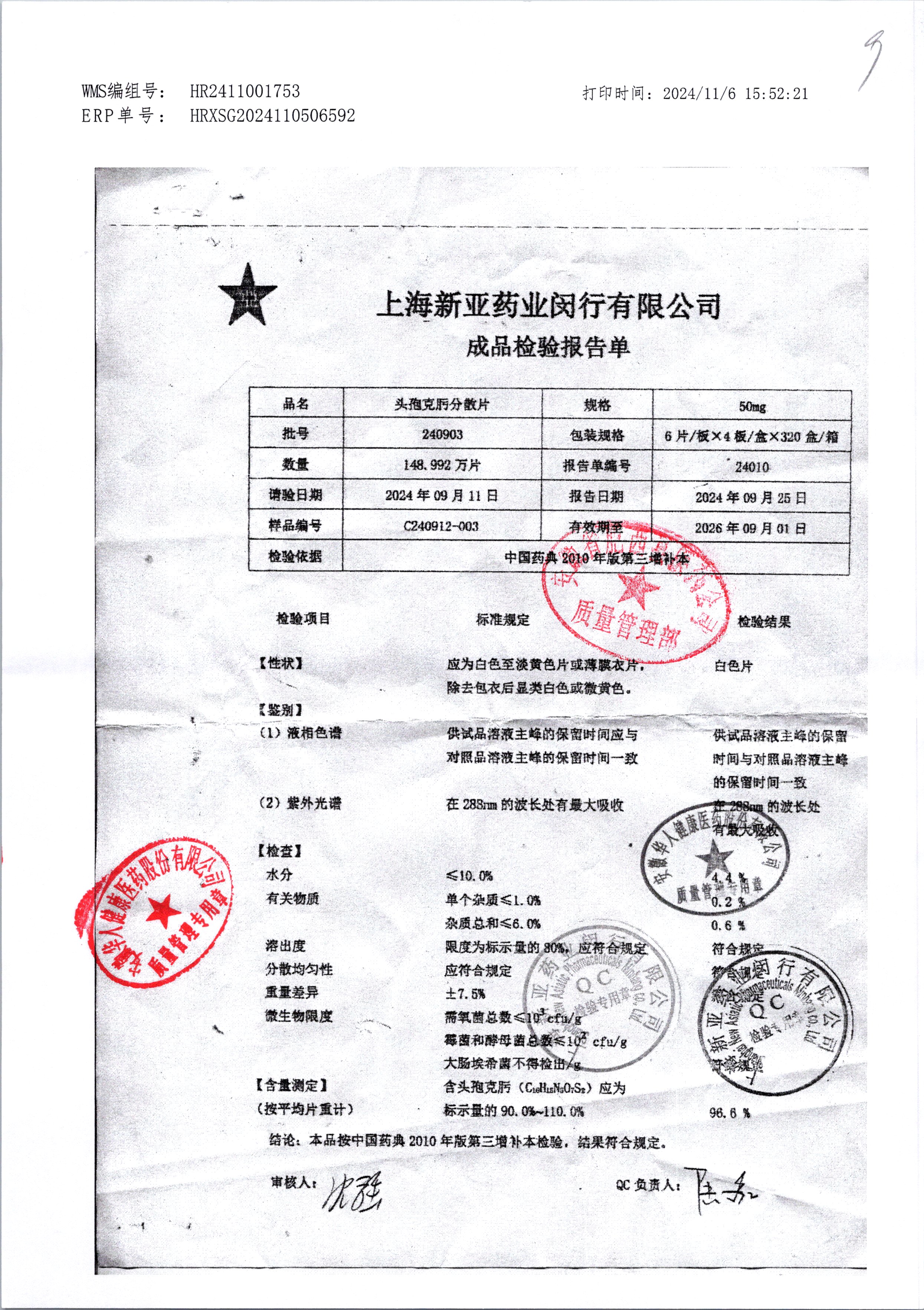 頭孢克肟分散片 | 50mg*24s | 241203 | 查看詳情 |