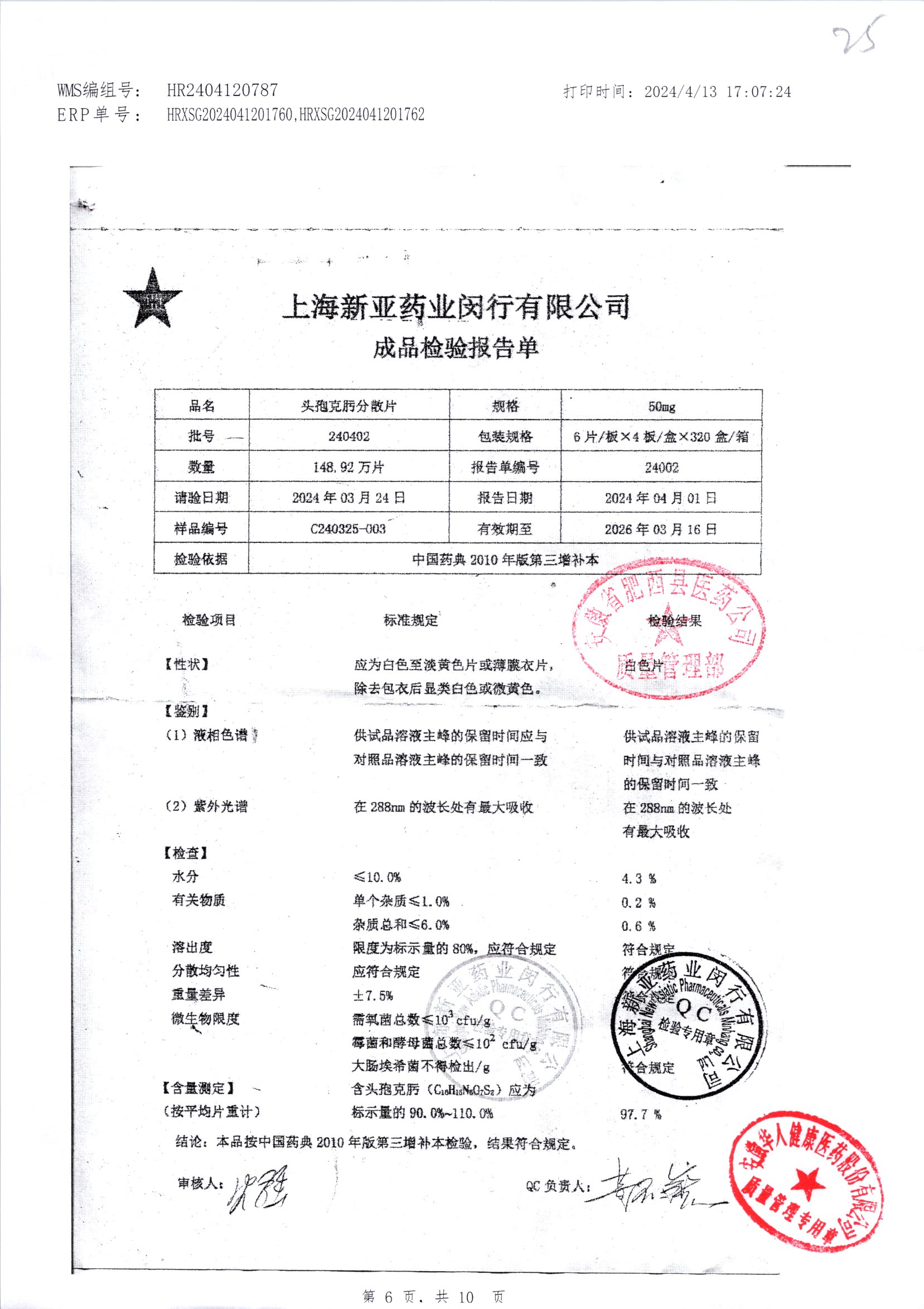 頭孢克肟分散片 | 50mg*24s | 240403 | 查看詳情 |