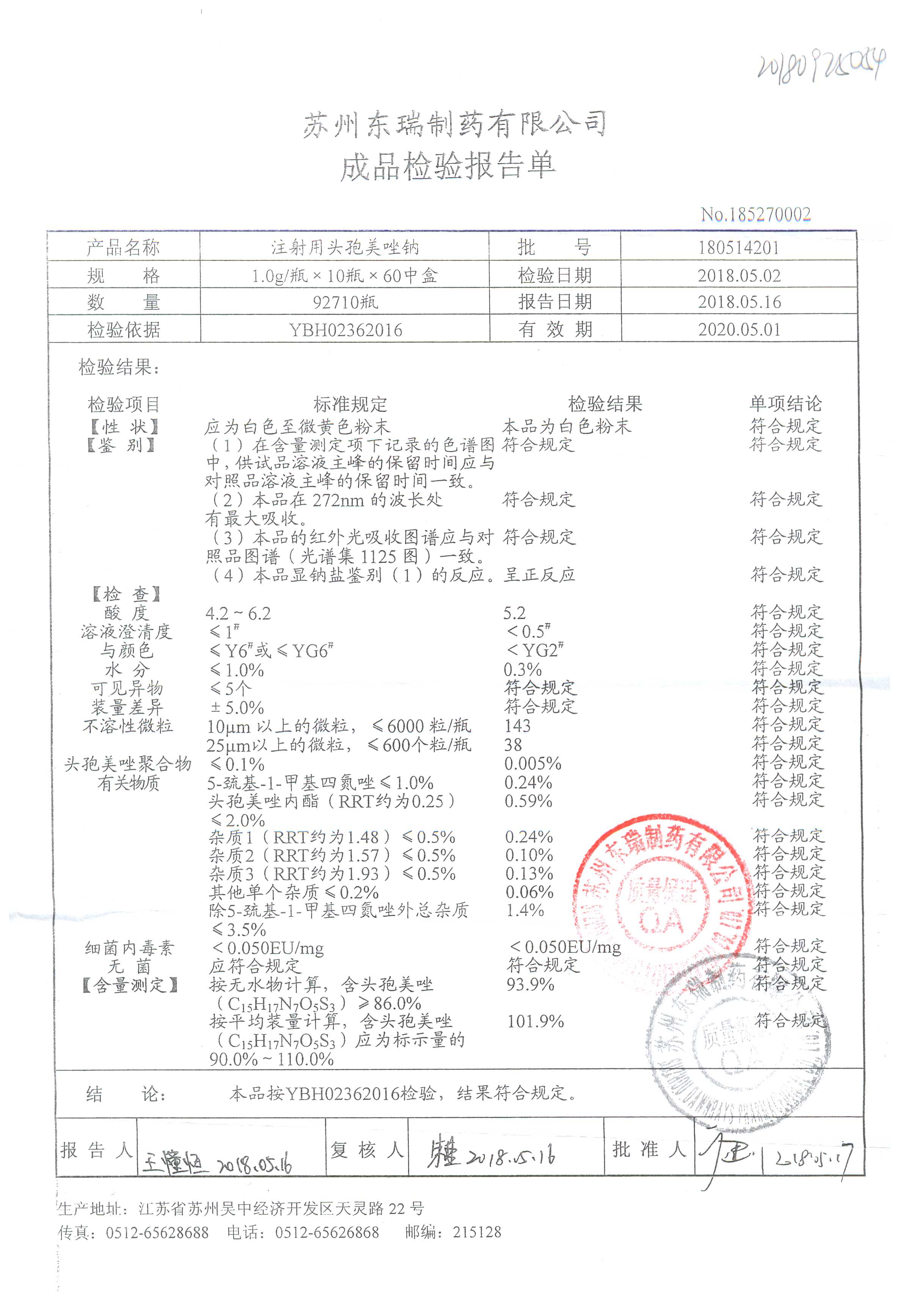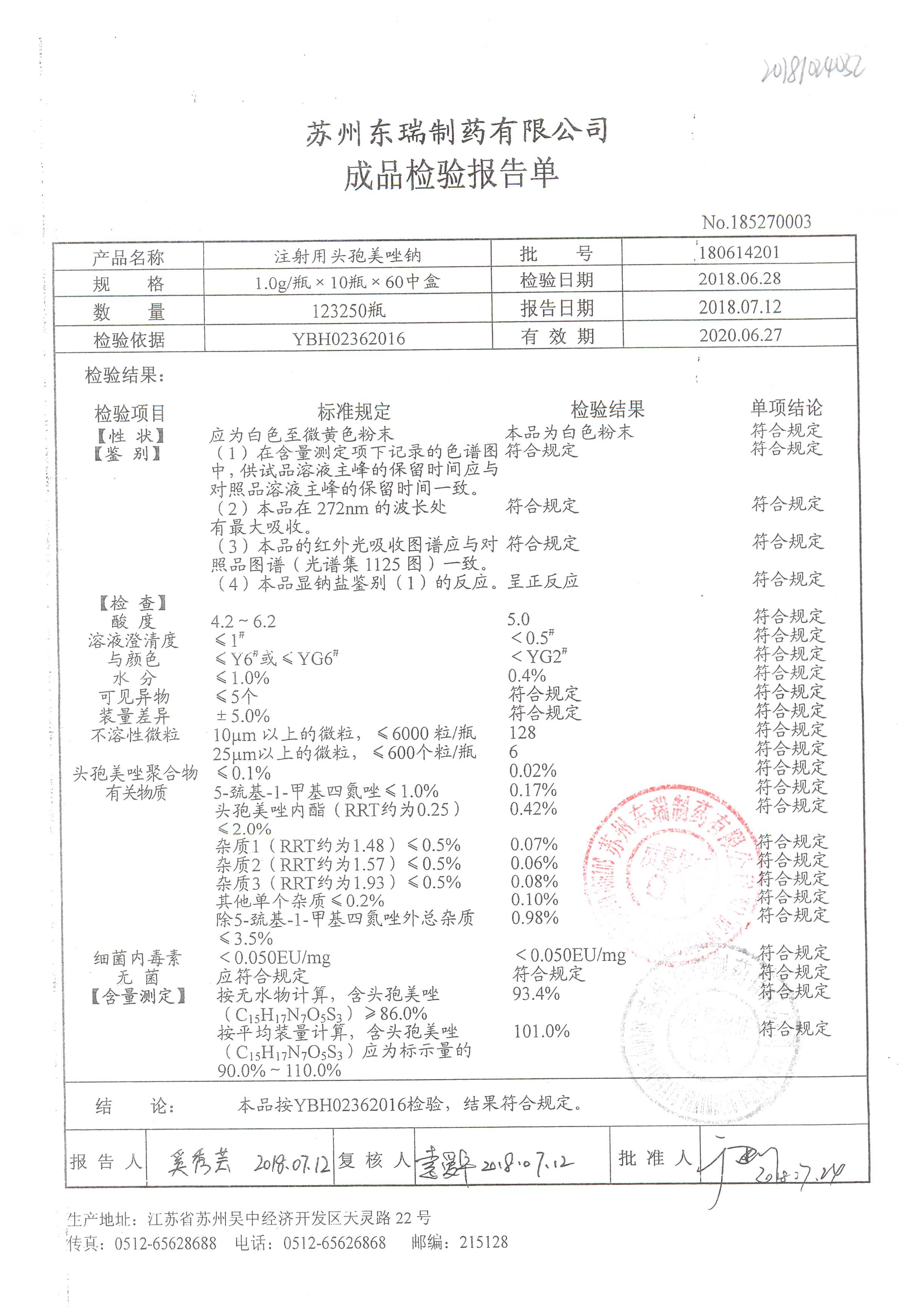 注射用頭孢美唑鈉 | 1g*10*60 | 180214201 | 查看詳情 |