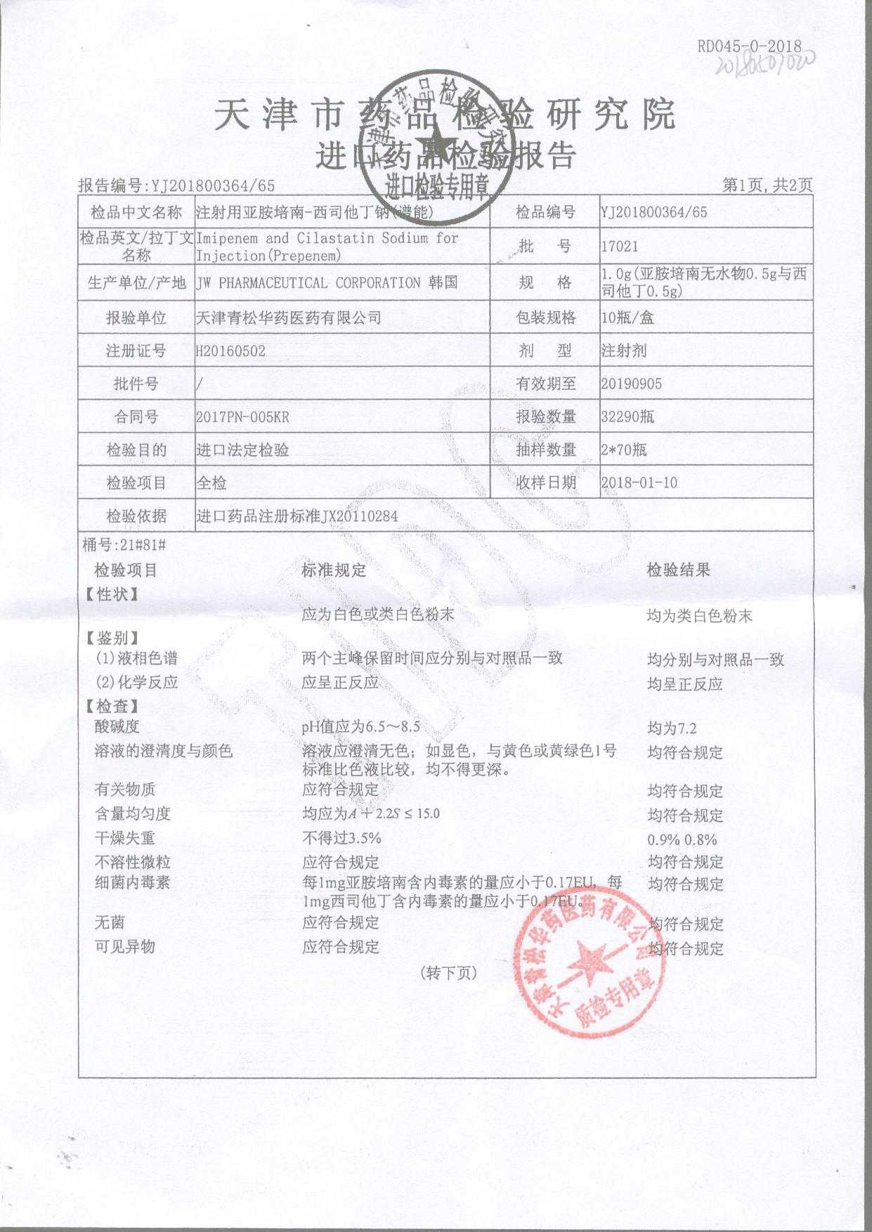 注射用亞胺培南-西司他丁鈉 | 1g*10瓶 | 17025(2/4) | 查看詳情 |