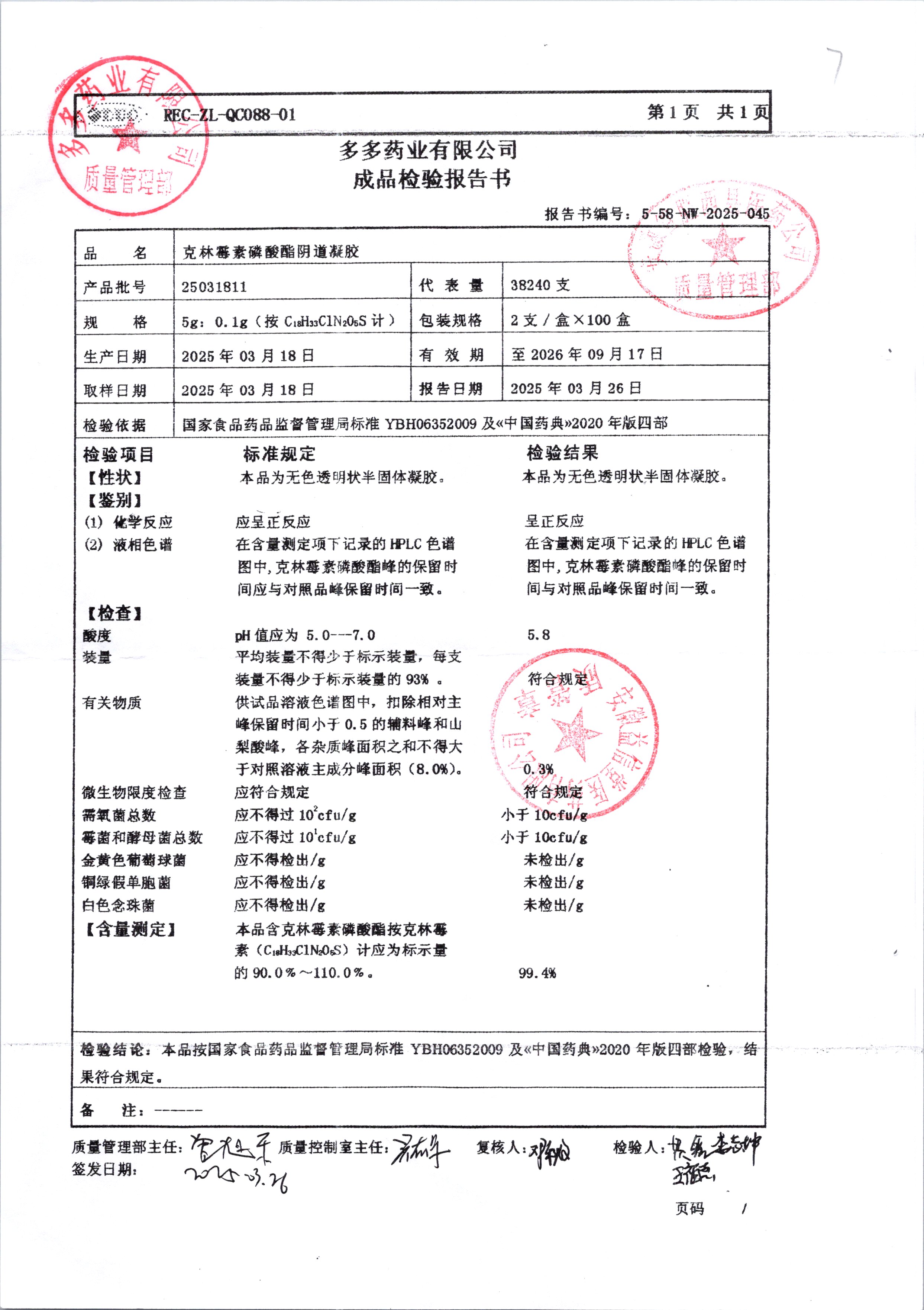 克林霉素磷酸酯陰道凝膠 | 5g:0.1g | 25081711 | 查看詳情 |