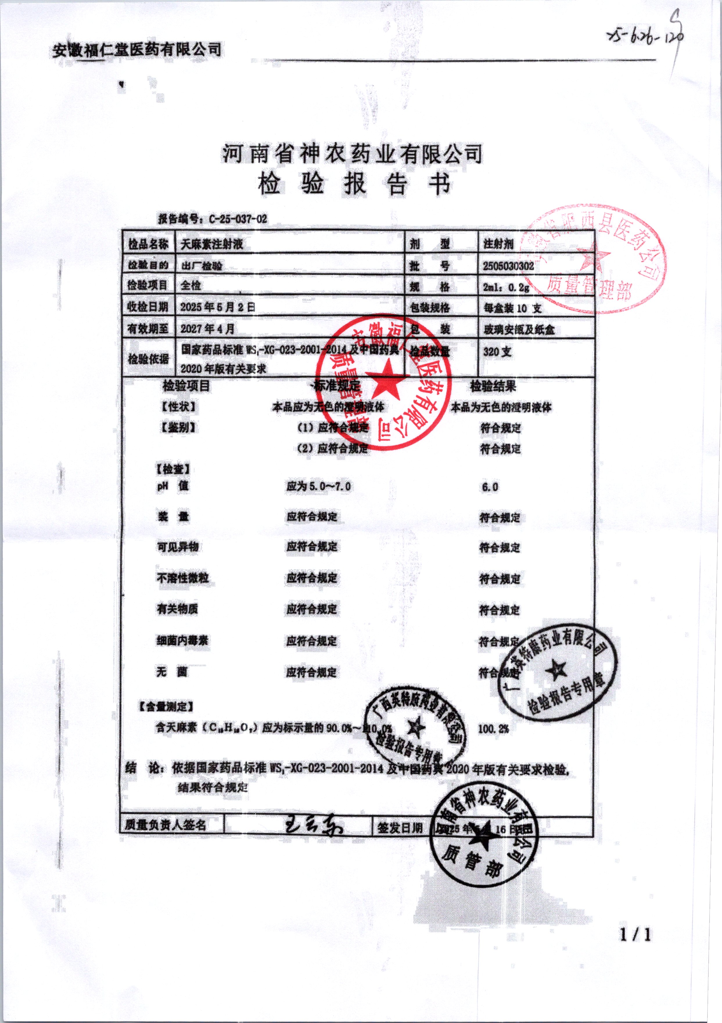 天麻素注射液 2ml:0.2g 2505030302 查看詳情