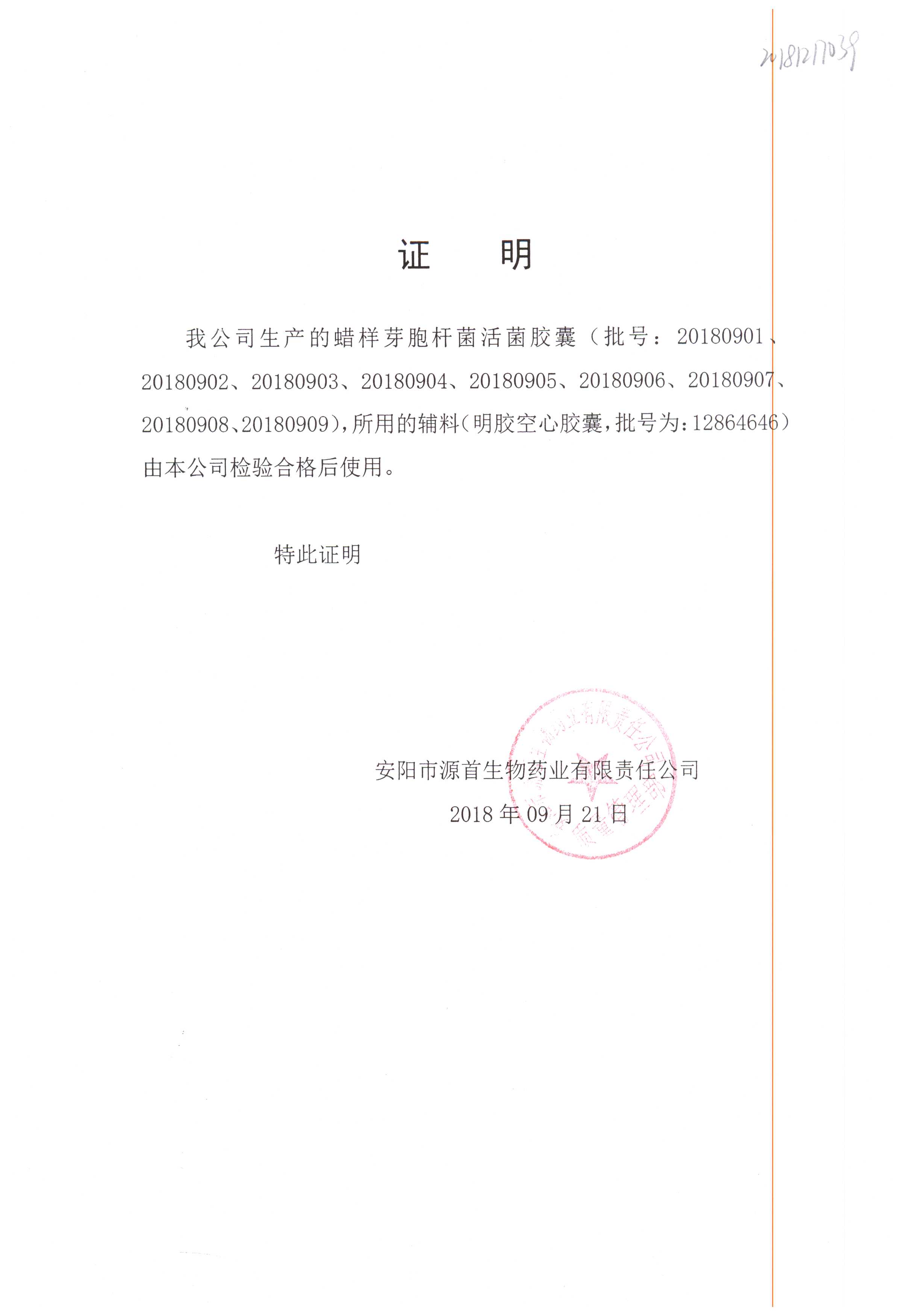 蠟樣芽孢桿菌活菌膠囊(源首) | 0.25g | 20180907(2/3) | 查看詳情 |
