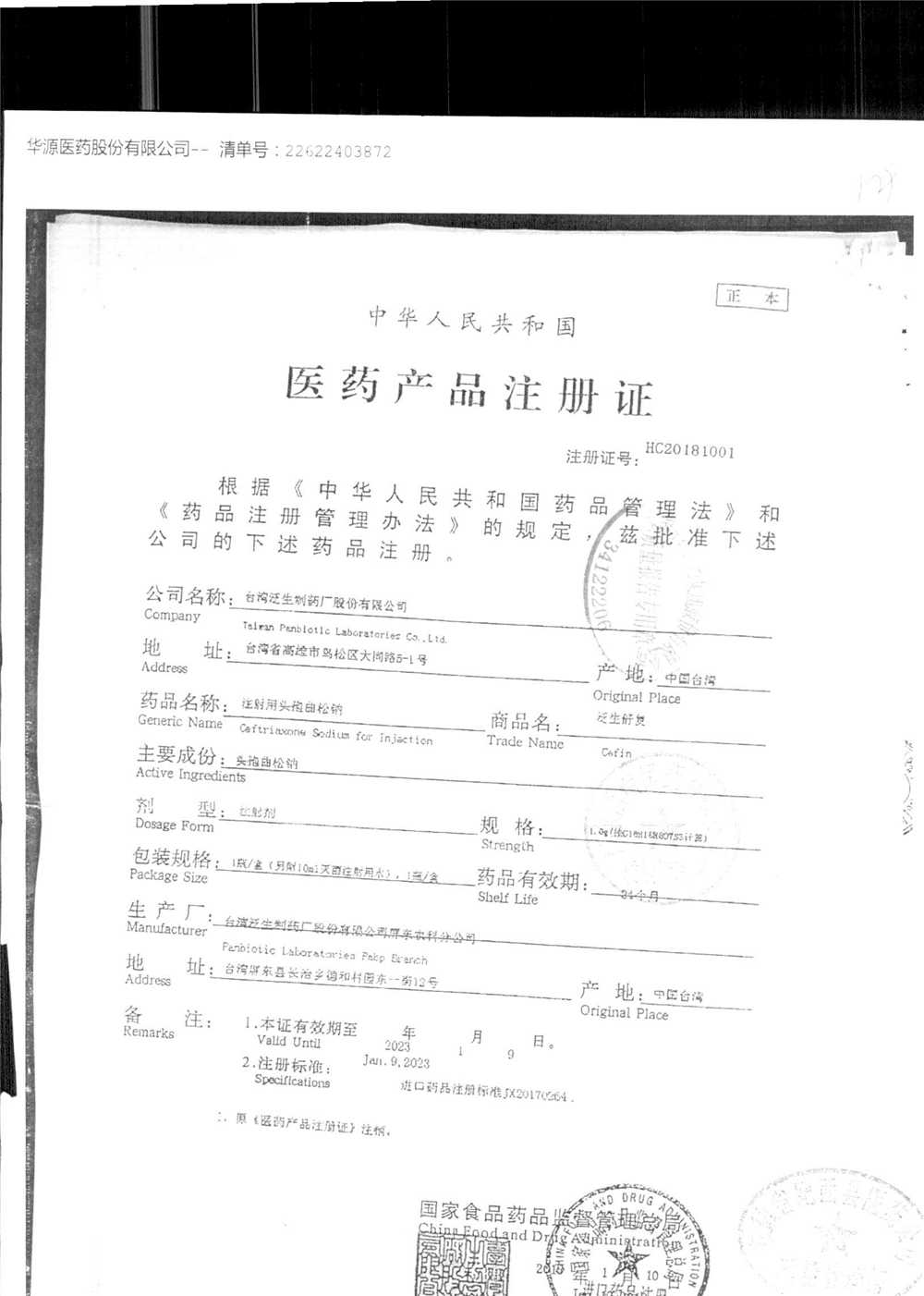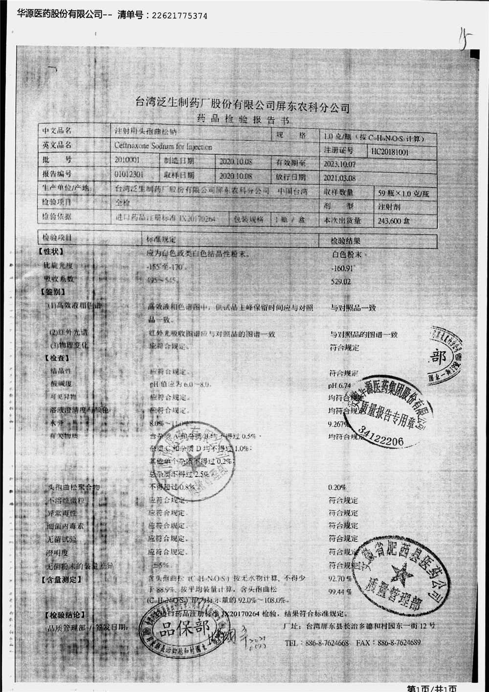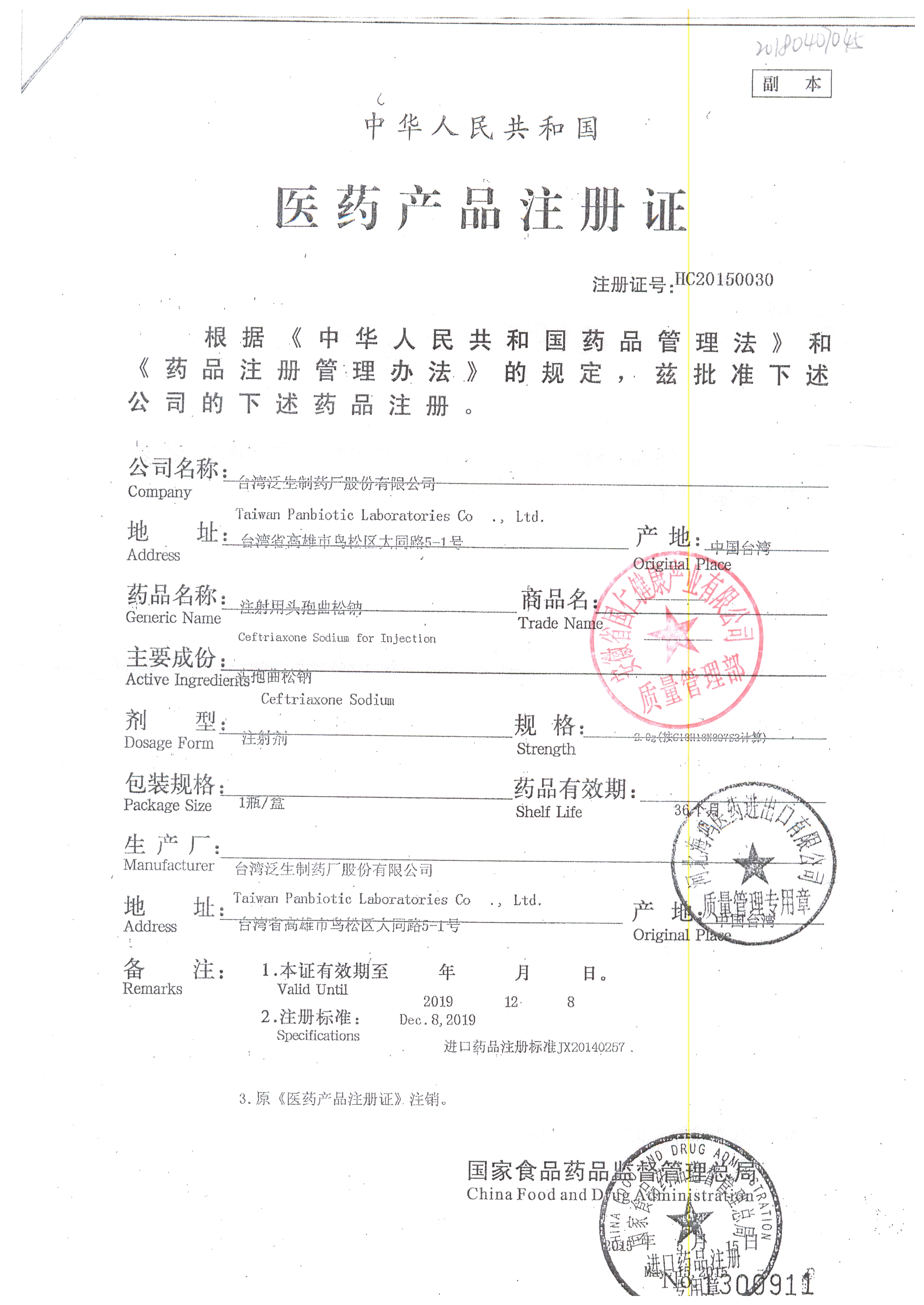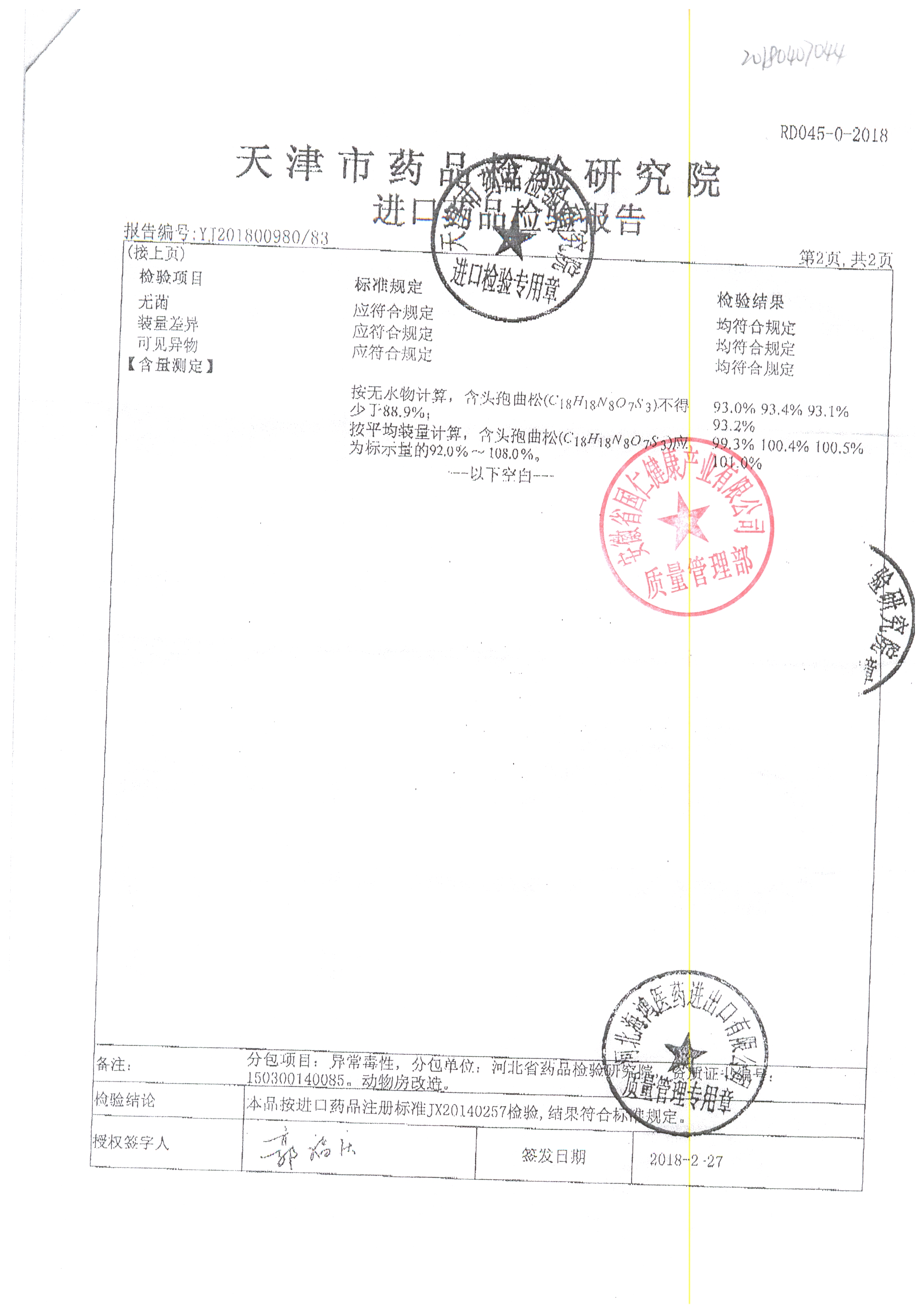 注射用頭孢曲松鈉 | 2.0g | 1903007(4/5) | 查看詳情 |