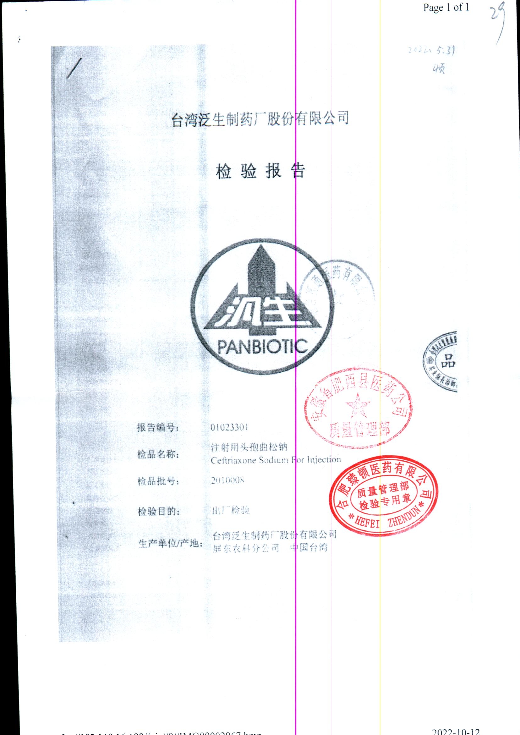 注射用頭孢曲松鈉 | 2.0g | 1712006(3/4) | 查看詳情 |