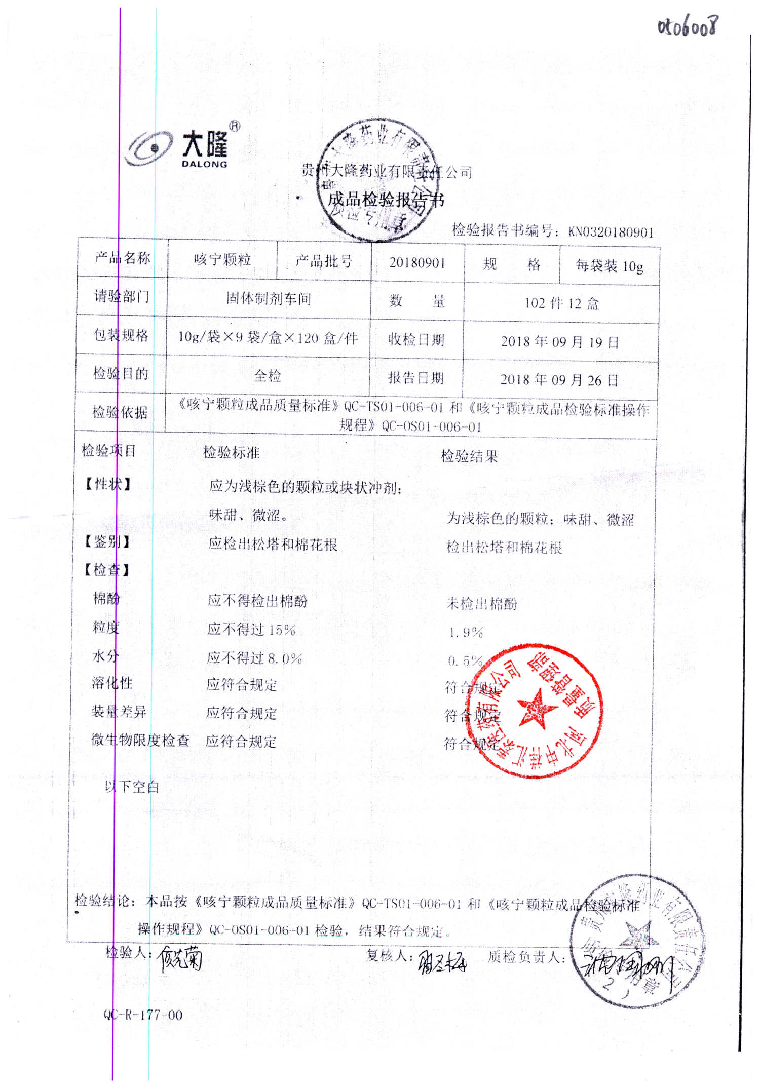 咳寧顆粒 | 10g*9袋 | 20180102 | 查看詳情 |