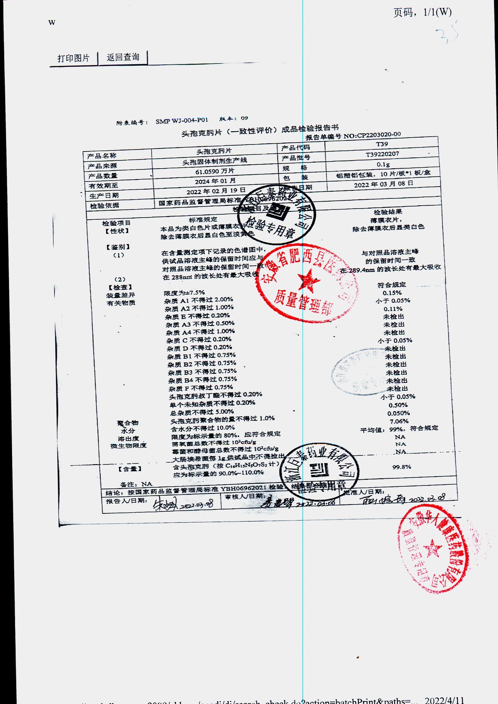 頭孢克肟片 | 0.1g*10s | T24201101 | 查看詳情 |