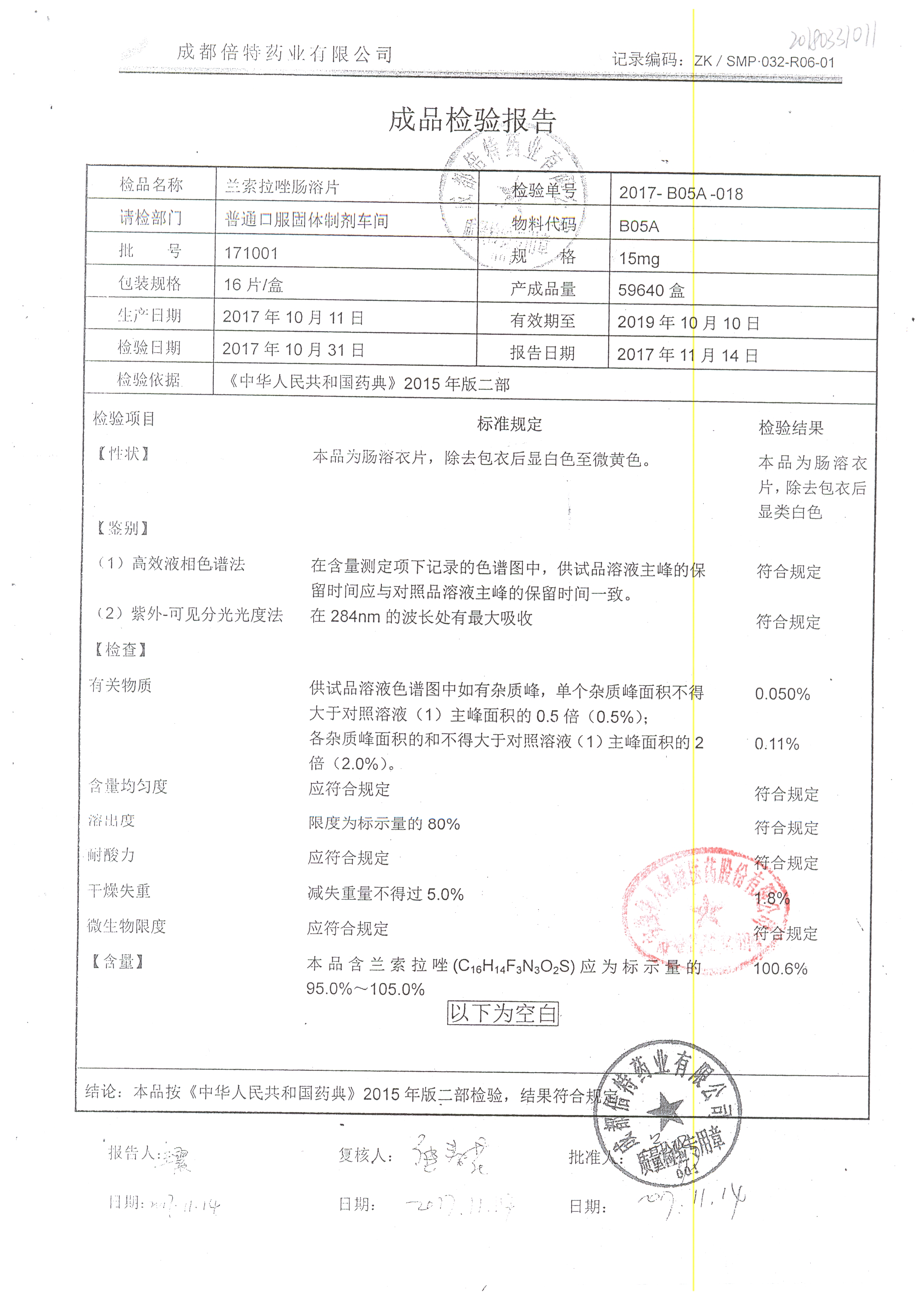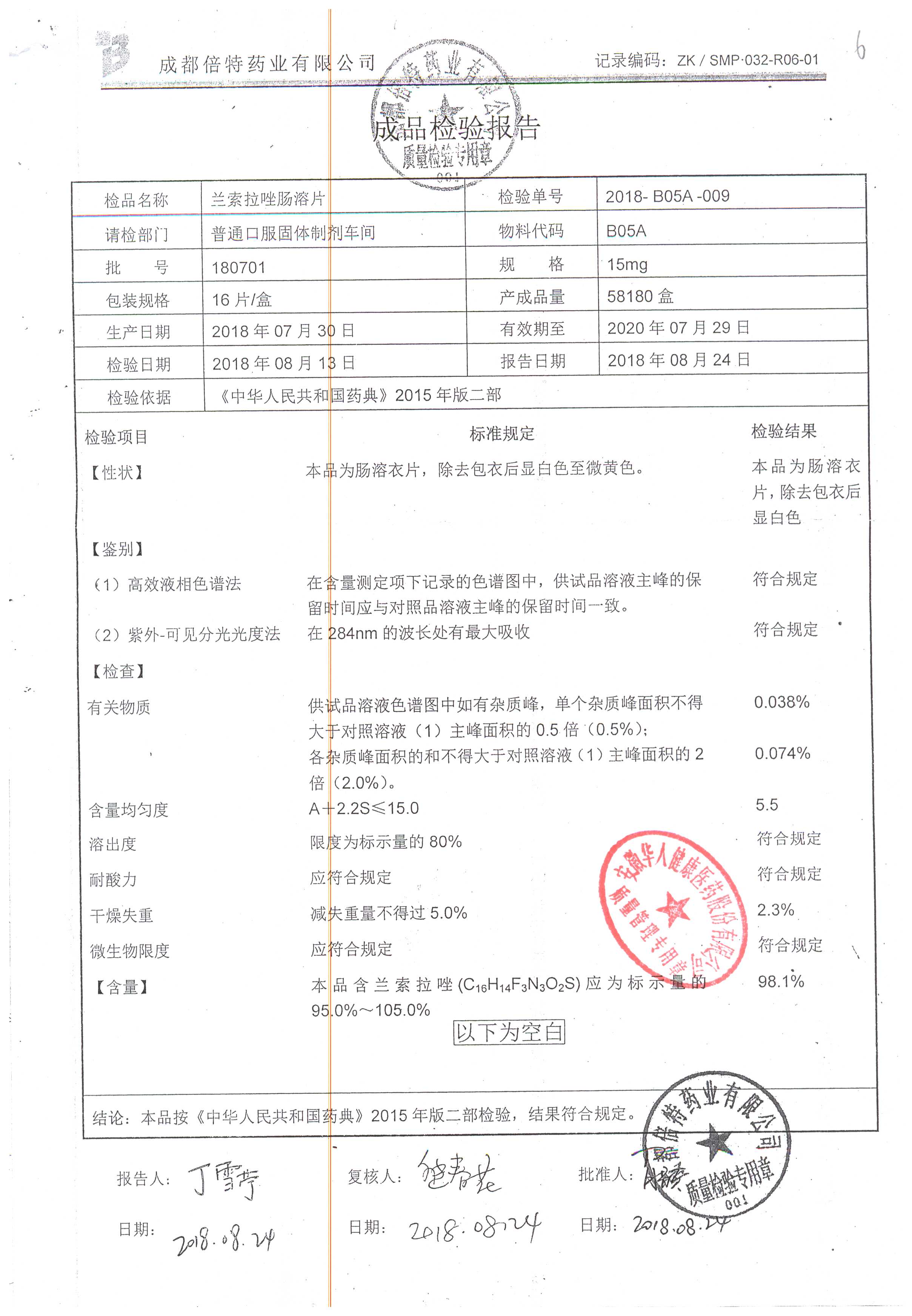 蘭索拉唑腸溶片 | 15mg*16s | 180401 | 查看詳情 |