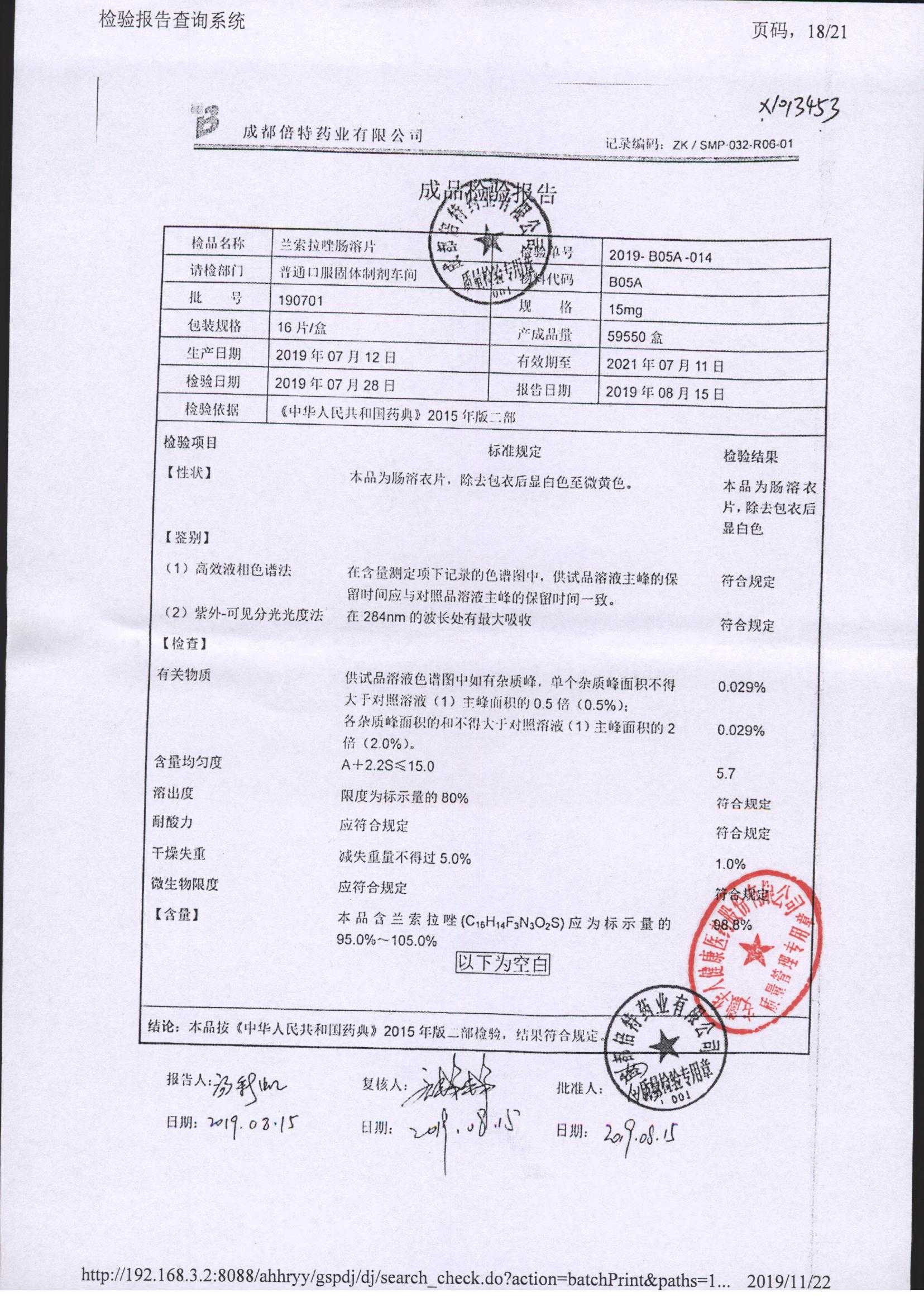 蘭索拉唑腸溶片 | 15mg*16s | 190403 | 查看詳情 |