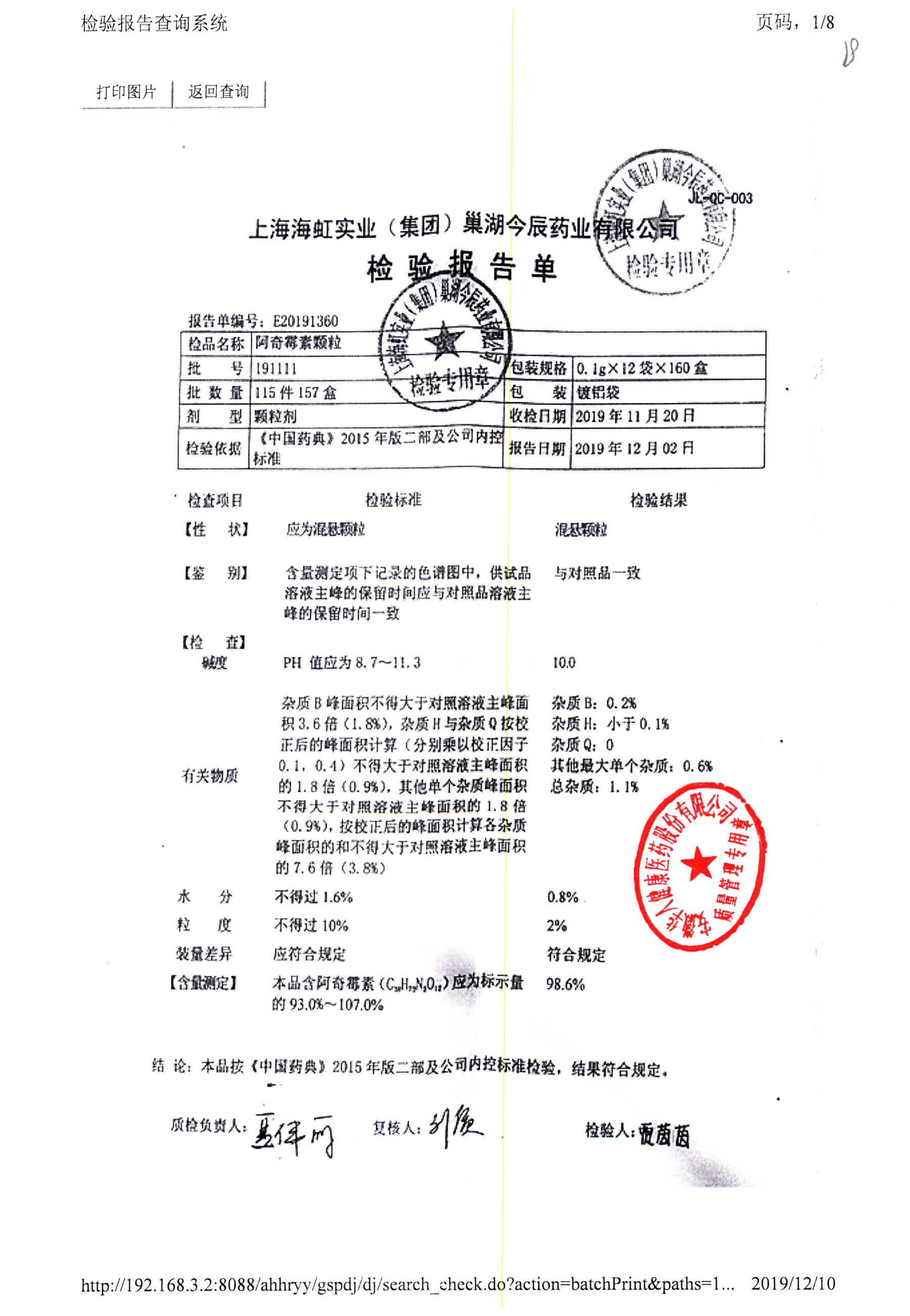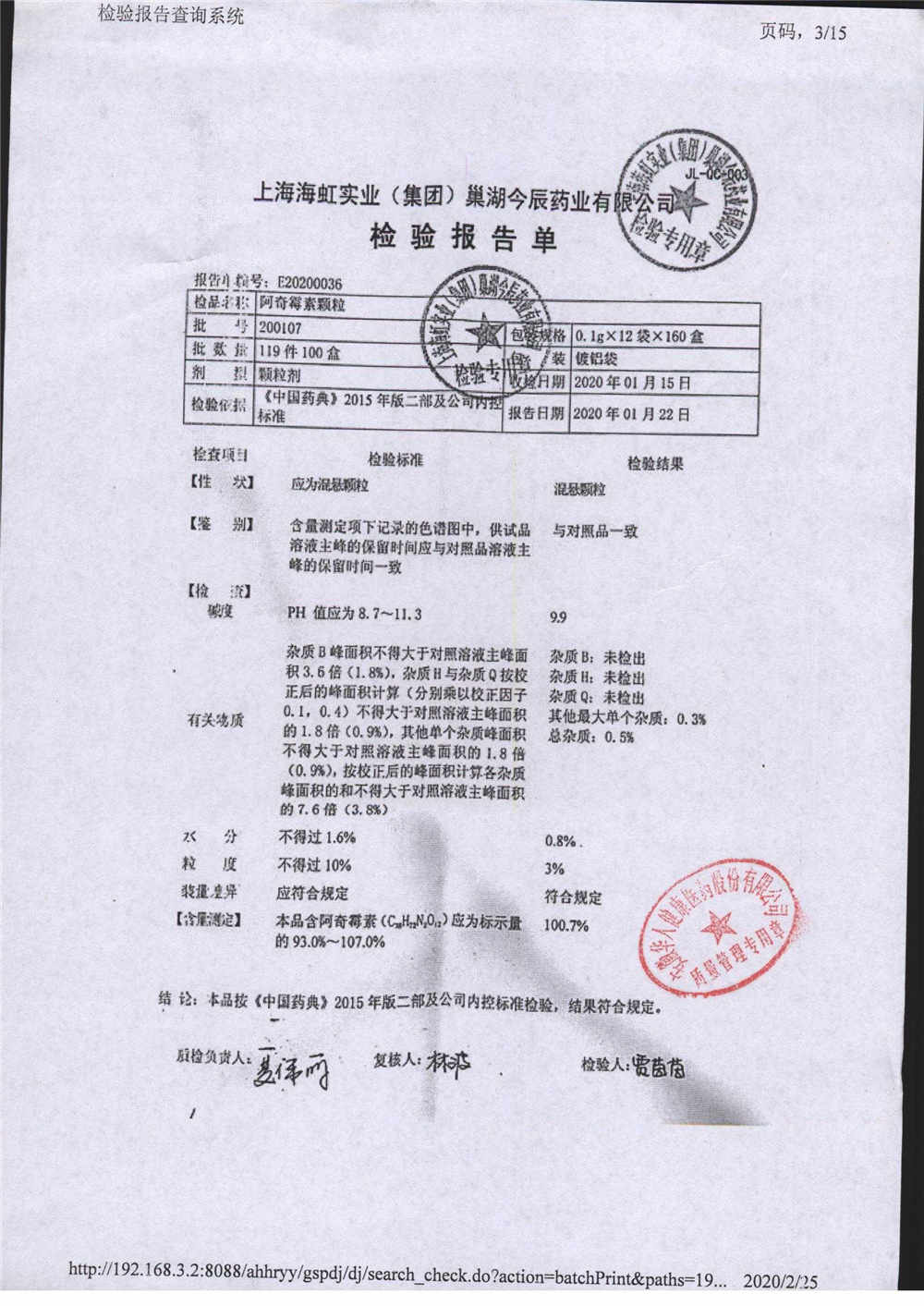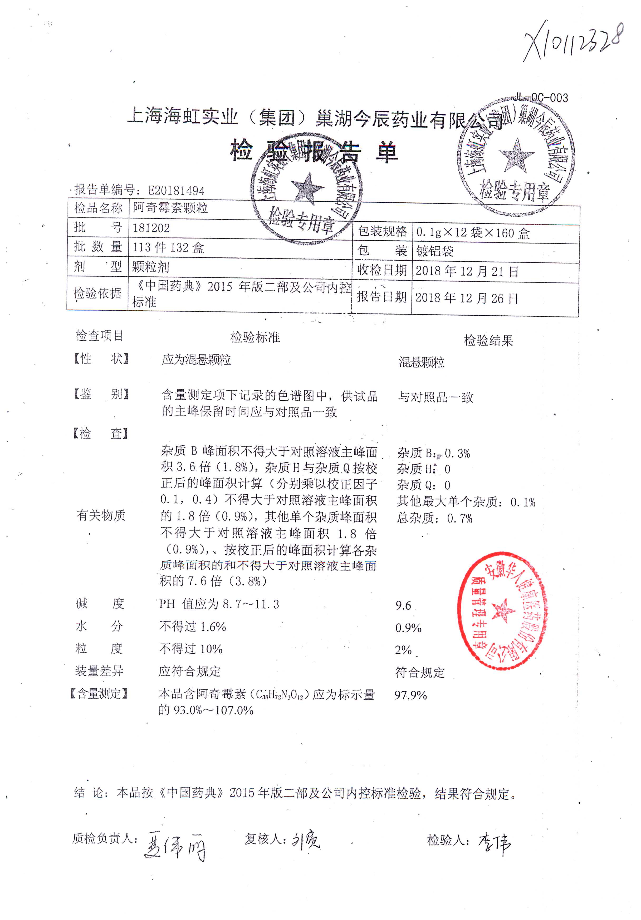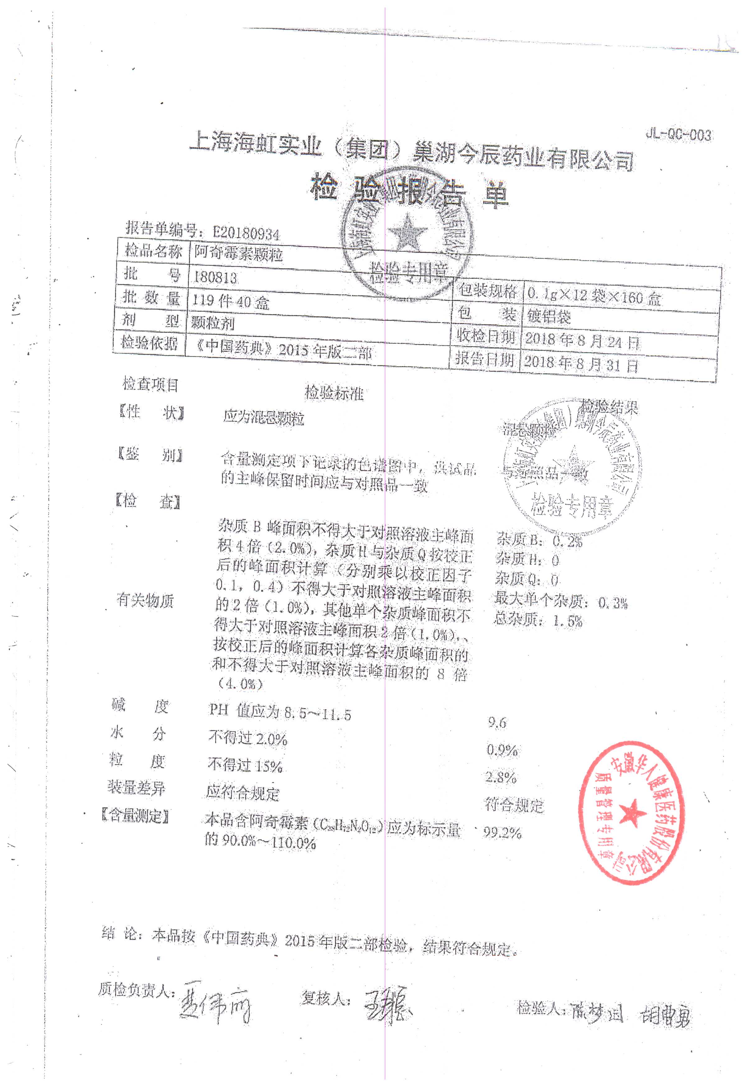 阿奇霉素顆粒 | 0.1g-12袋 | 190218 | 查看詳情 |