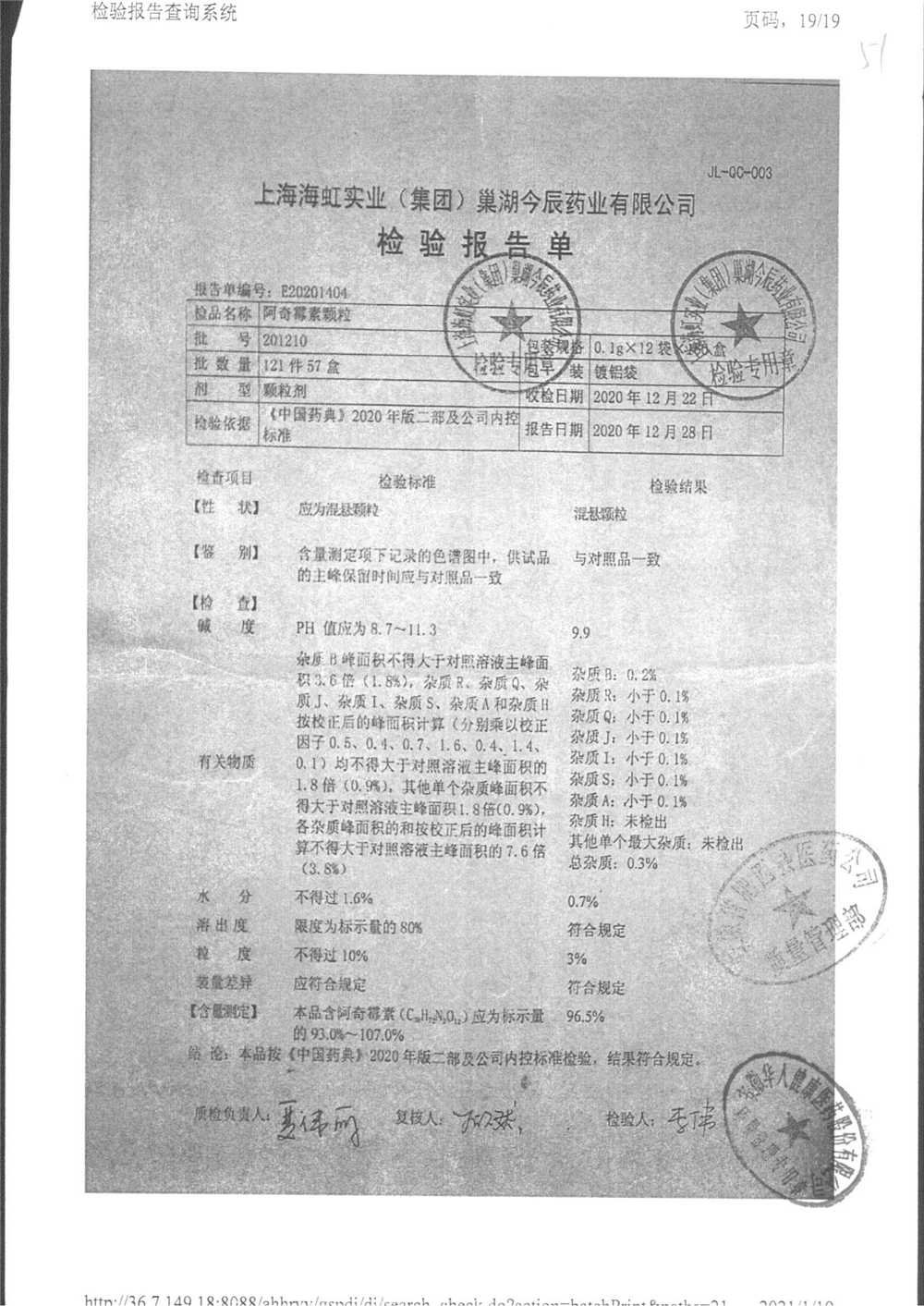 阿奇霉素顆粒 | 0.1g-12袋 | 190226 | 查看詳情 |