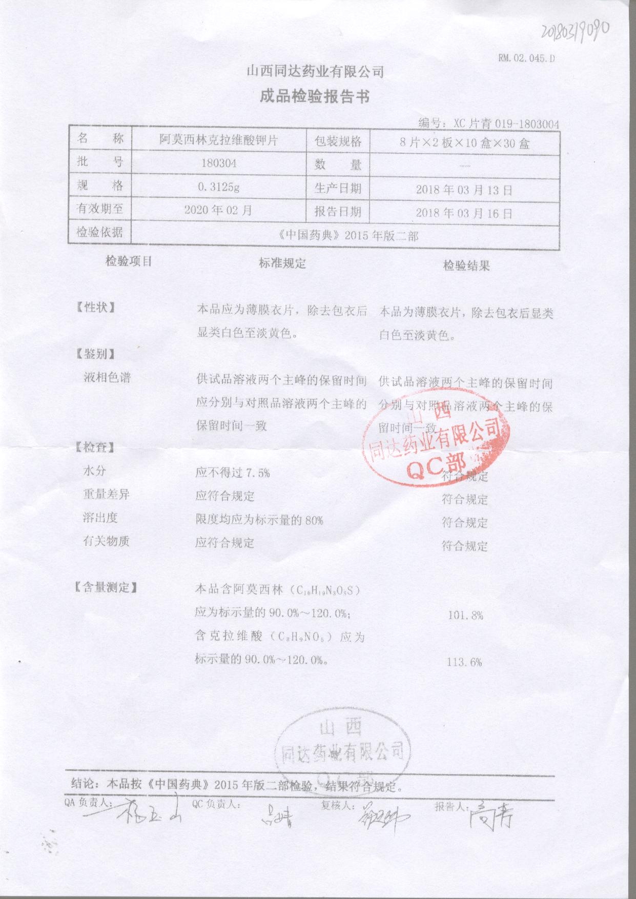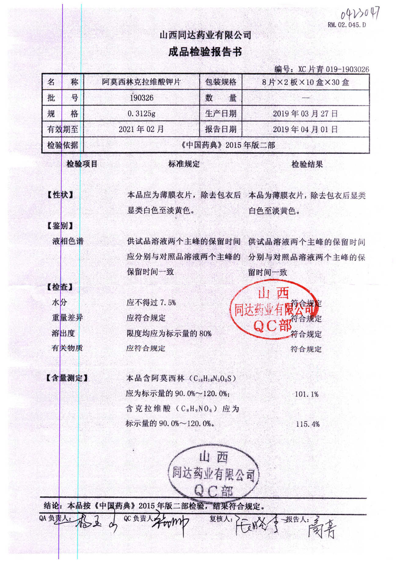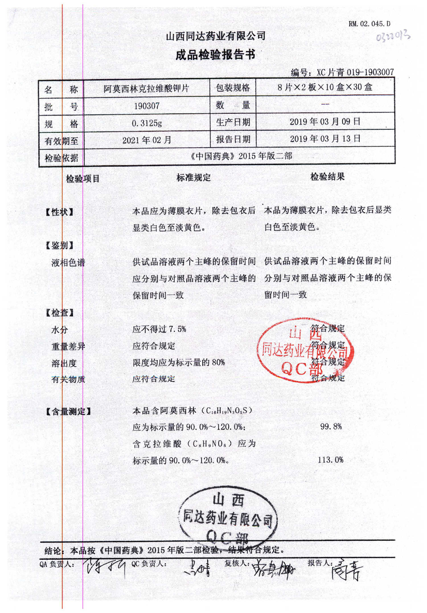 阿莫西林克拉維酸鉀片 | 0.3125g*16s | 190326 | 查看詳情 |
