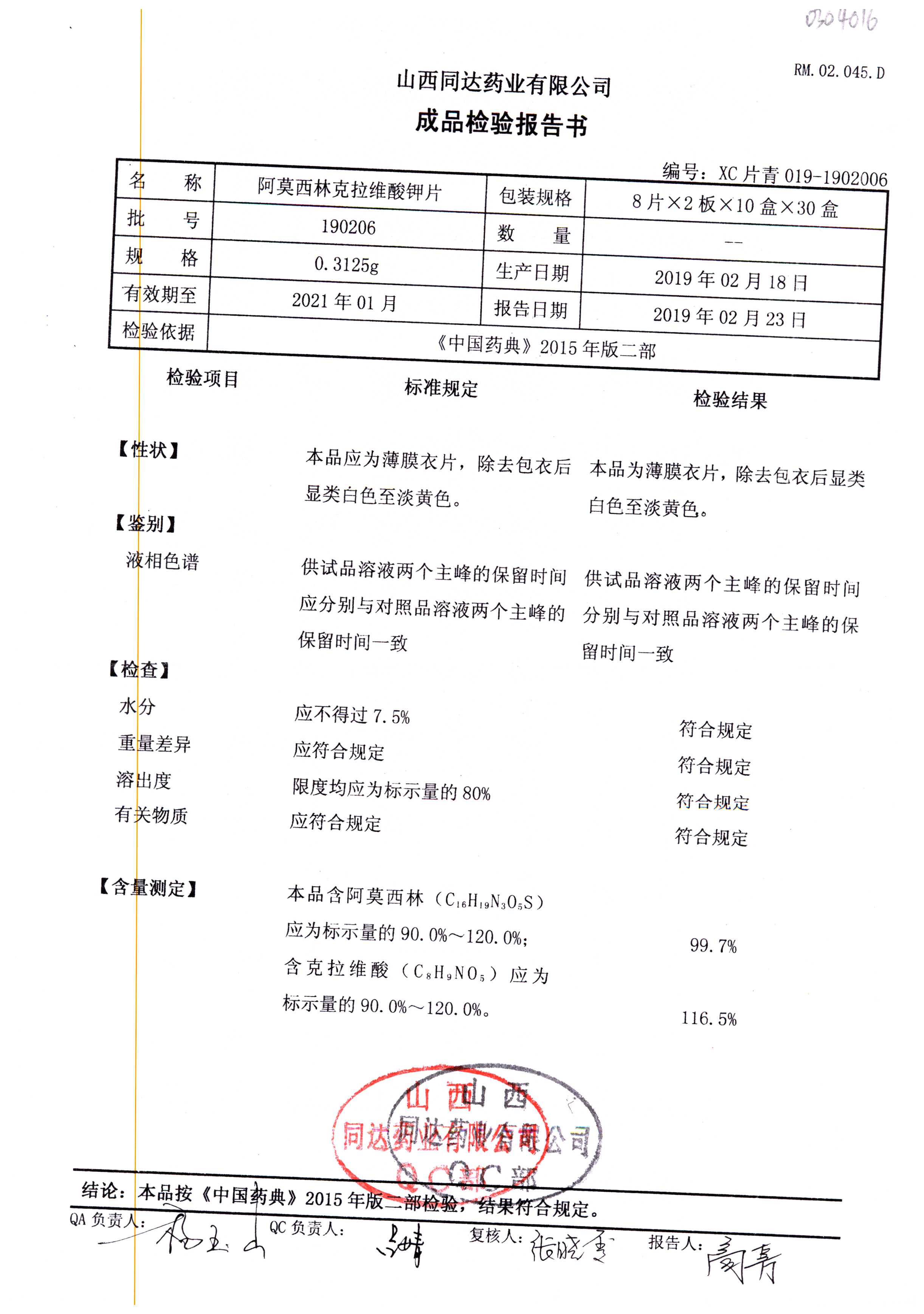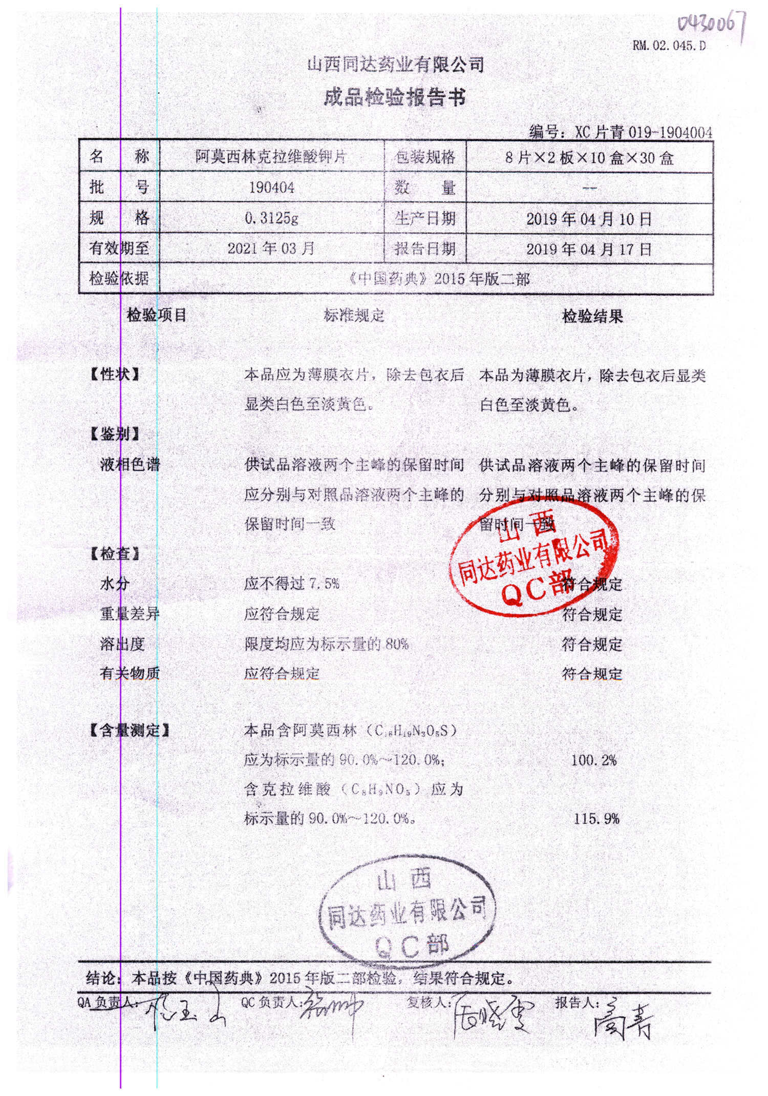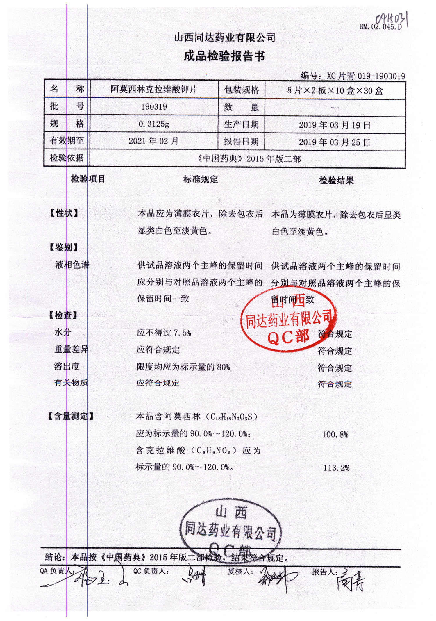 阿莫西林克拉維酸鉀片 | 0.3125g*16s | 190326 | 查看詳情 |