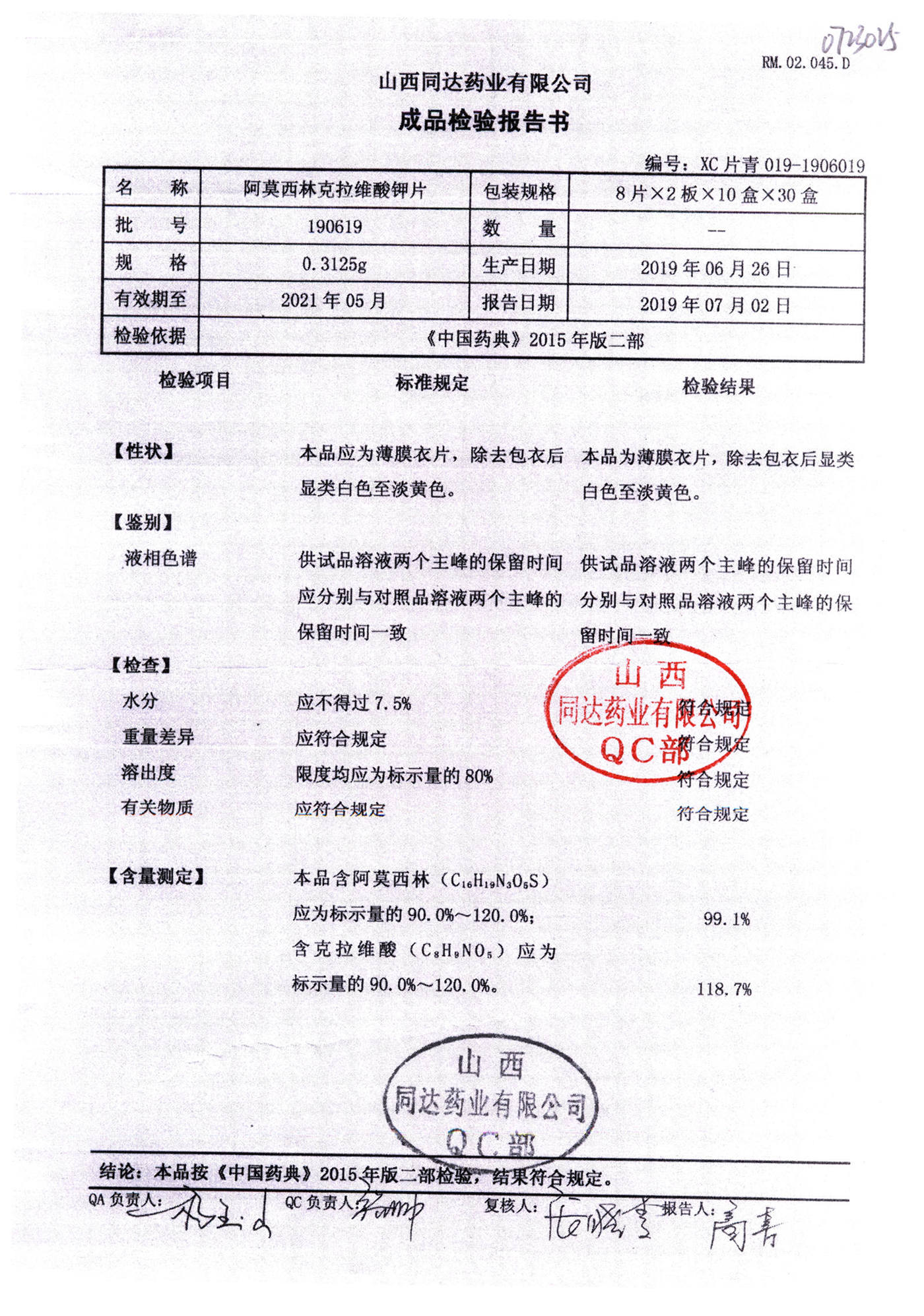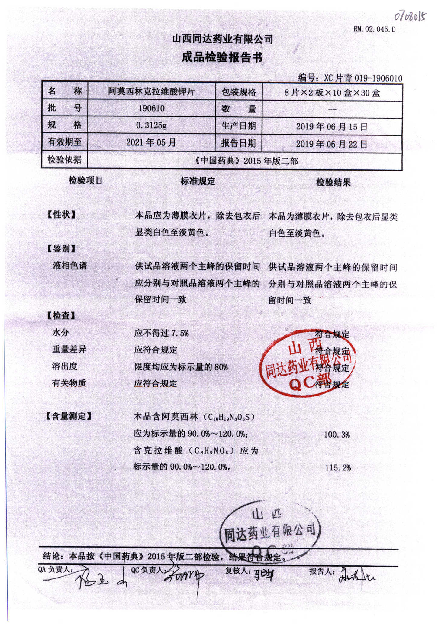 阿莫西林克拉維酸鉀片 | 0.3125g*16s | 190701 | 查看詳情 |