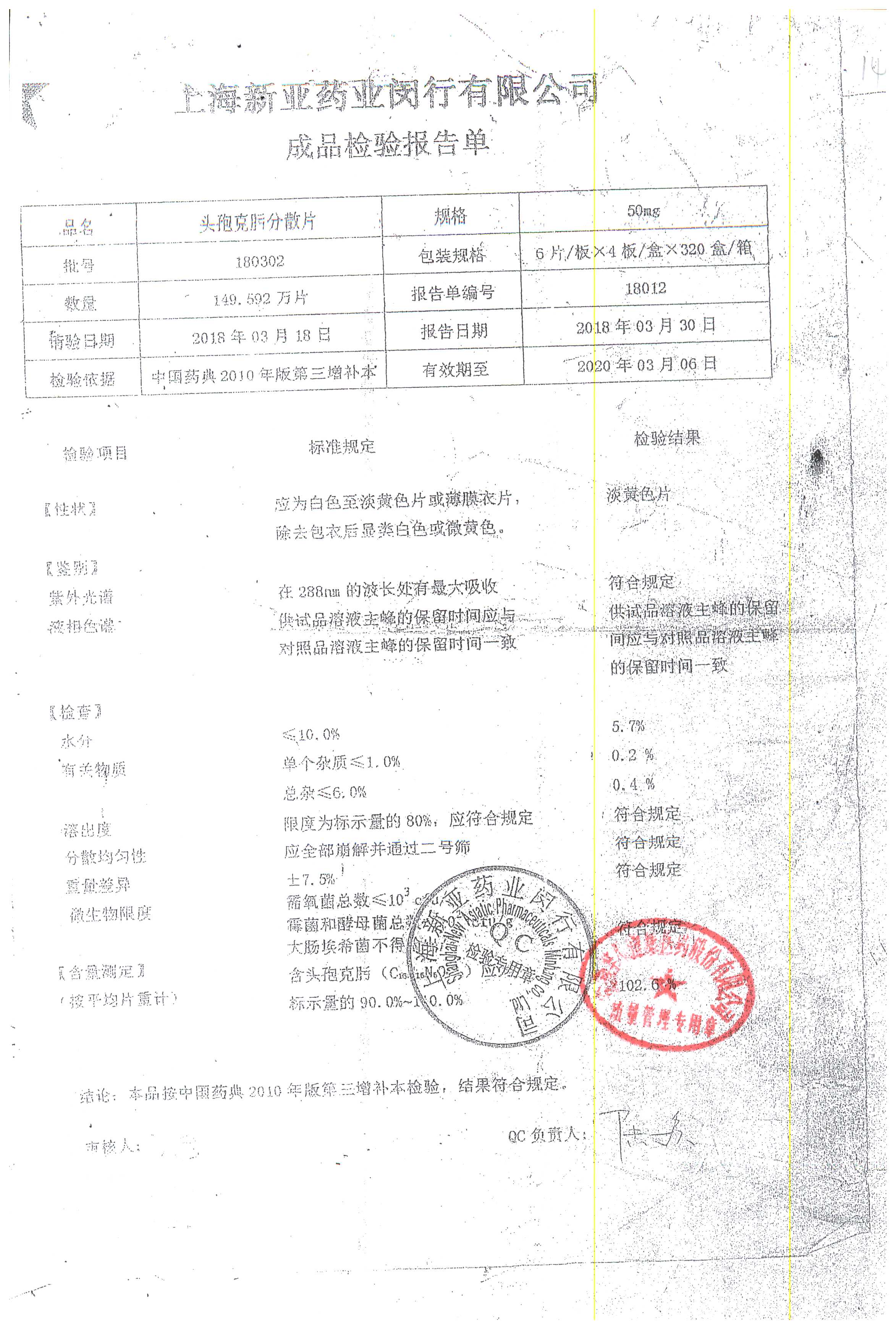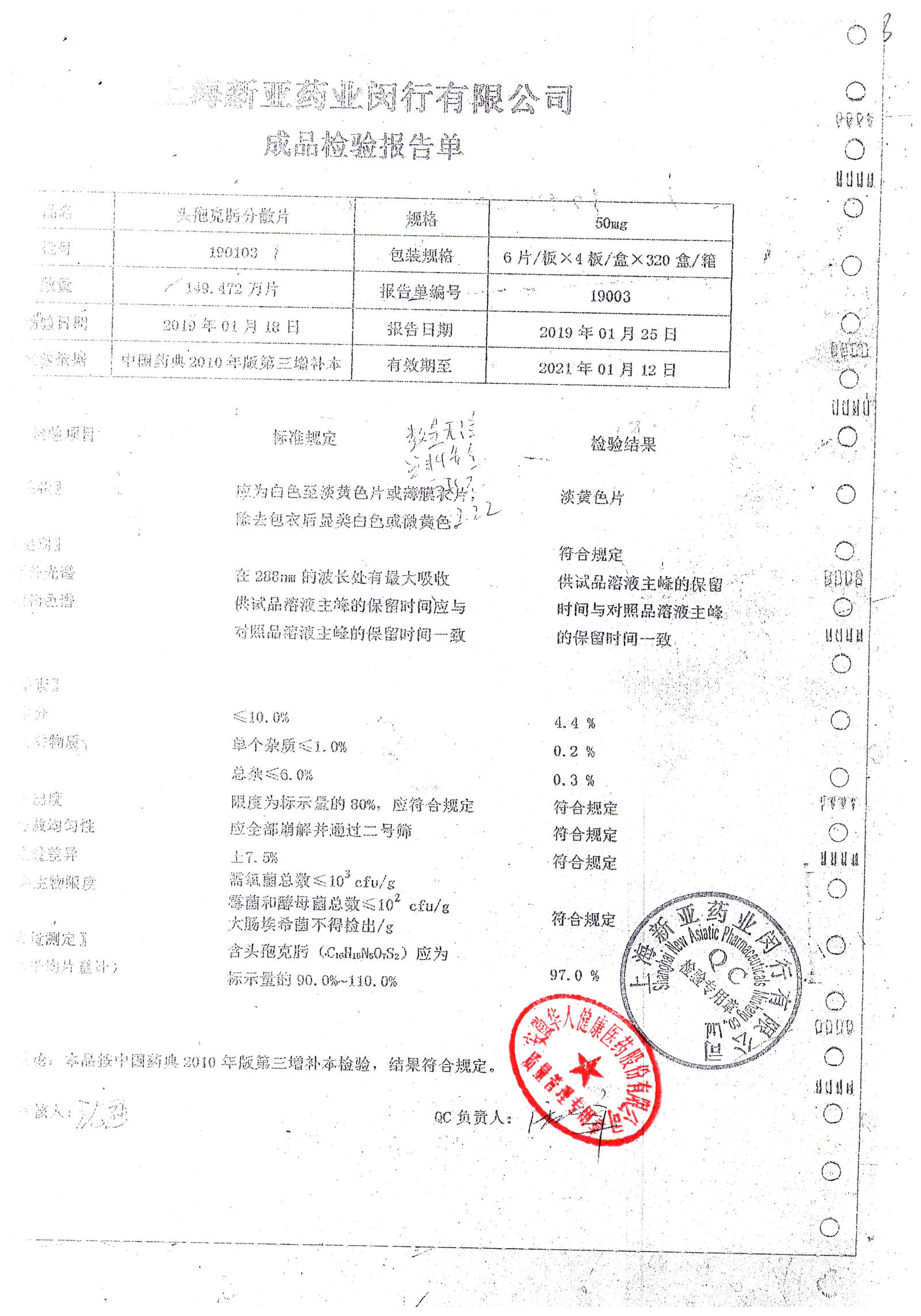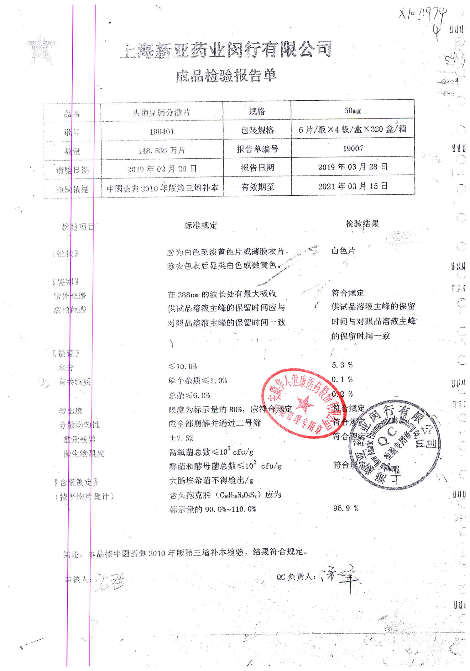 頭孢克肟分散片 | 50mg*24s | 190702 | 查看詳情 |