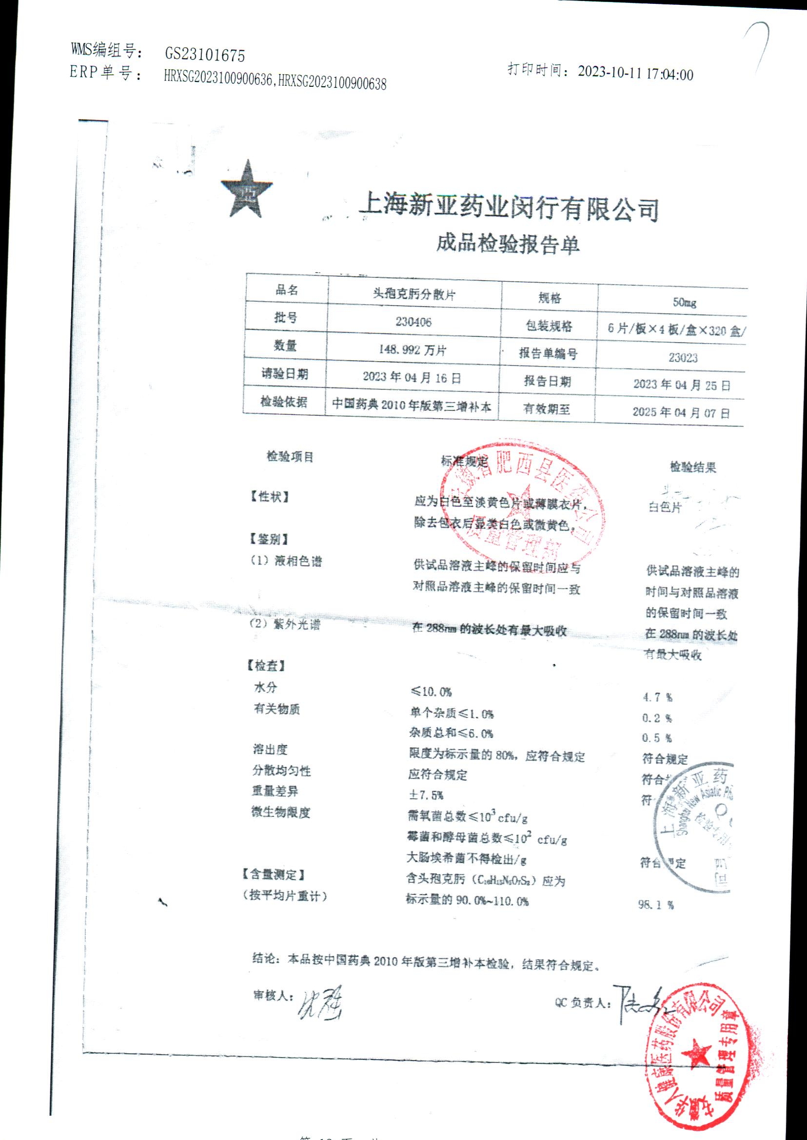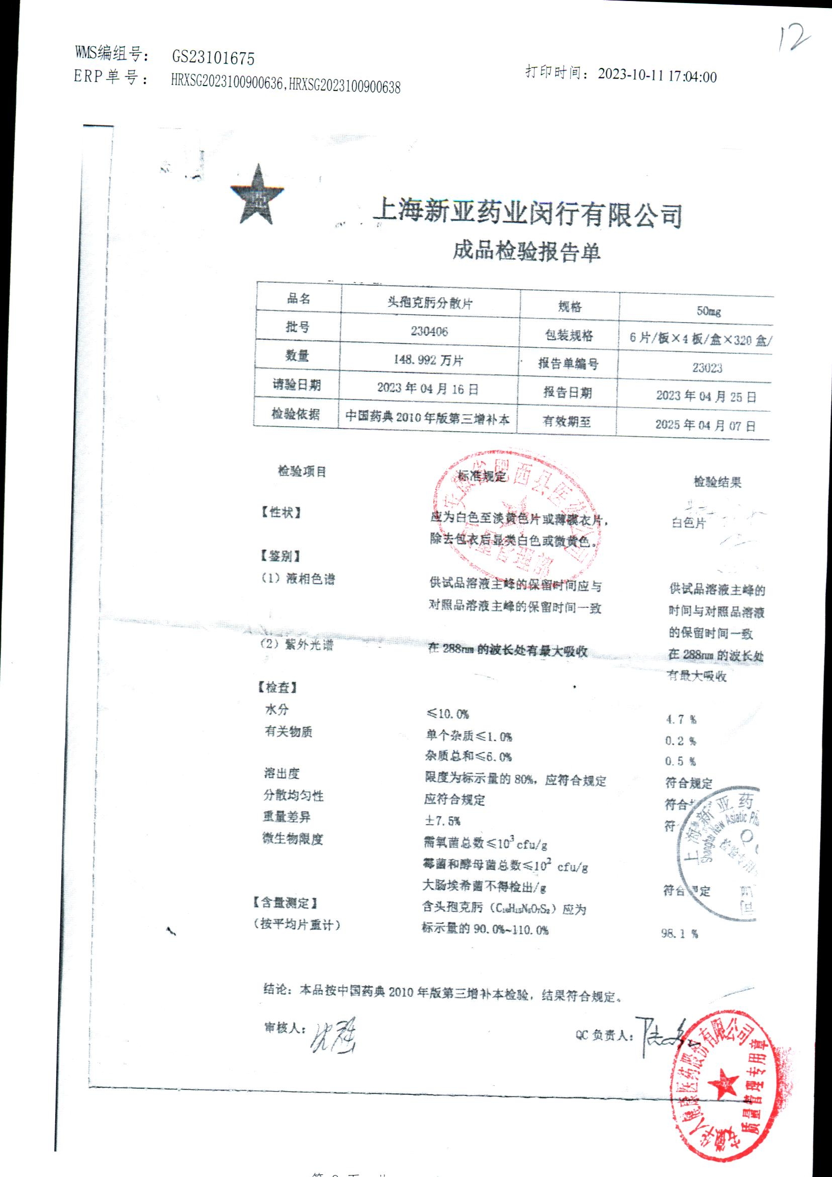 頭孢克肟分散片 | 50mg*24s | 230406 | 查看詳情 |