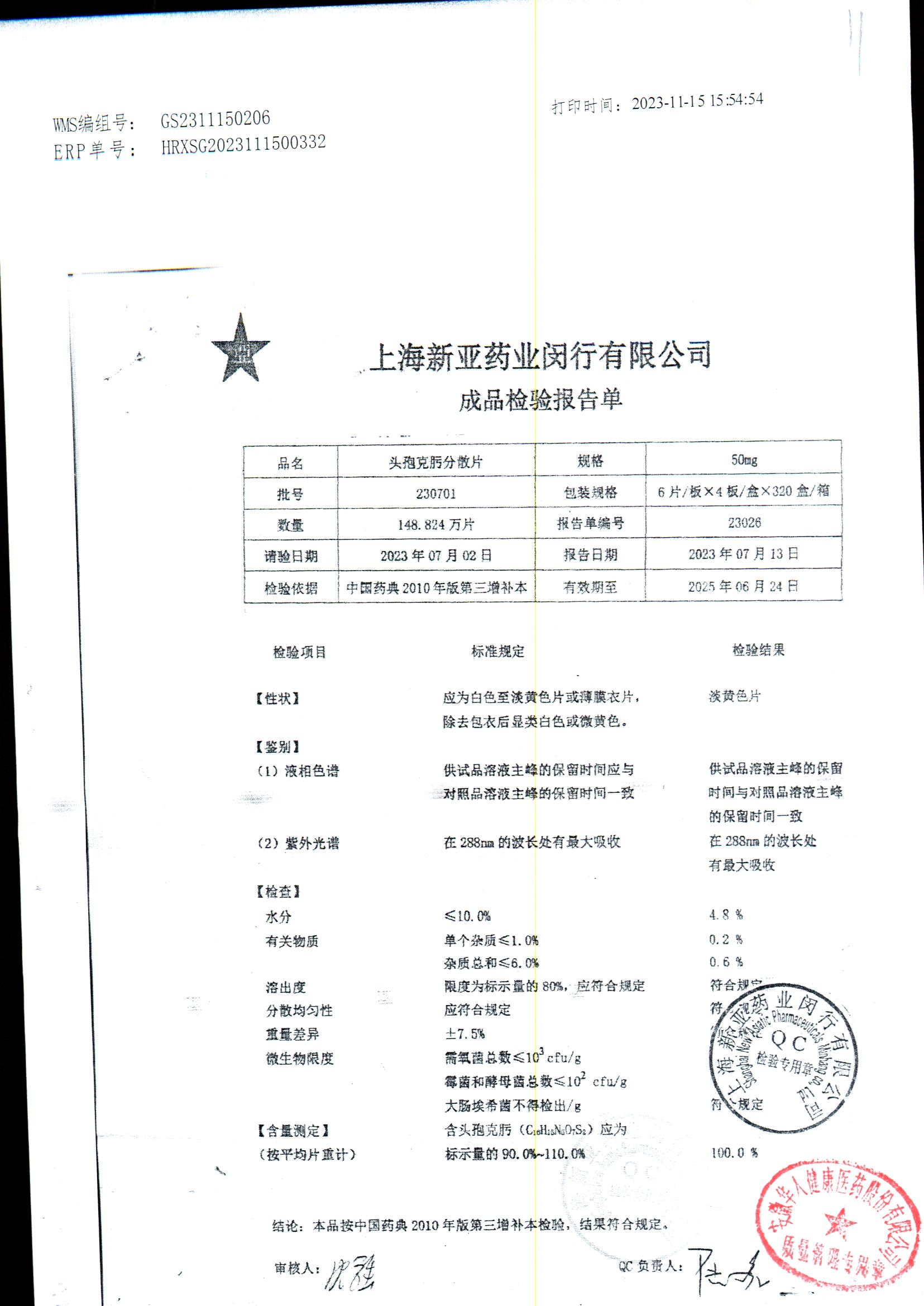 頭孢克肟分散片 | 50mg*24s | 230701 | 查看詳情 |