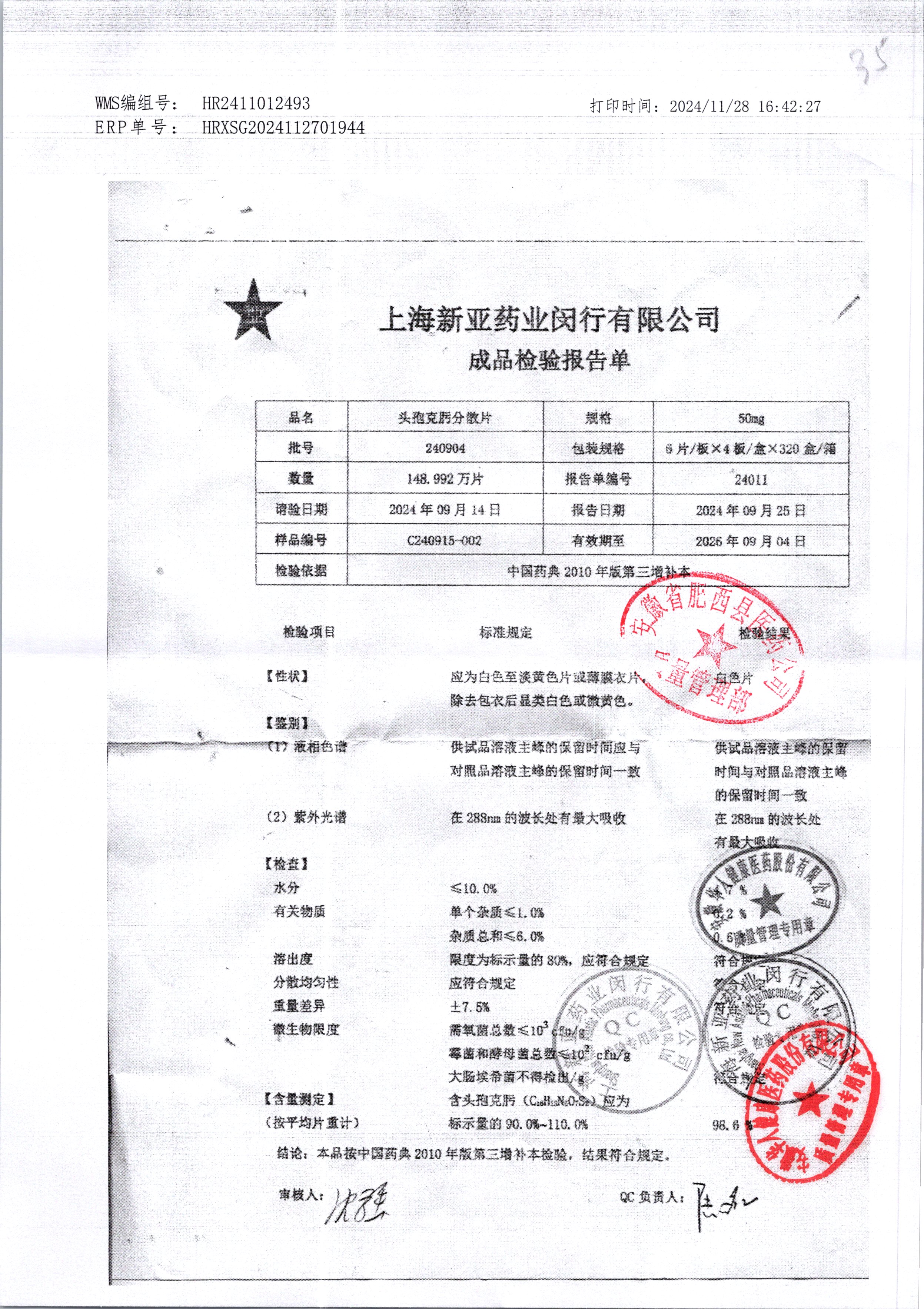 頭孢克肟分散片 | 50mg*24s | 241203 | 查看詳情 |