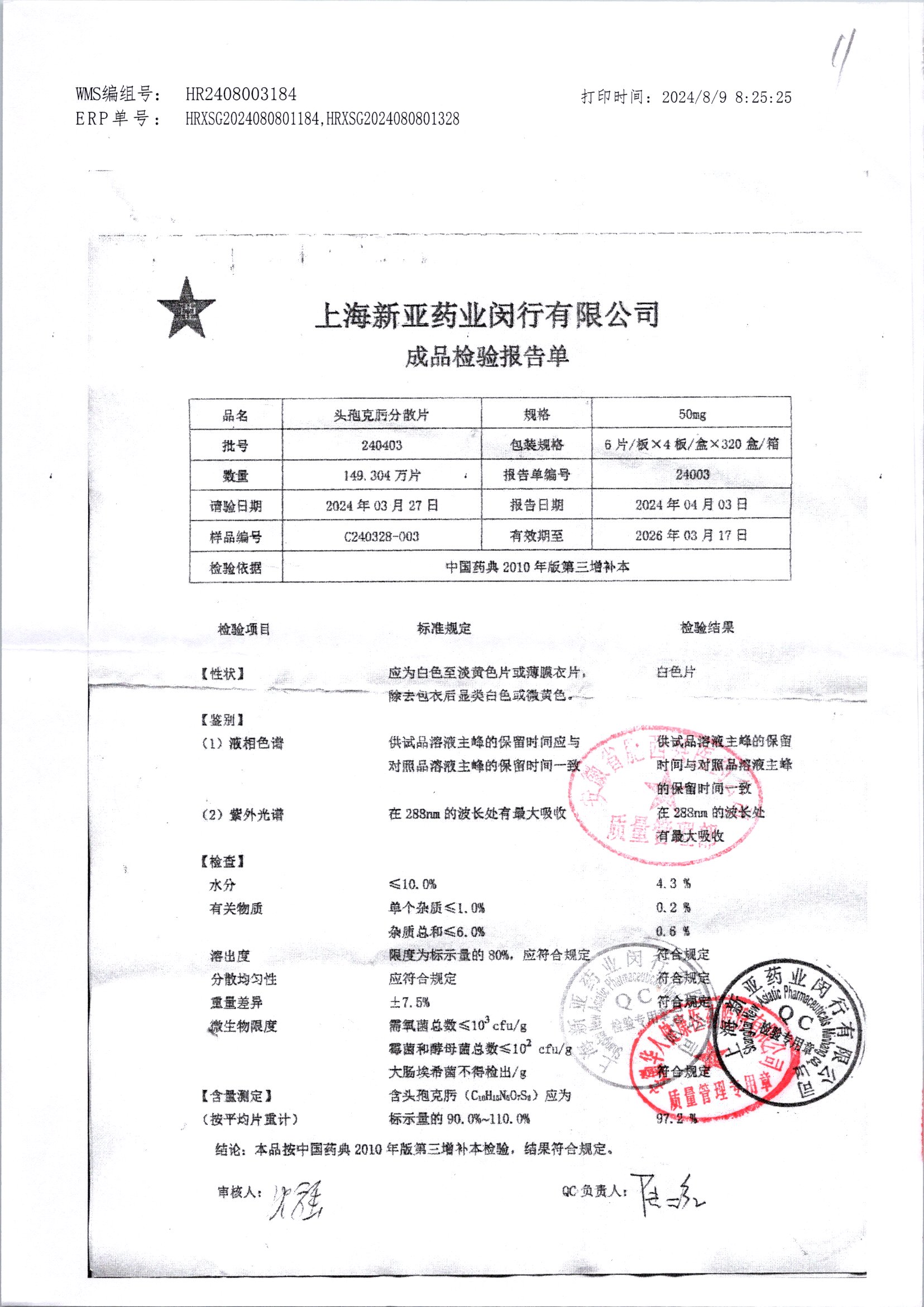 頭孢克肟分散片 | 50mg*24s | 240903 | 查看詳情 |