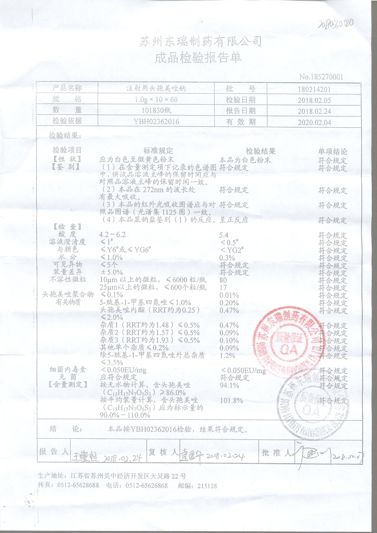 注射用頭孢美唑鈉 | 1g*10*60 | 180214201 | 查看詳情 |
