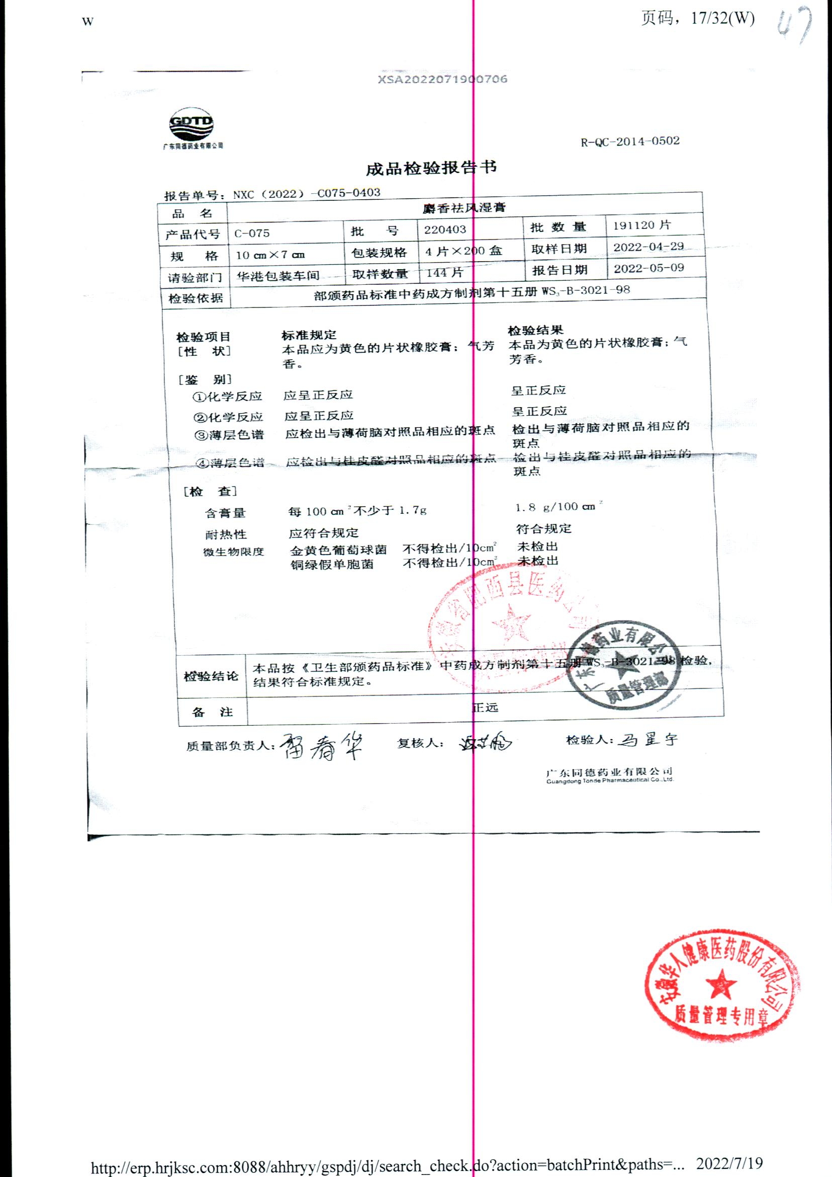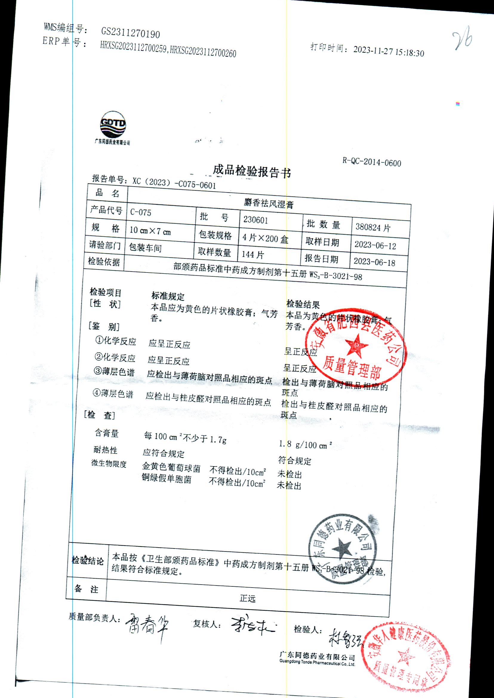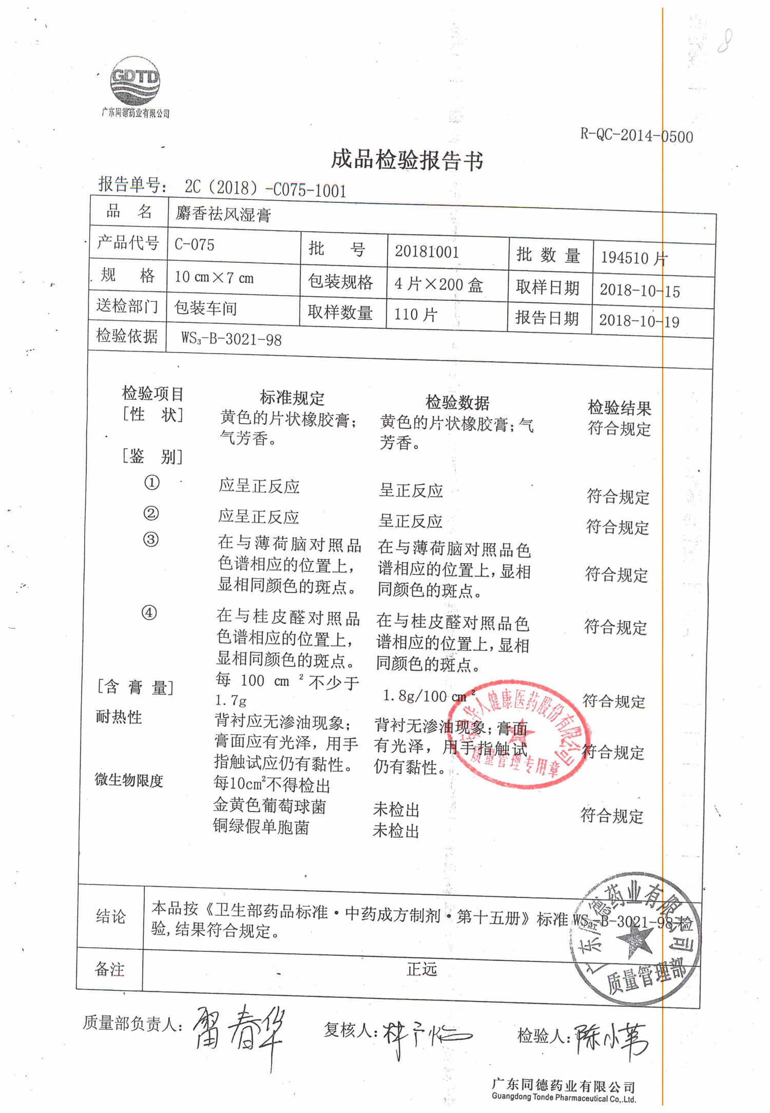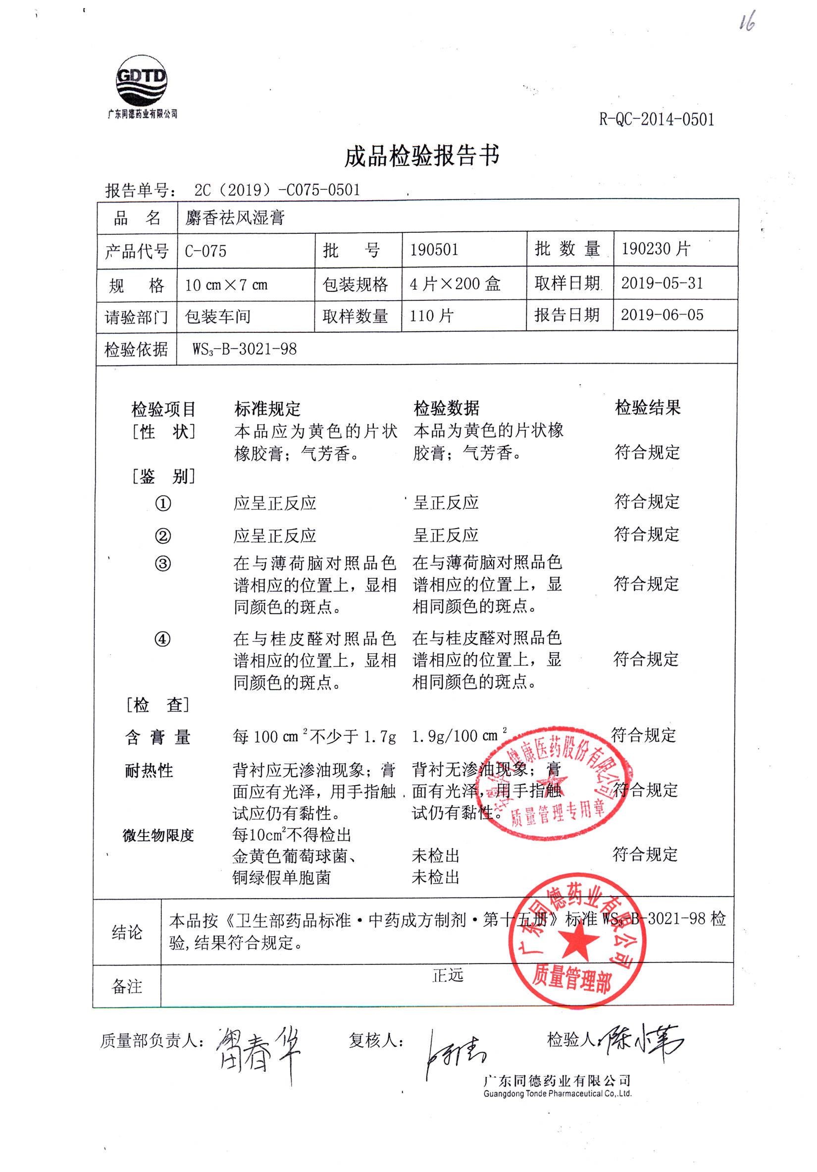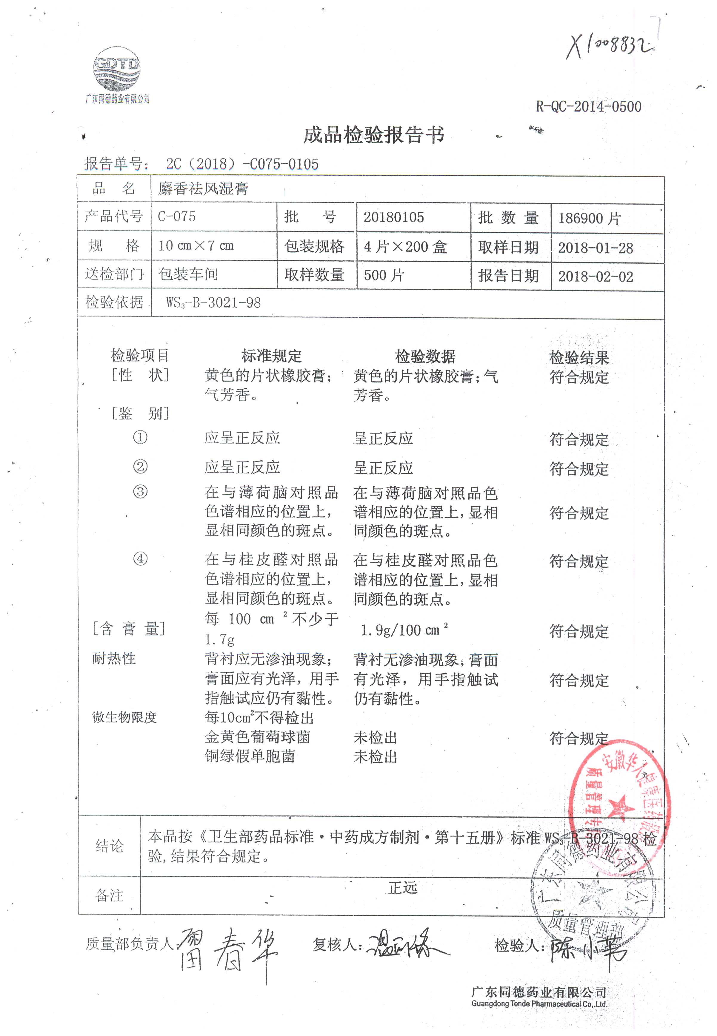 麝香祛風(fēng)濕膏 | 10cm*7cm*4片 | 20180105 | 查看詳情 |