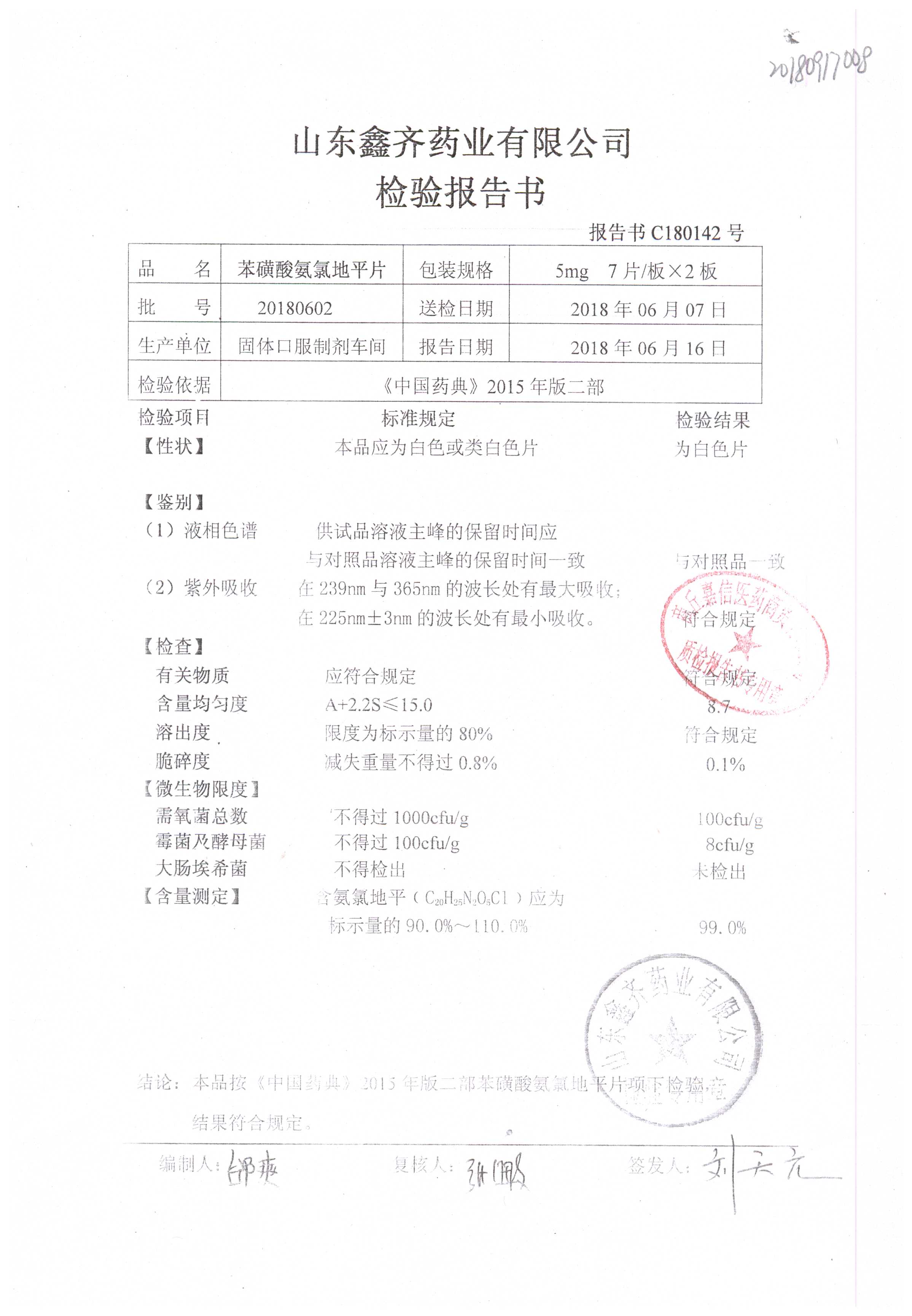 苯磺酸氨氯地平片 | 5mg*14s | 20180602 | 查看詳情 |