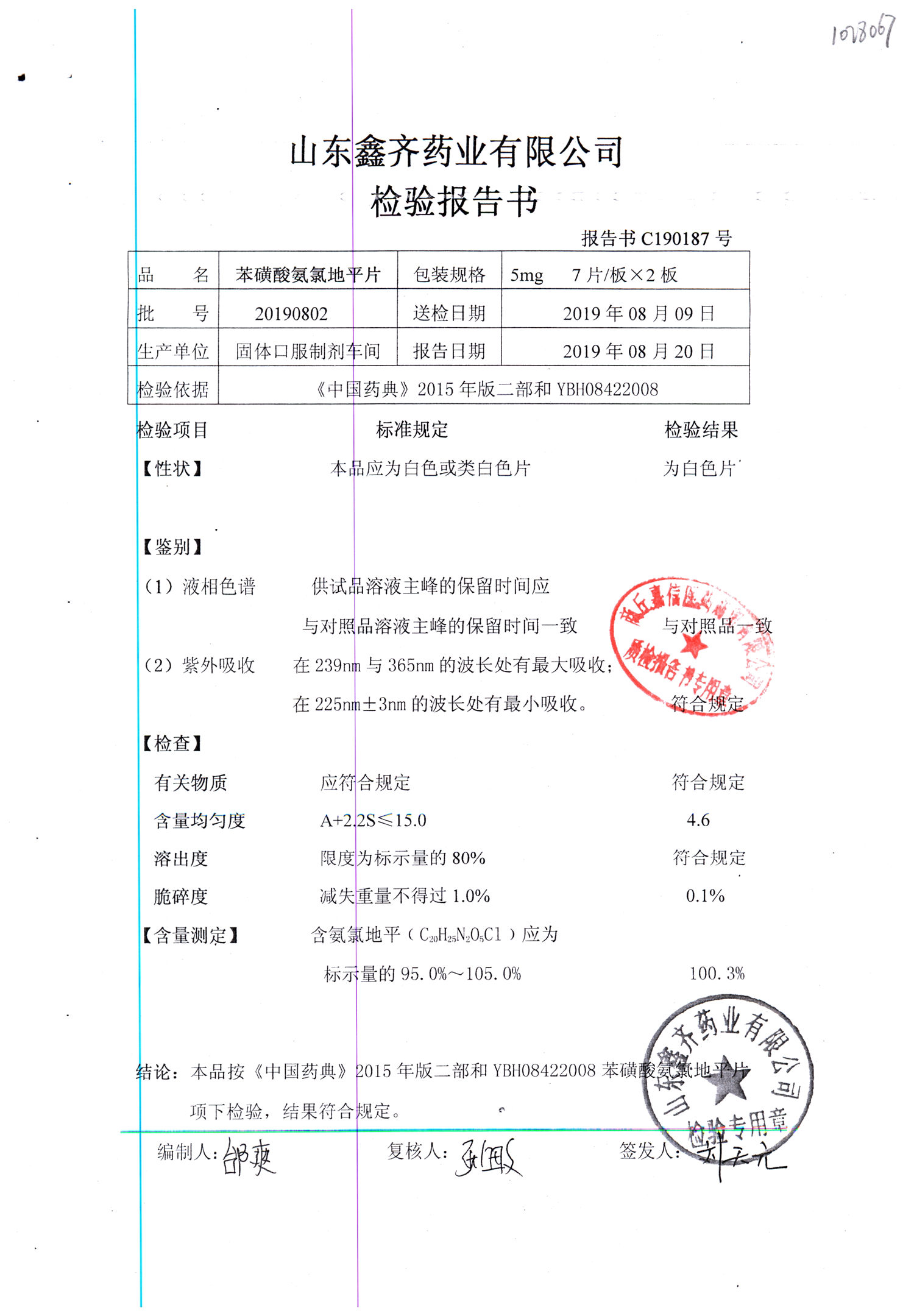 苯磺酸氨氯地平片 | 5mg*14s | 20190802 | 查看詳情 |