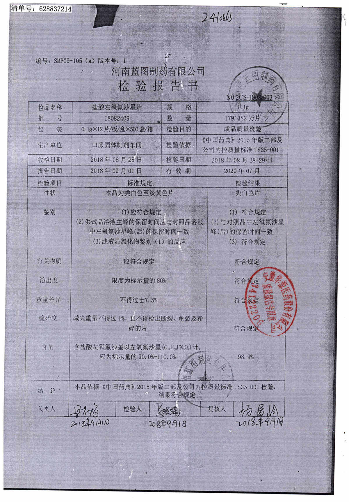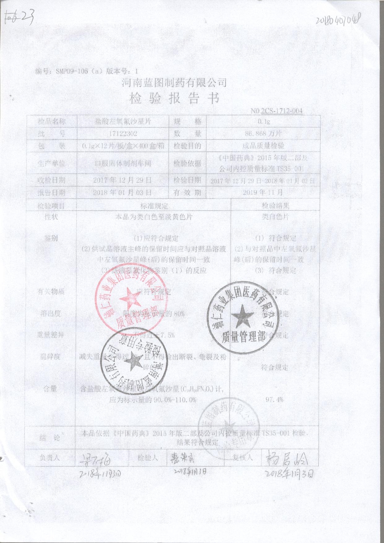 名稱 規(guī)格 批號(hào) 藥檢報(bào)告