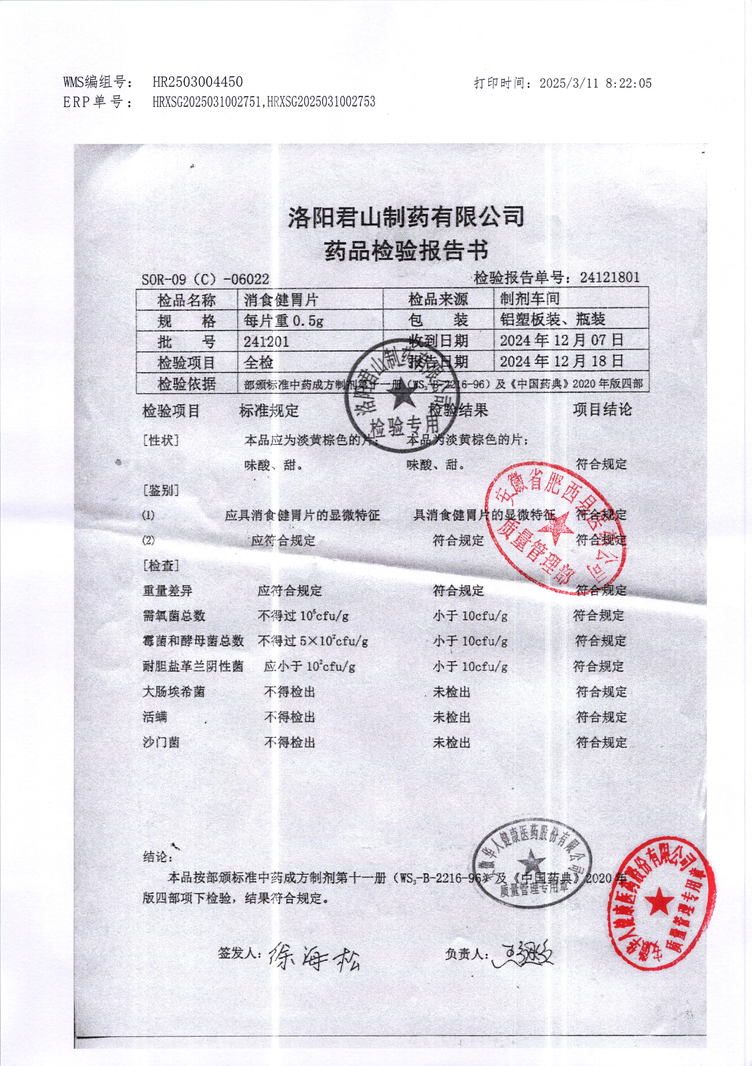 消食健胃片 | 0.5g | 250405 | 查看詳情 |